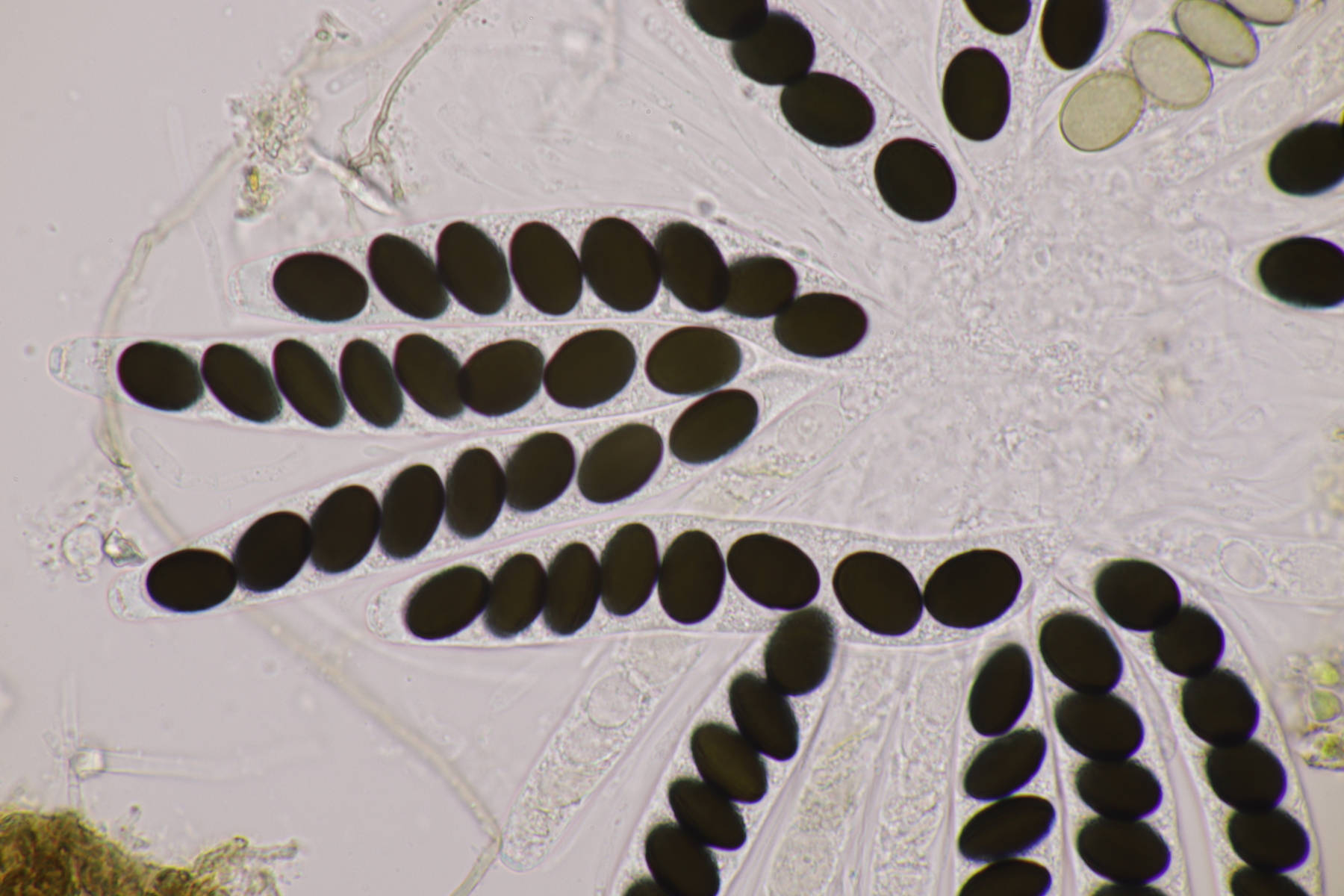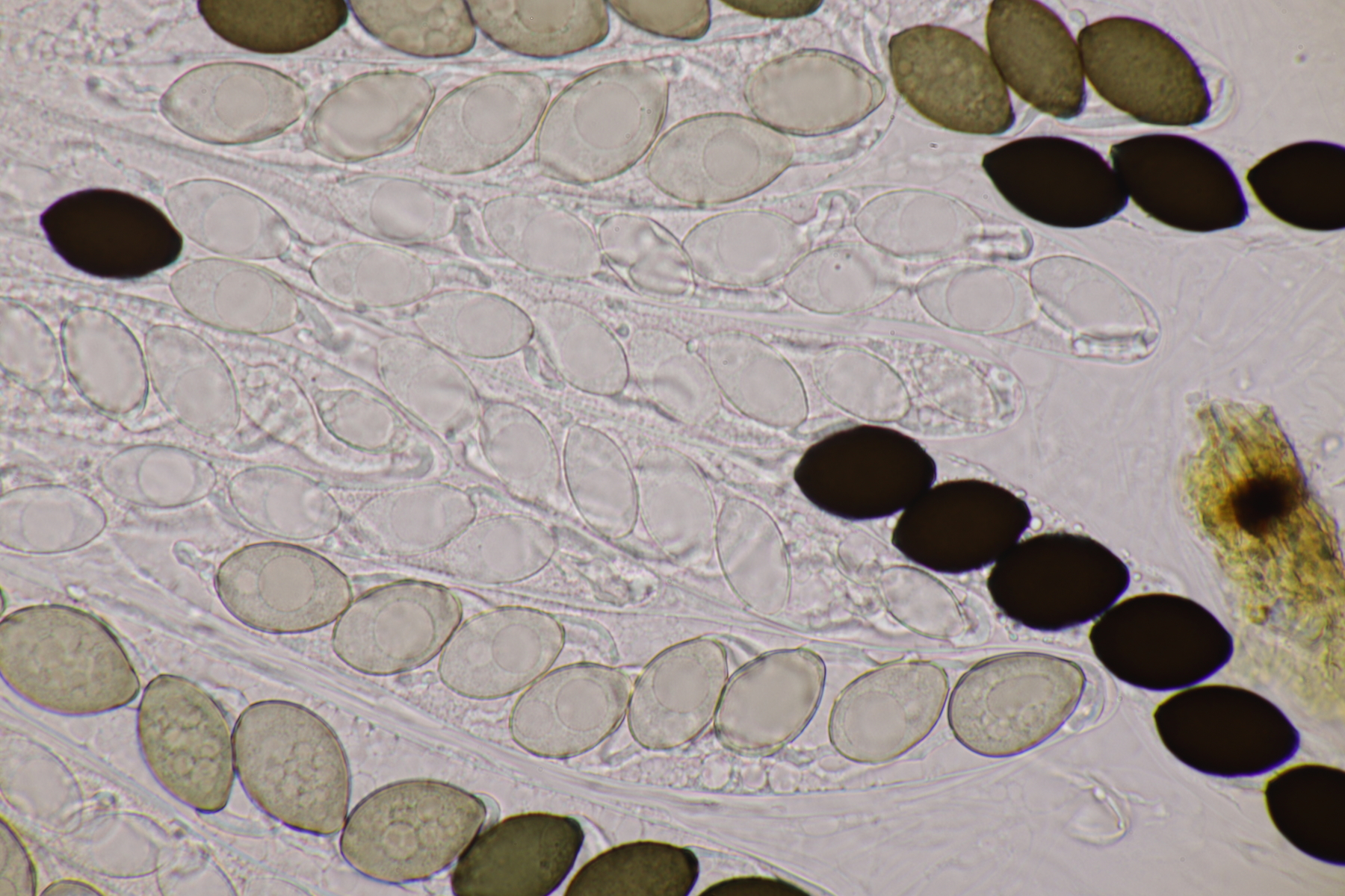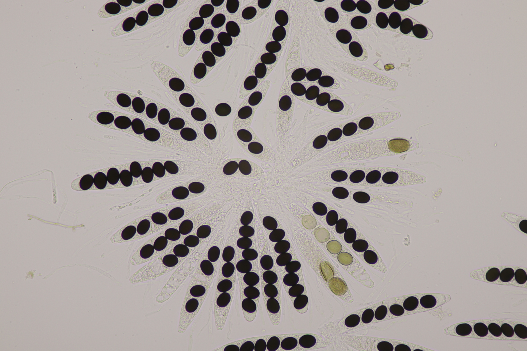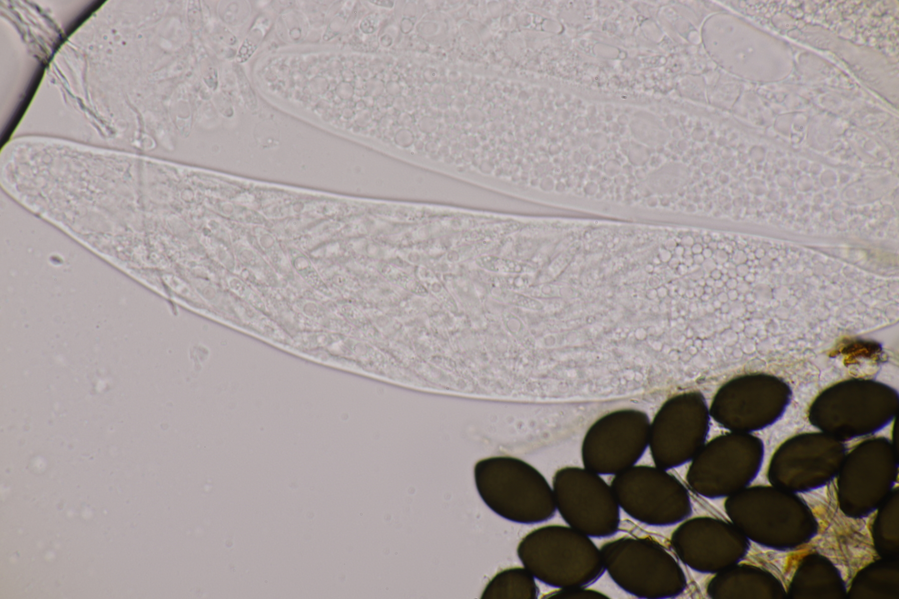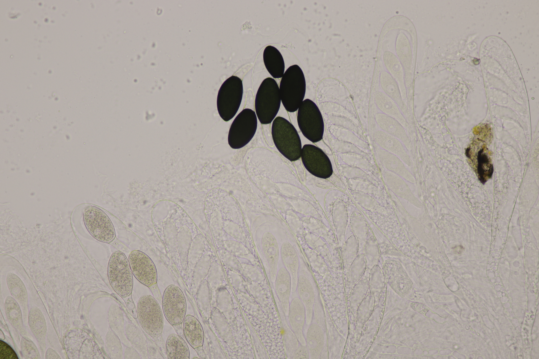II.3 Nochmal ein Saccobolus, diesmal makroskopisch etwas kompakter. Sporencluster ca 35 x 12 µm, Sporen messen 12-13 µm x 6 µm. Das würde dann schon deutlicher zu S. depauperatus tendieren.