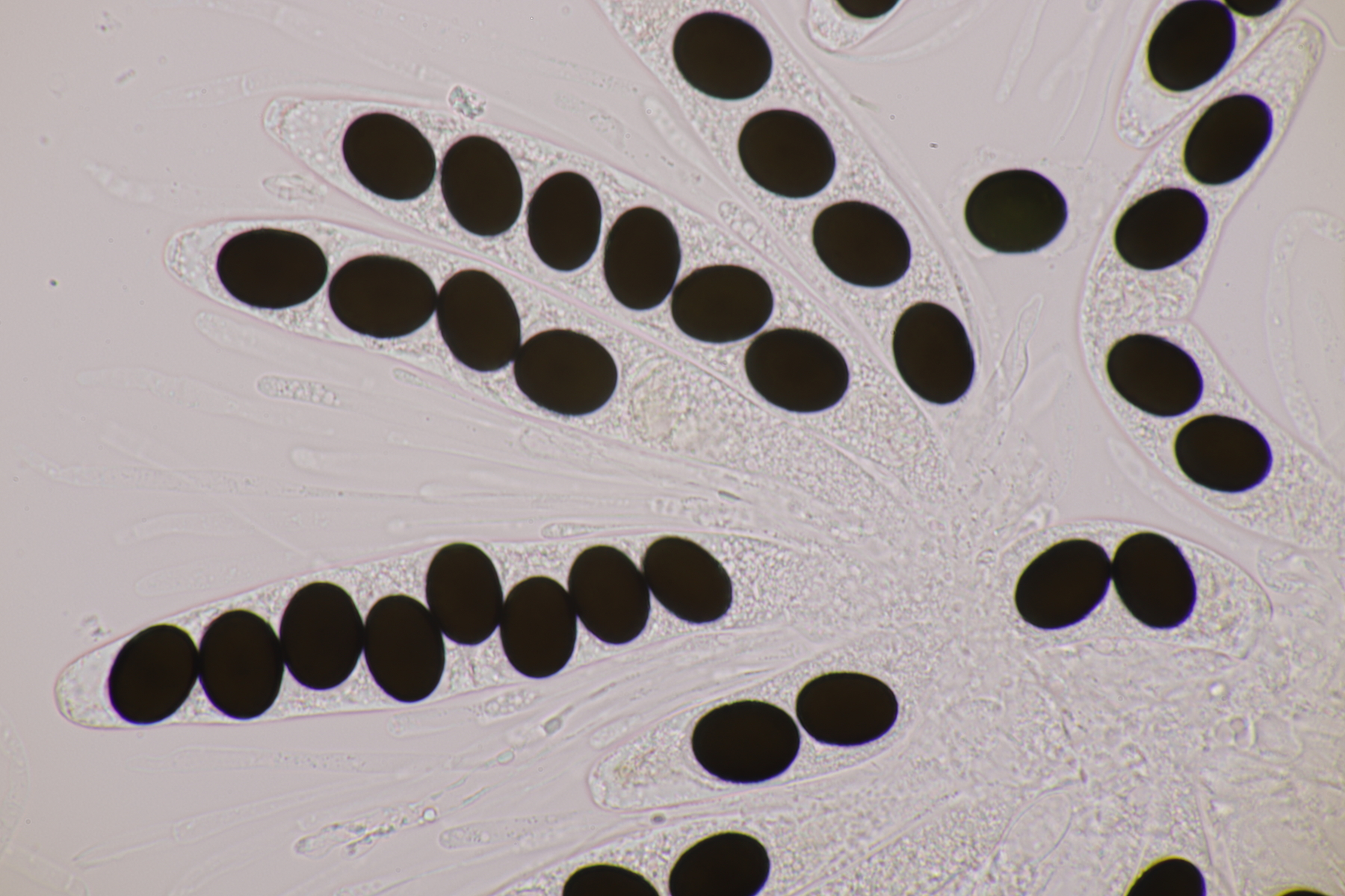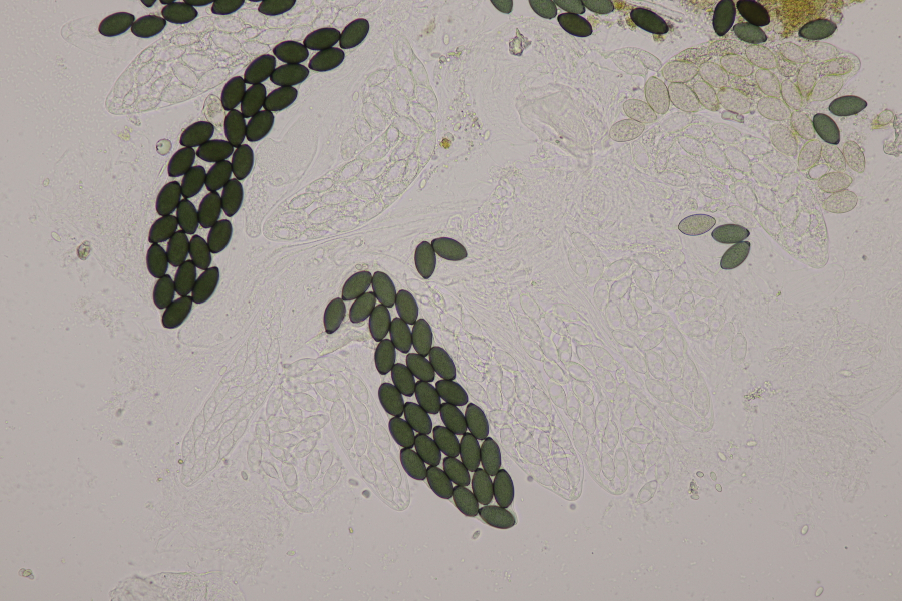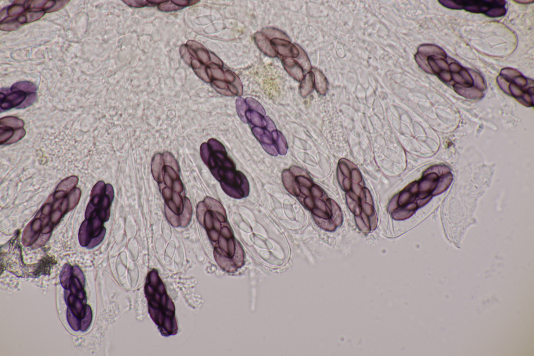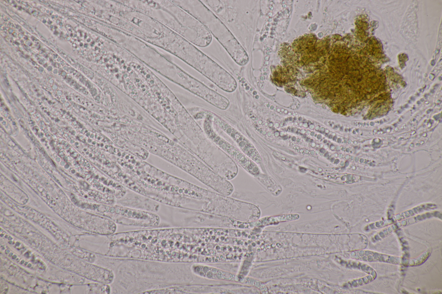II.3 Nochmal ein Saccobolus, diesmal makroskopisch etwas kompakter. Sporencluster ca 35 x 12 µm, Sporen messen 12-13 µm x 6 µm. Das würde dann schon deutlicher zu S. depauperatus tendieren.