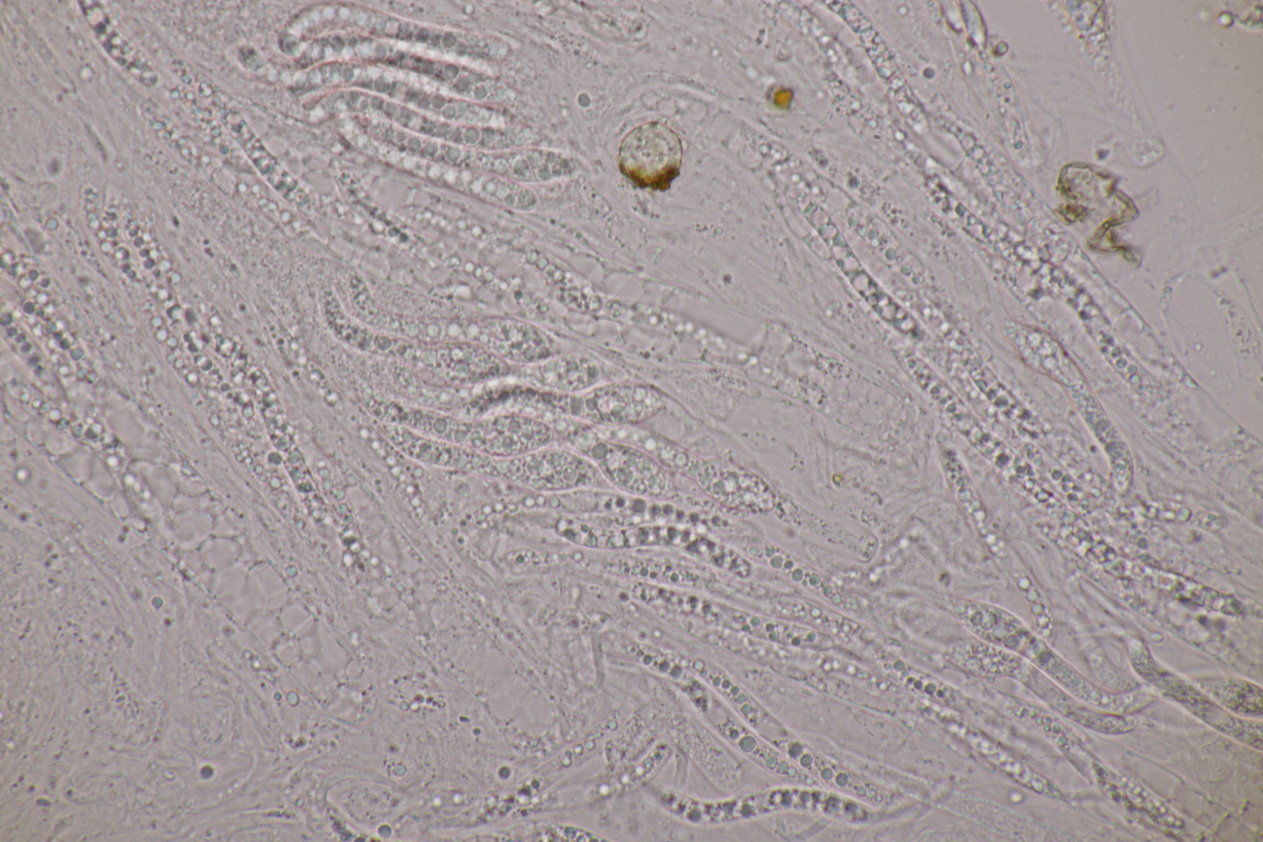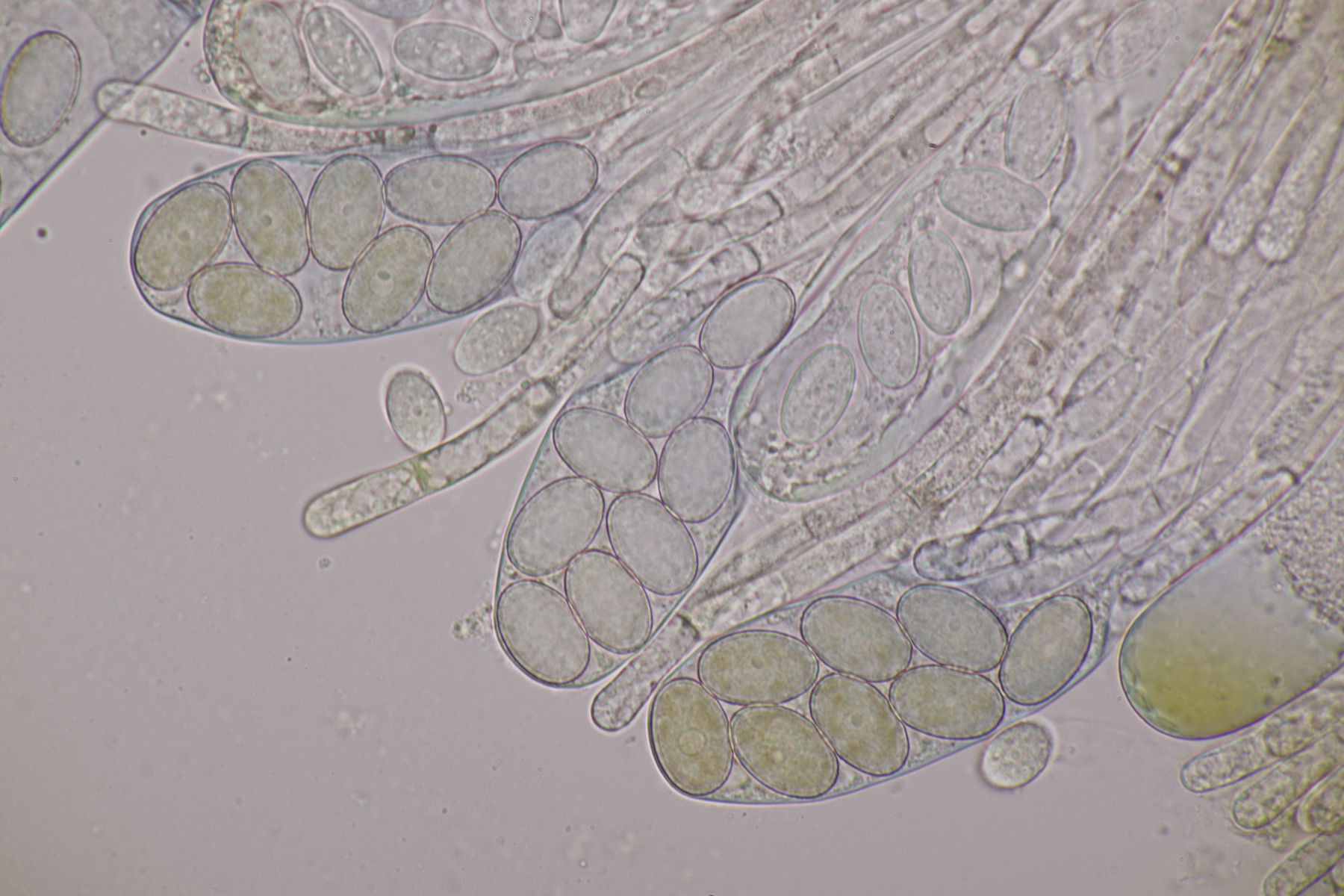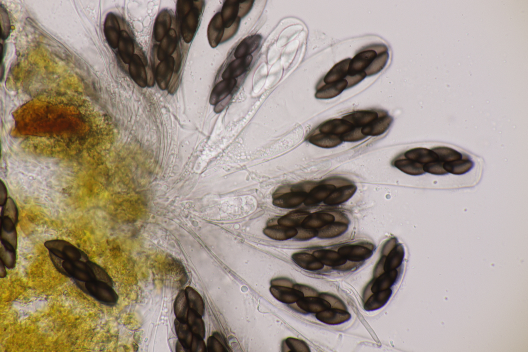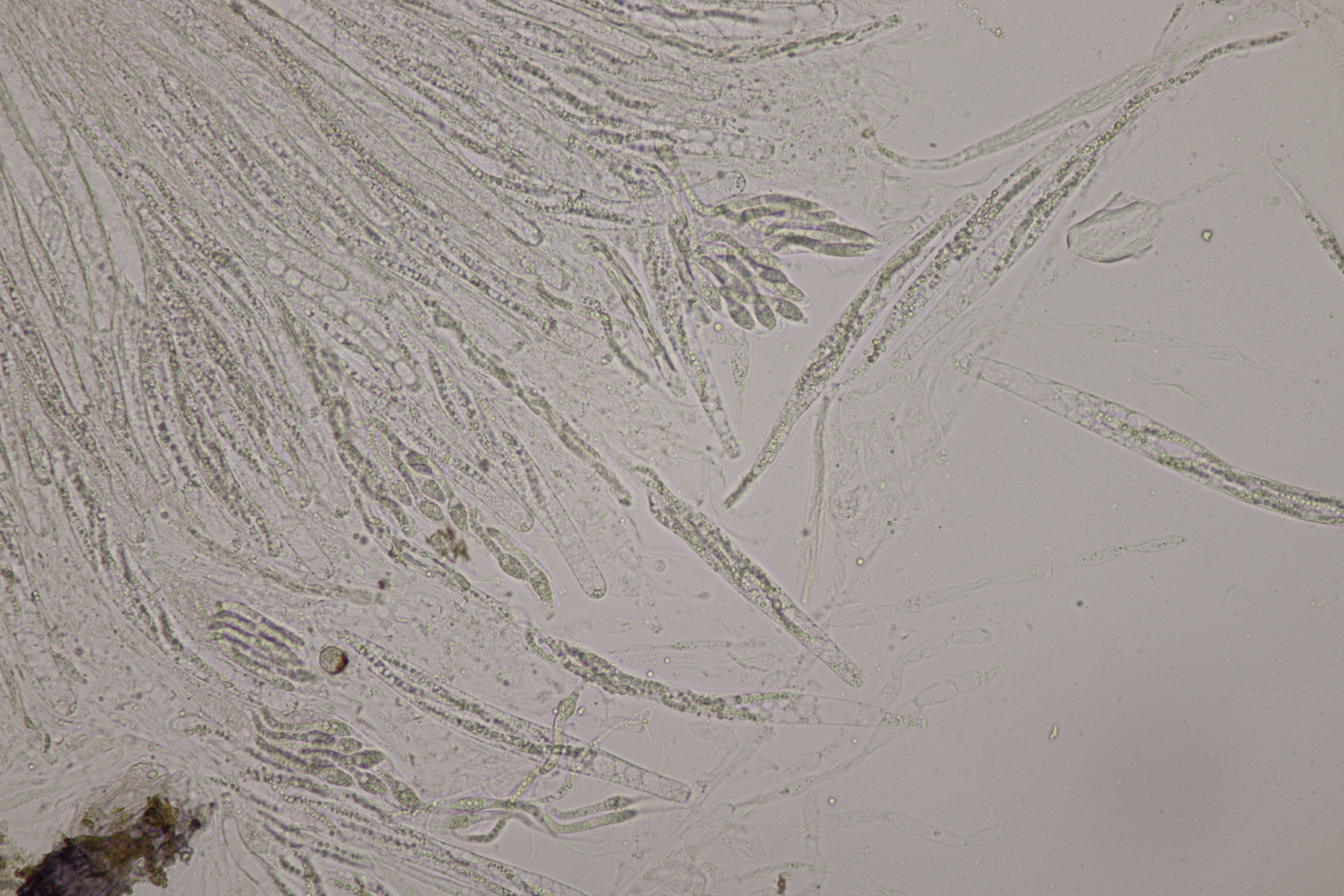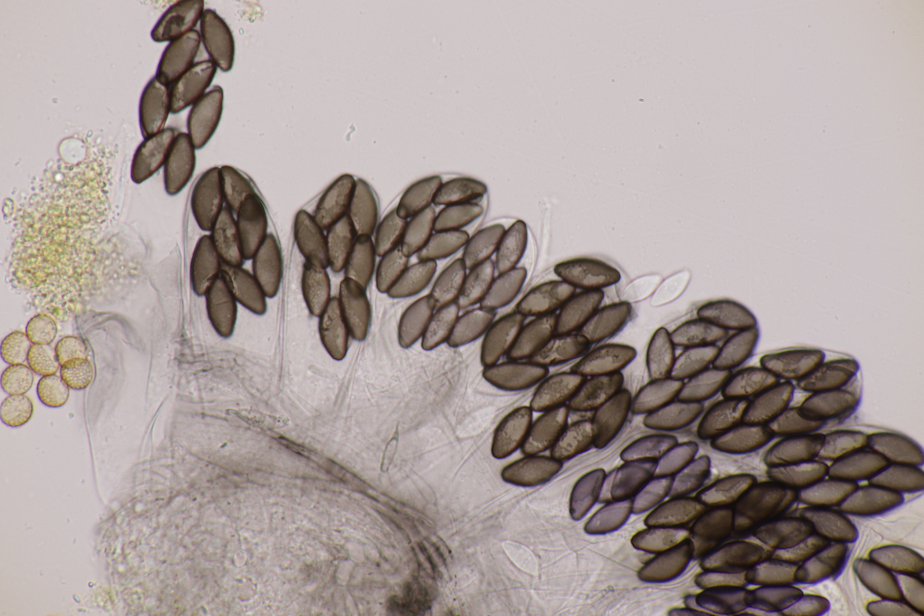 II.3 Nochmal ein Saccobolus, diesmal makroskopisch etwas kompakter. Sporencluster ca 35 x 12 µm, Sporen messen 12-13 µm x 6 µm. Das würde dann schon deutlicher zu S. depauperatus tendieren.