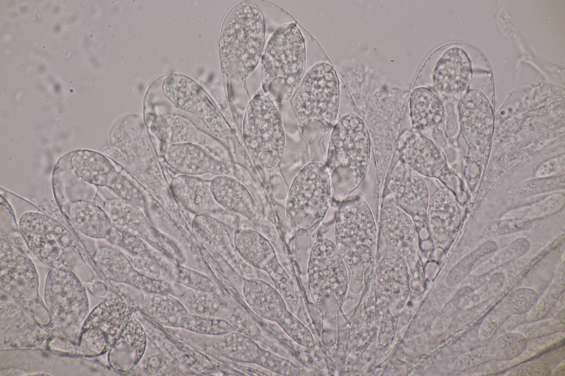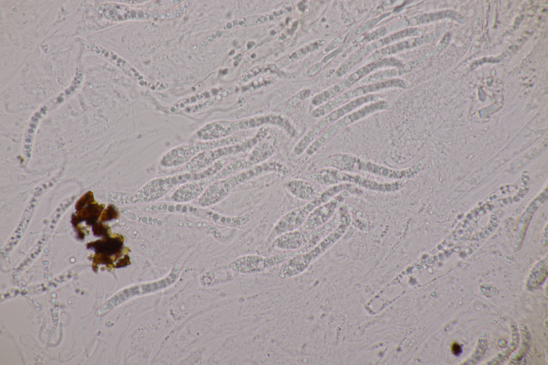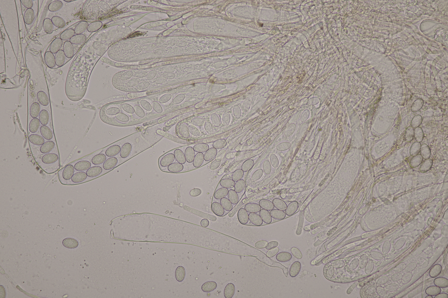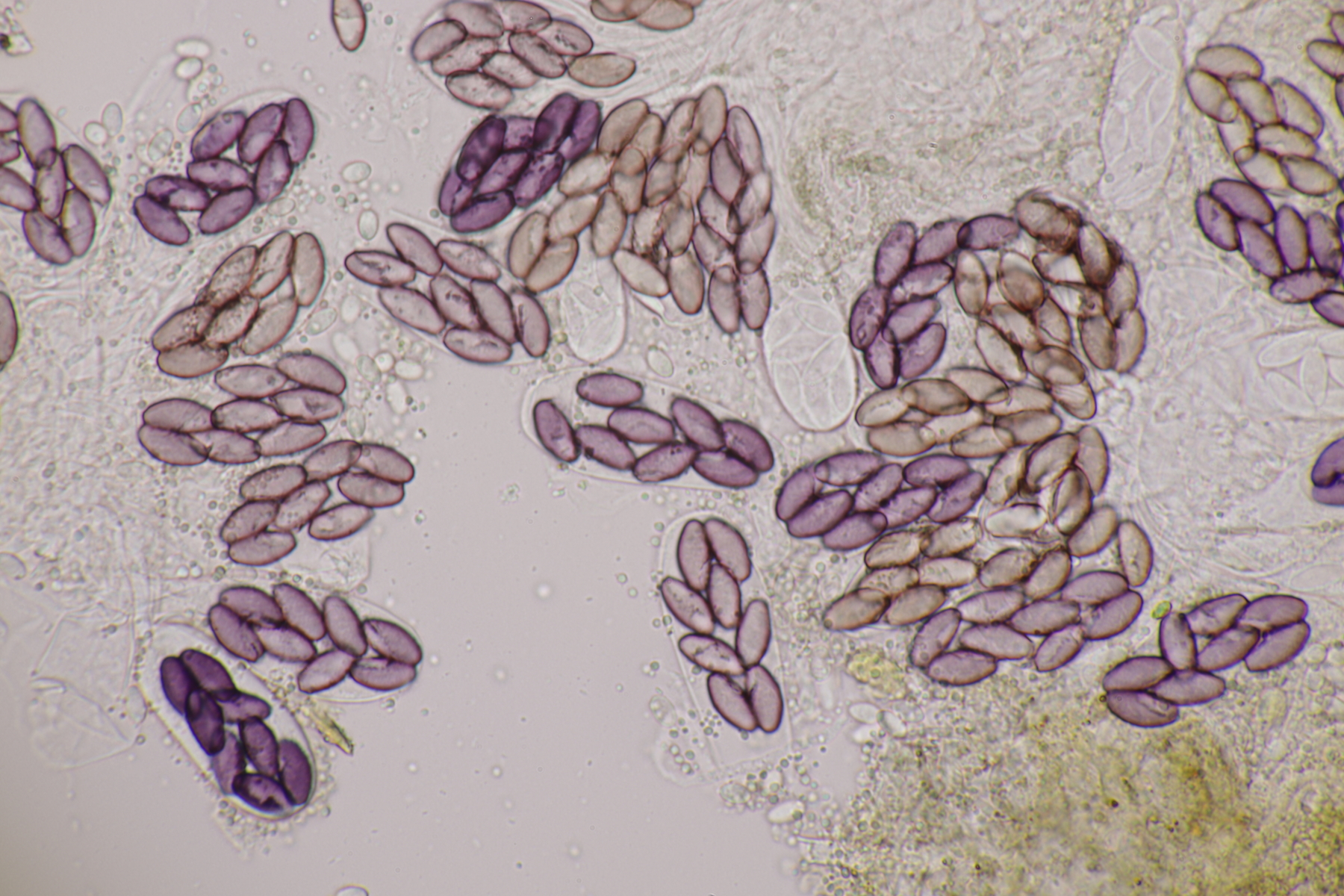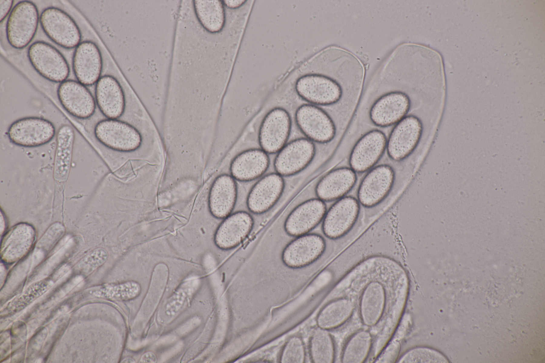 II.3 Nochmal ein Saccobolus, diesmal makroskopisch etwas kompakter. Sporencluster ca 35 x 12 µm, Sporen messen 12-13 µm x 6 µm. Das würde dann schon deutlicher zu S. depauperatus tendieren.