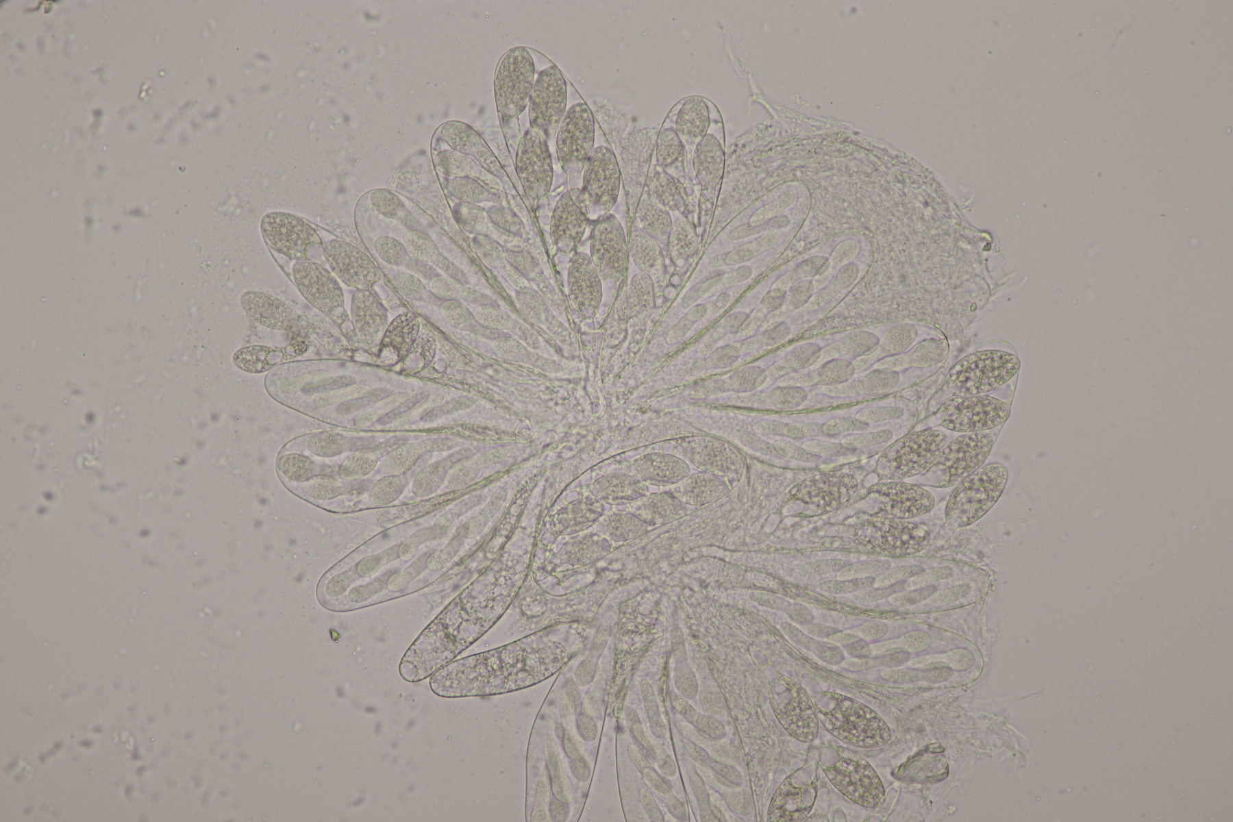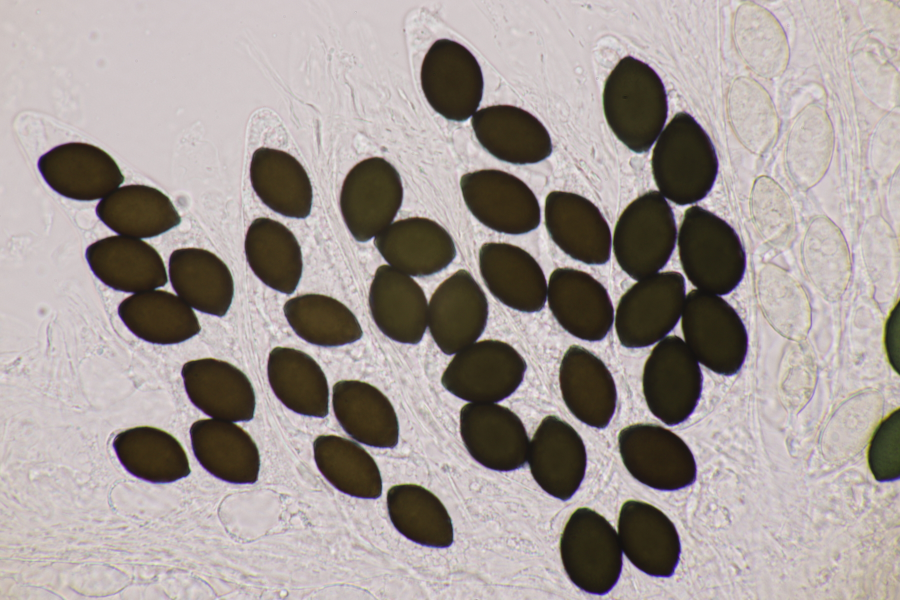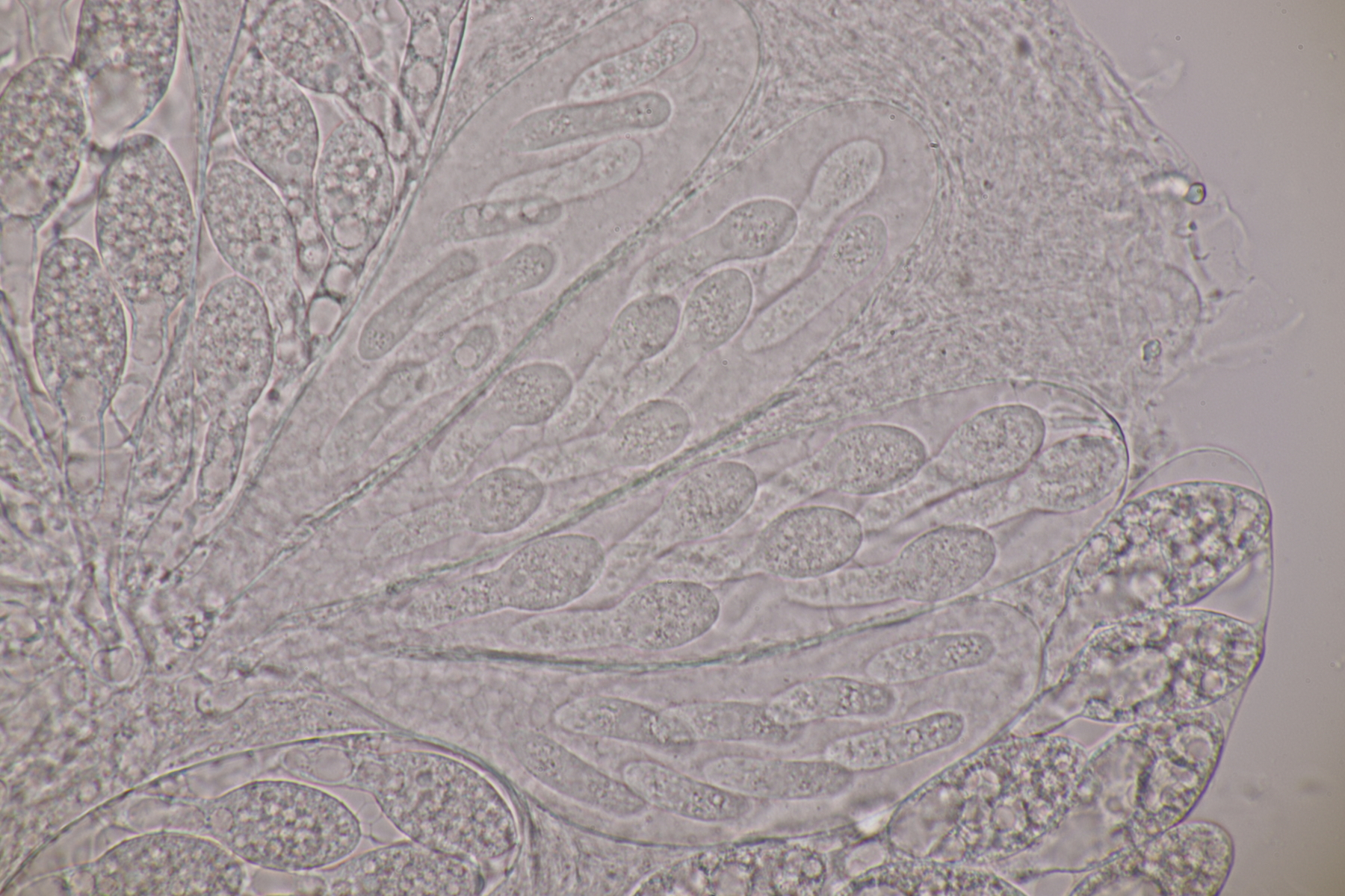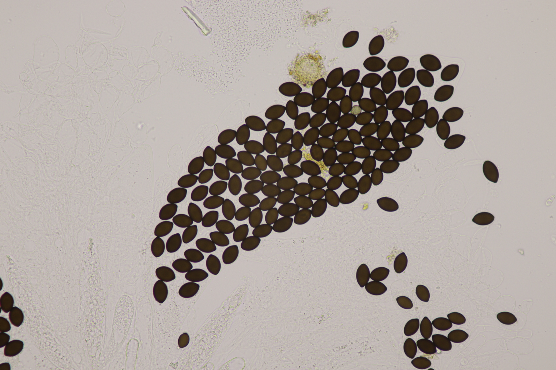 II.3 Nochmal ein Saccobolus, diesmal makroskopisch etwas kompakter. Sporencluster ca 35 x 12 µm, Sporen messen 12-13 µm x 6 µm. Das würde dann schon deutlicher zu S. depauperatus tendieren.