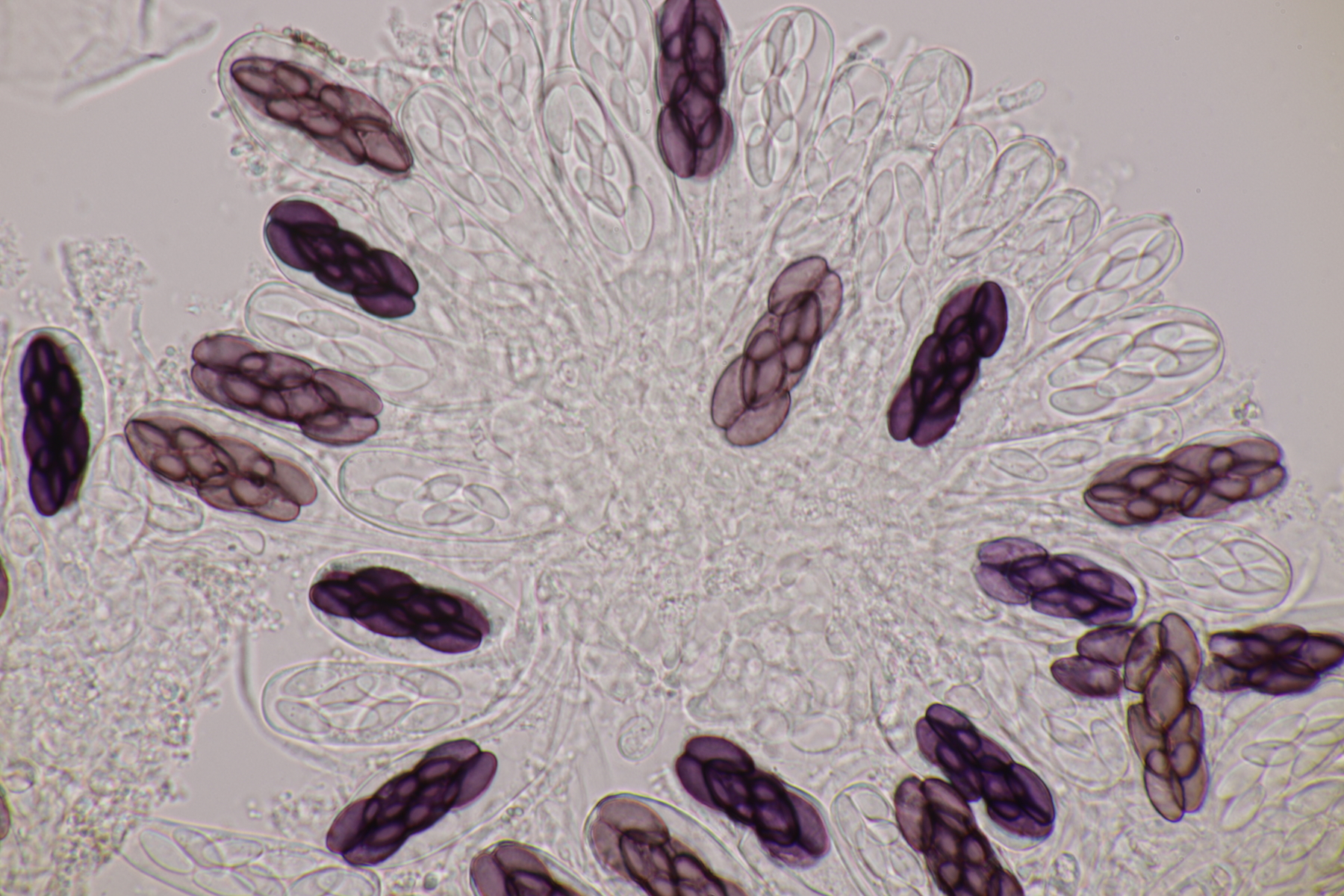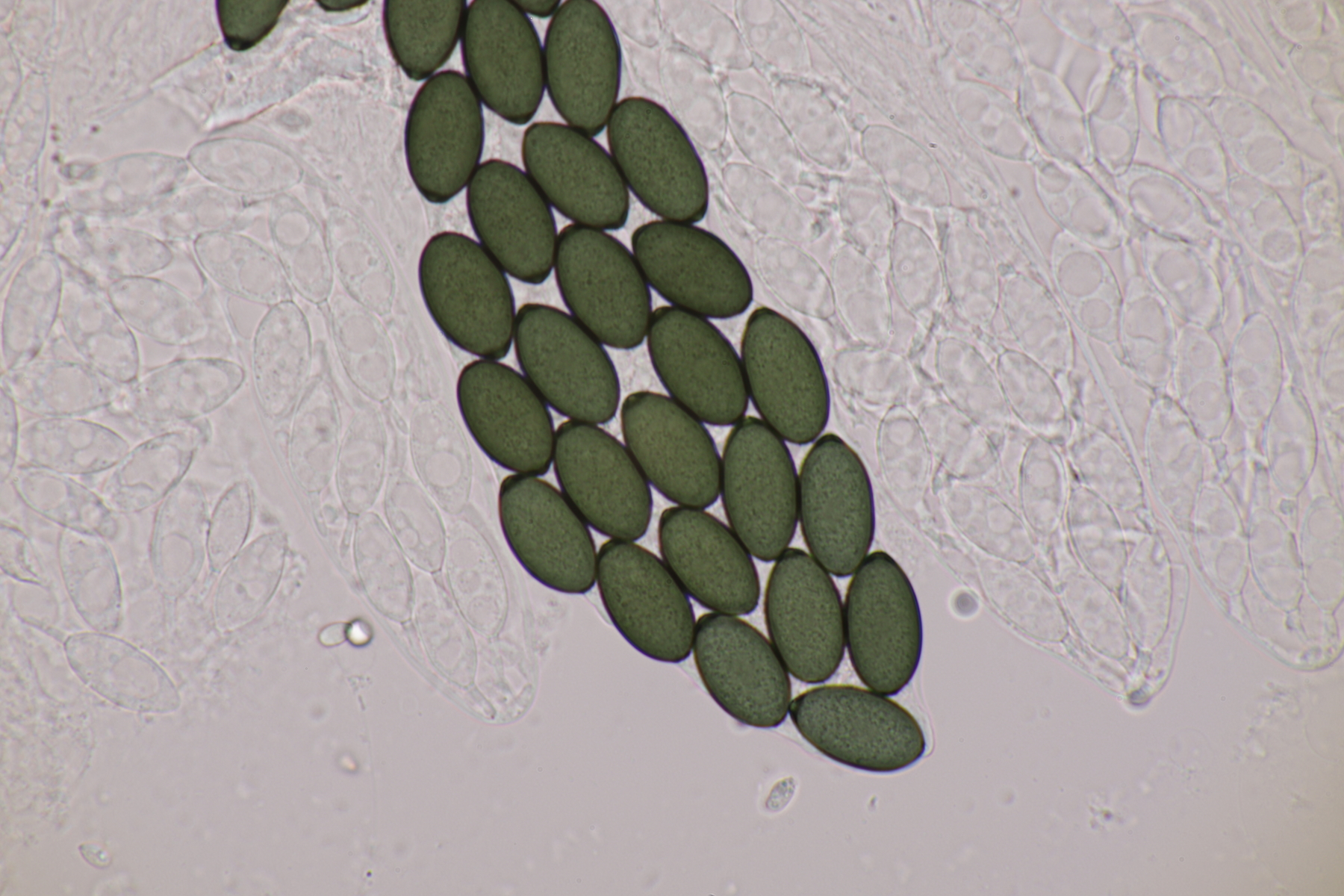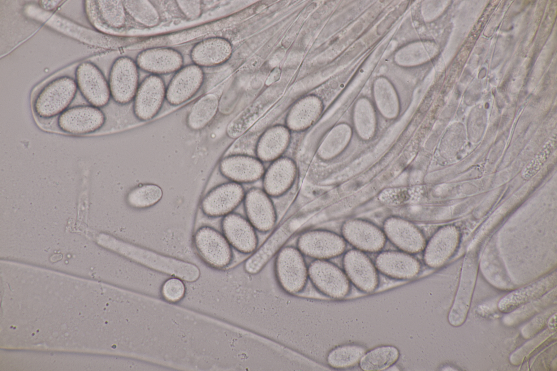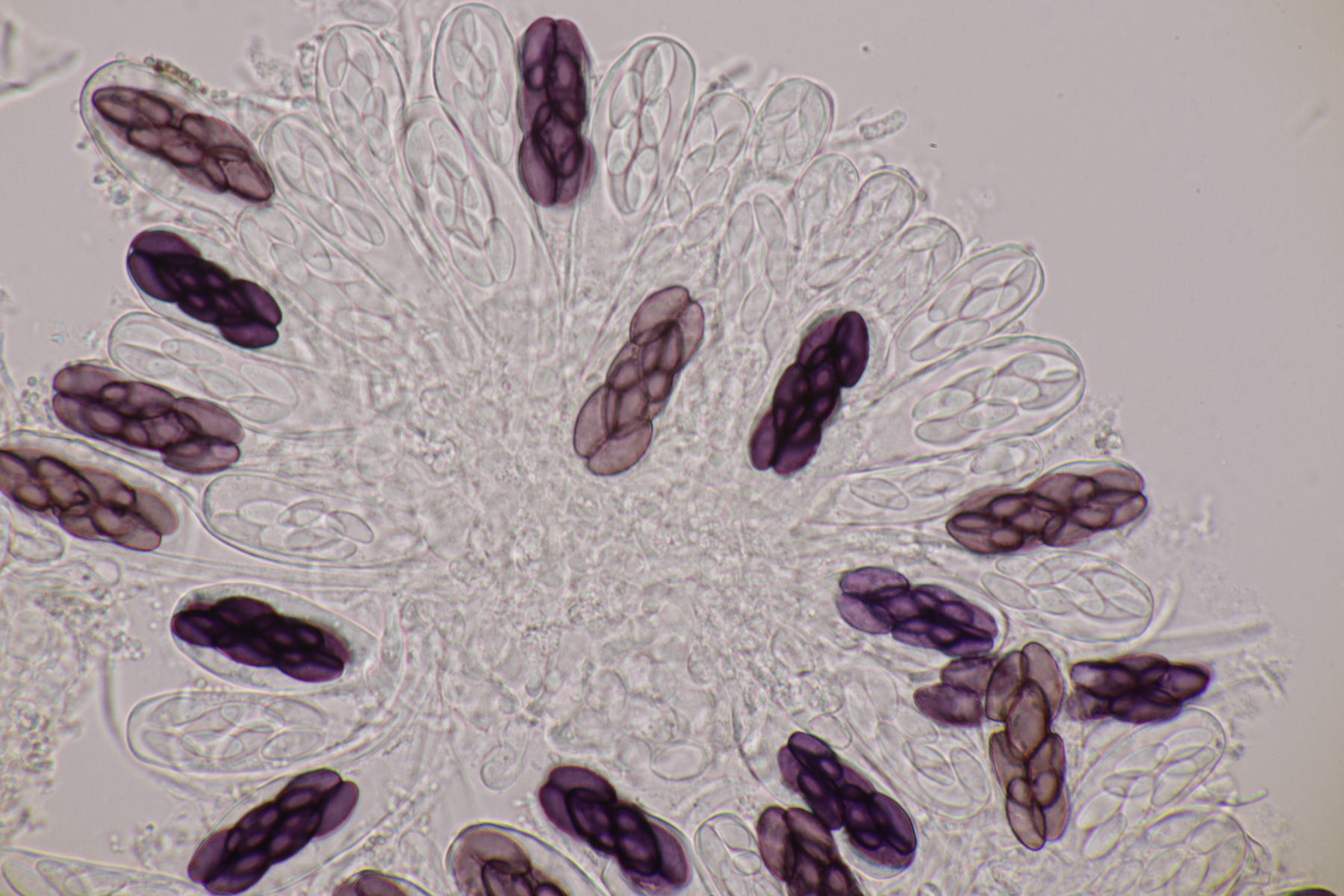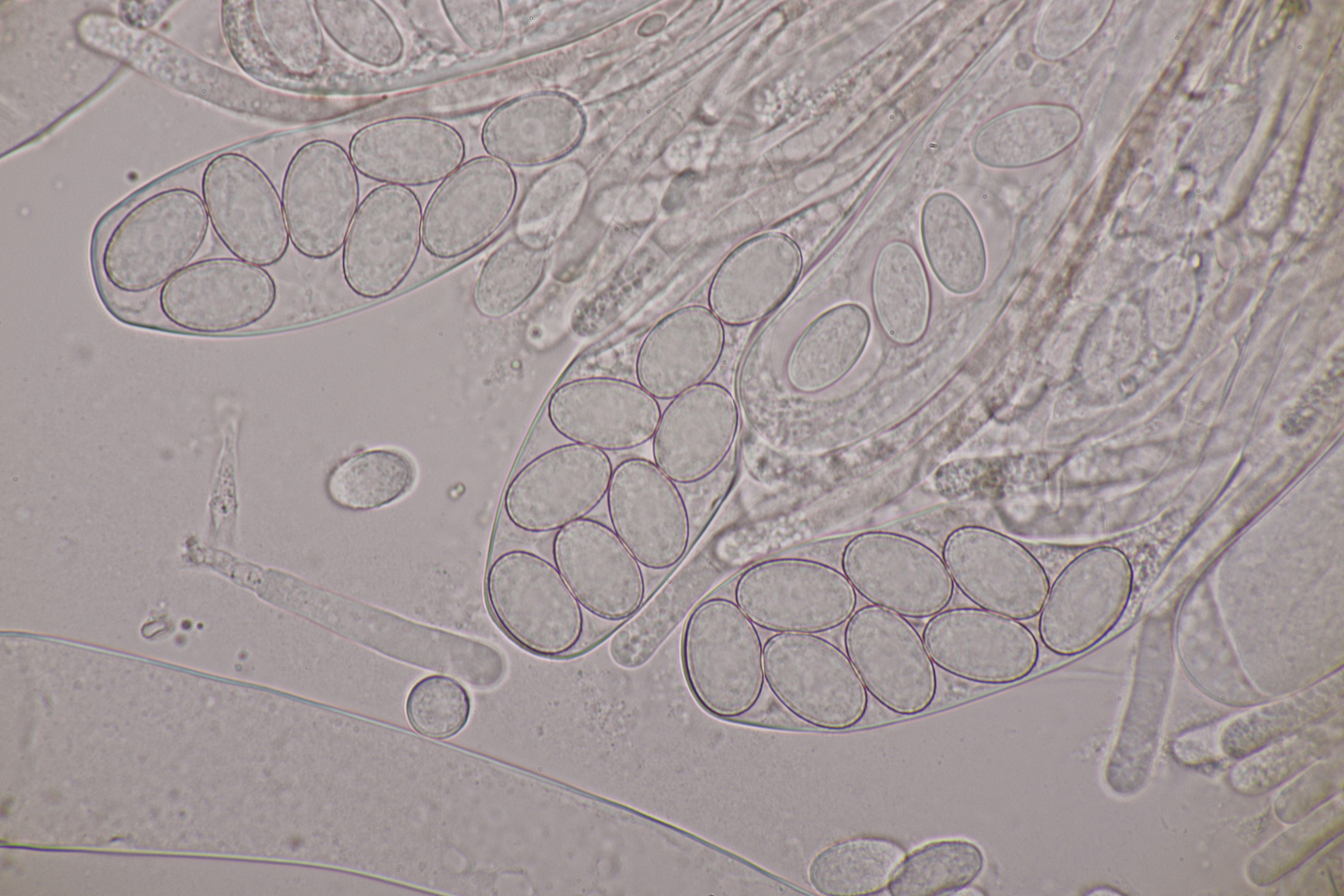 II.3 Nochmal ein Saccobolus, diesmal makroskopisch etwas kompakter. Sporencluster ca 35 x 12 µm, Sporen messen 12-13 µm x 6 µm. Das würde dann schon deutlicher zu S. depauperatus tendieren.