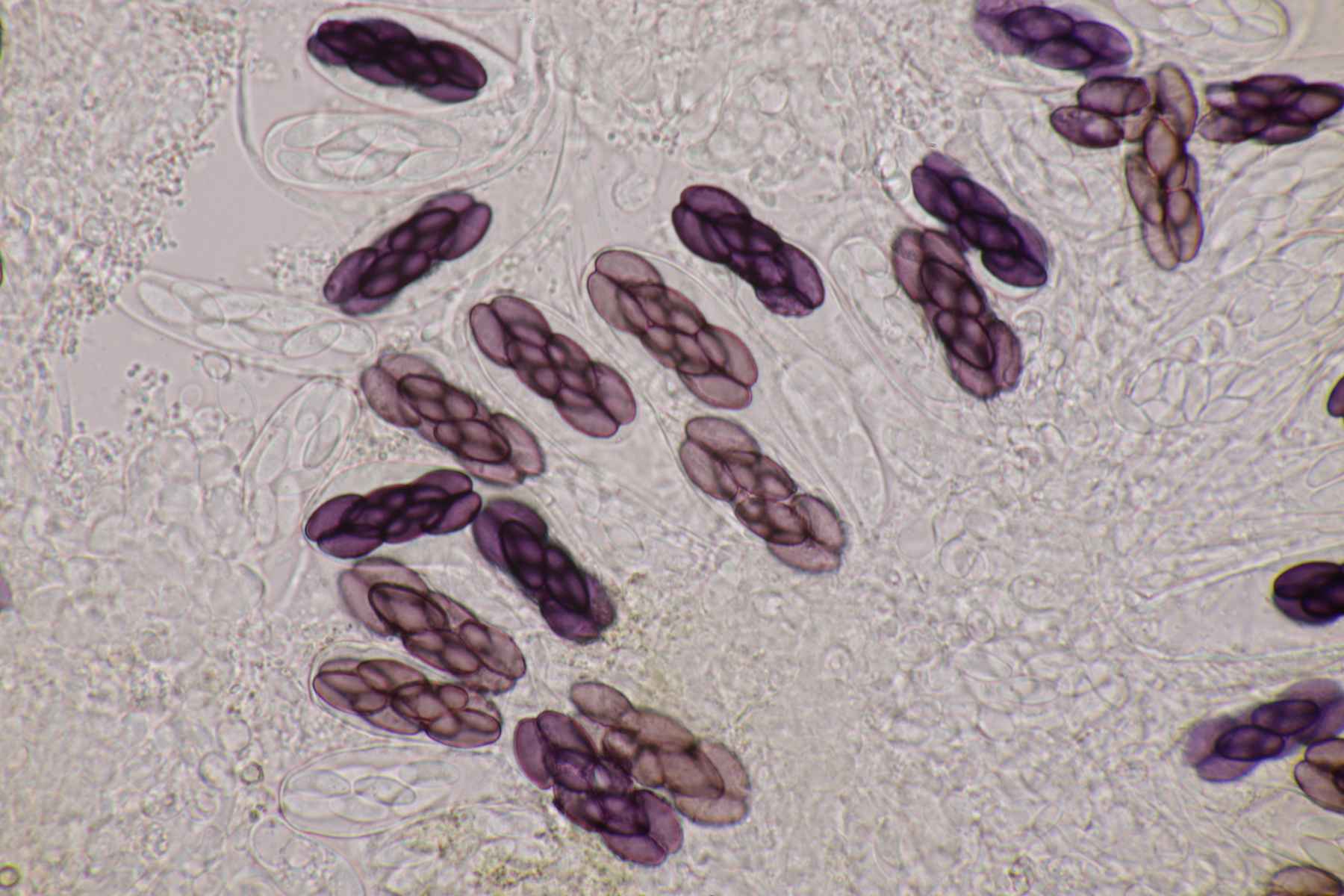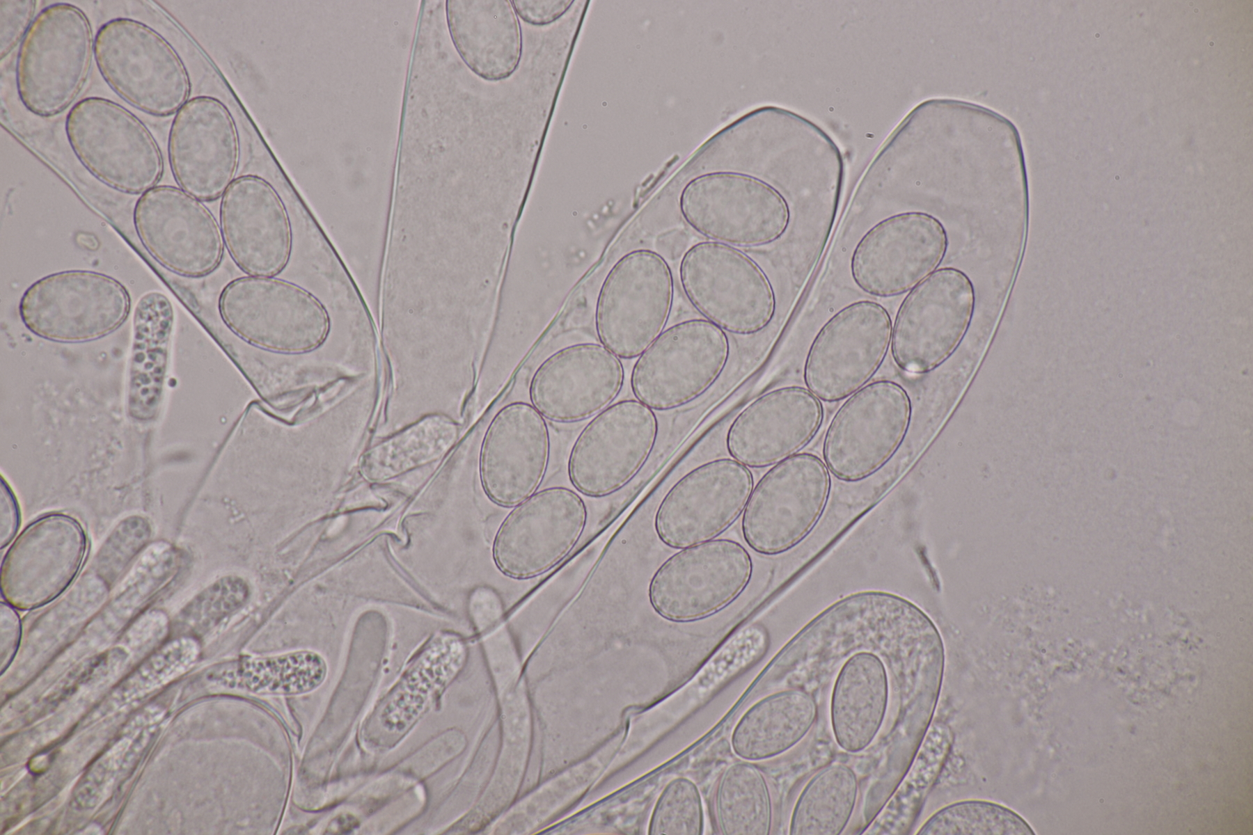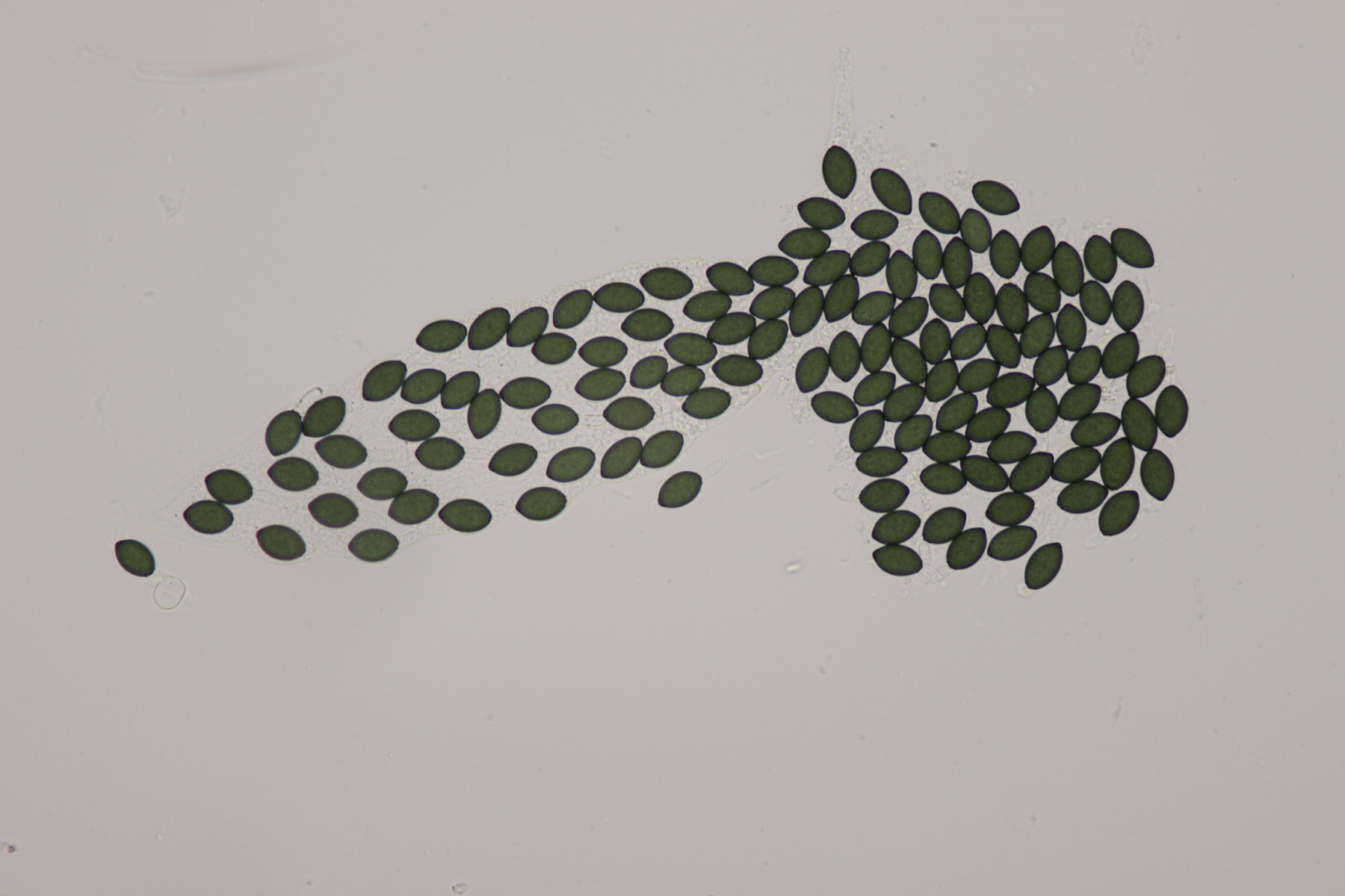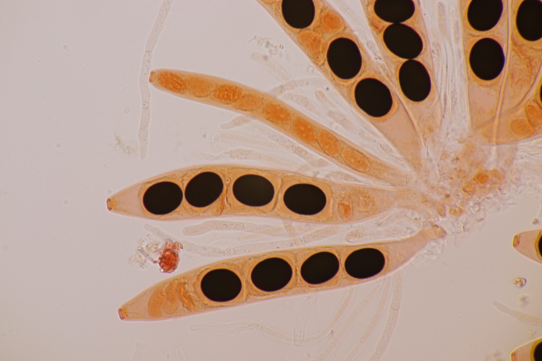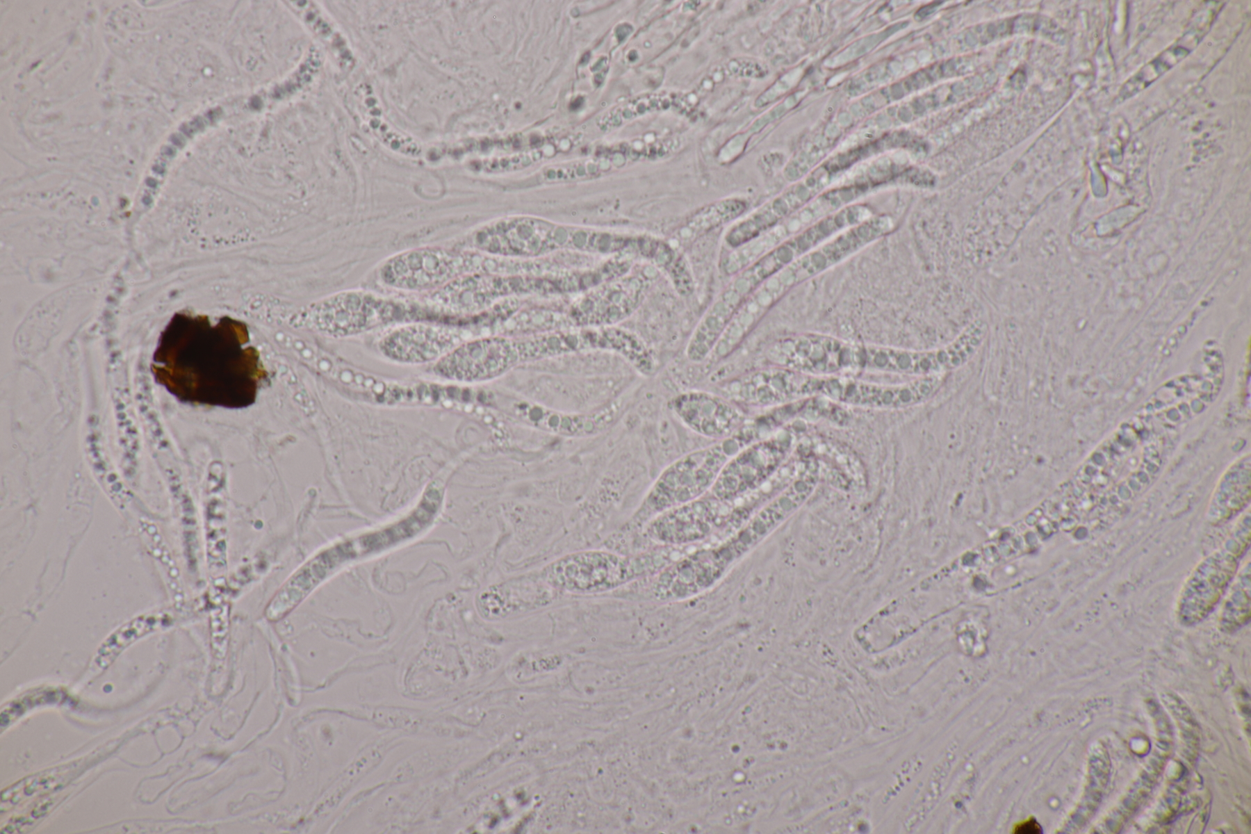 II.3 Nochmal ein Saccobolus, diesmal makroskopisch etwas kompakter. Sporencluster ca 35 x 12 µm, Sporen messen 12-13 µm x 6 µm. Das würde dann schon deutlicher zu S. depauperatus tendieren.