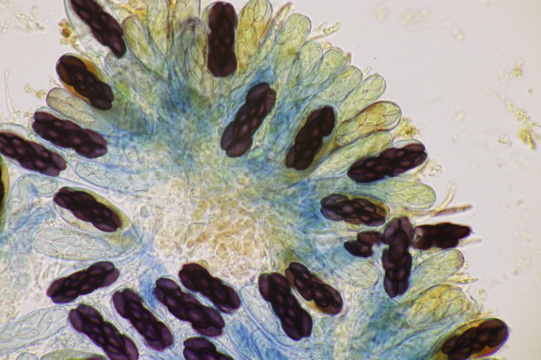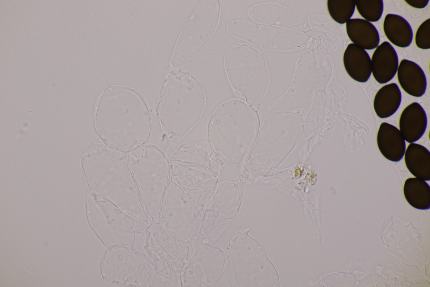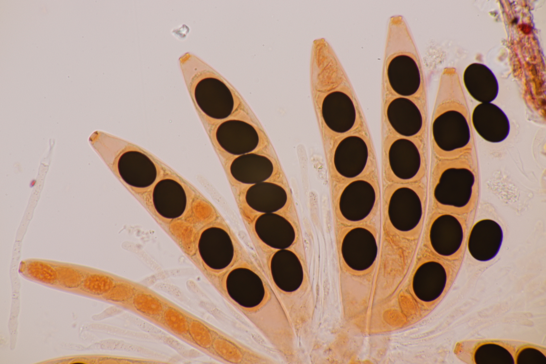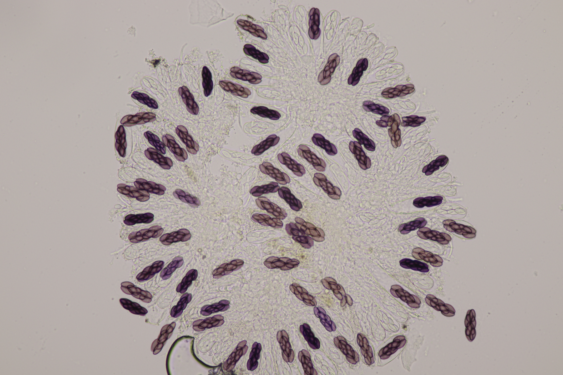 II.3 Nochmal ein Saccobolus, diesmal makroskopisch etwas kompakter. Sporencluster ca 35 x 12 µm, Sporen messen 12-13 µm x 6 µm. Das würde dann schon deutlicher zu S. depauperatus tendieren.