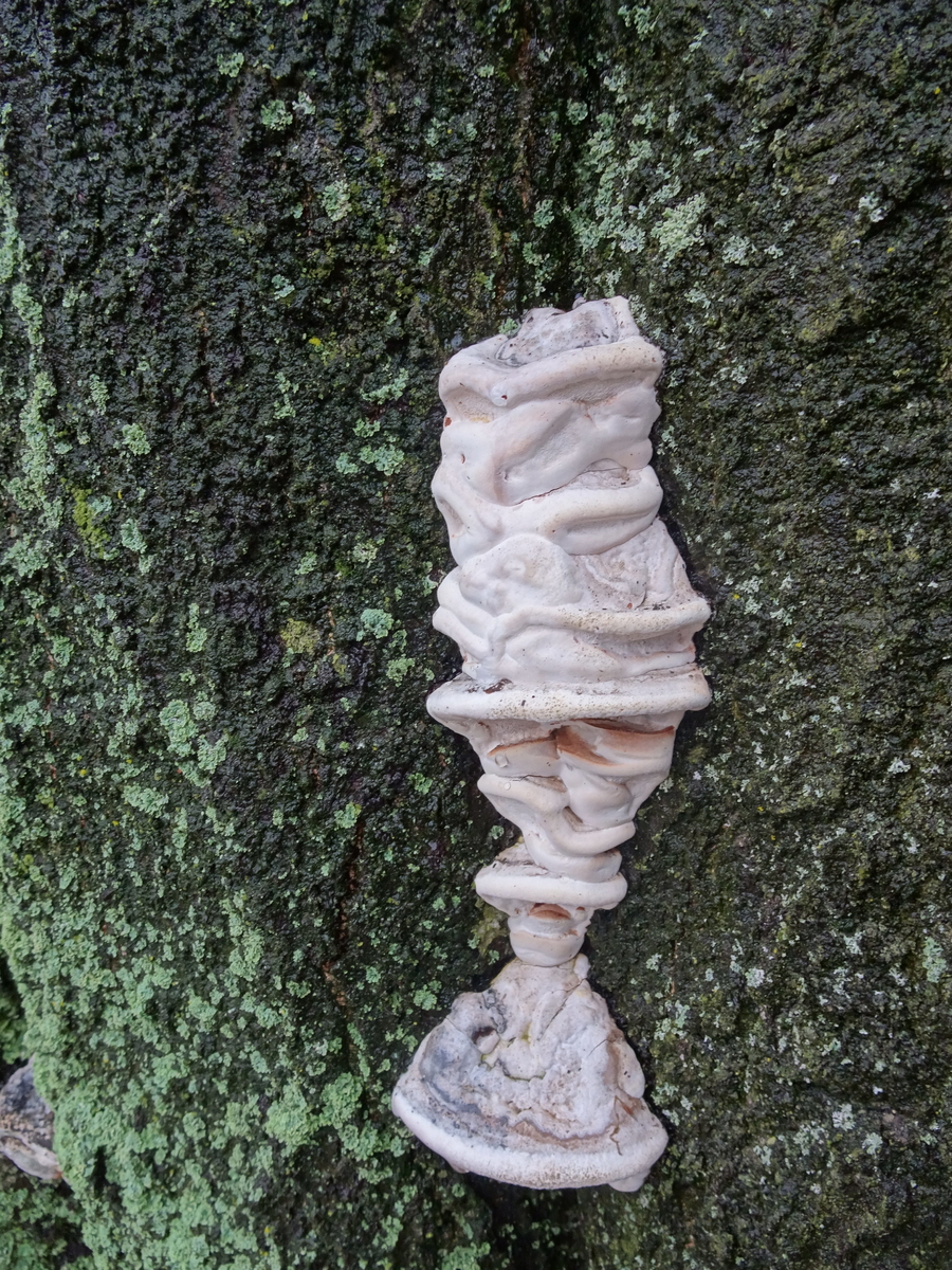 Womöglich stammen die Fruchtkörper vom Feuerschwamm. Dann würden auch die ineinander übergehenden Pilzfruchtkörper passen.
