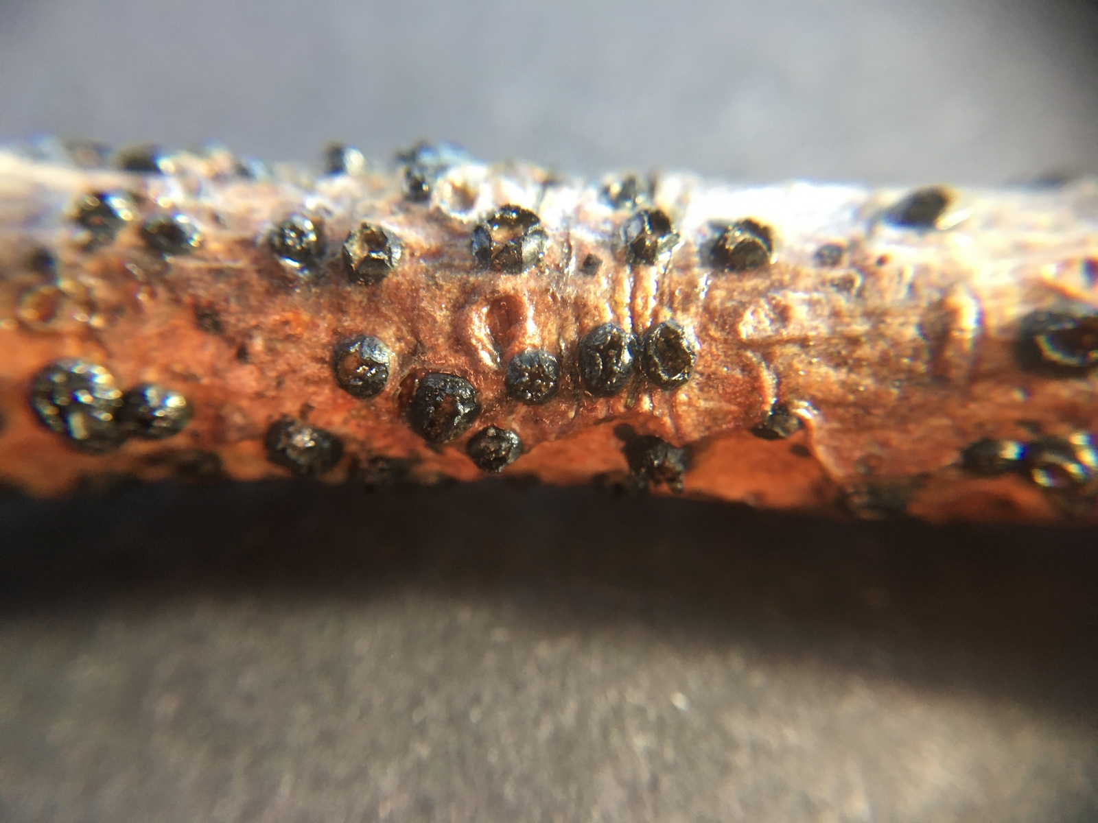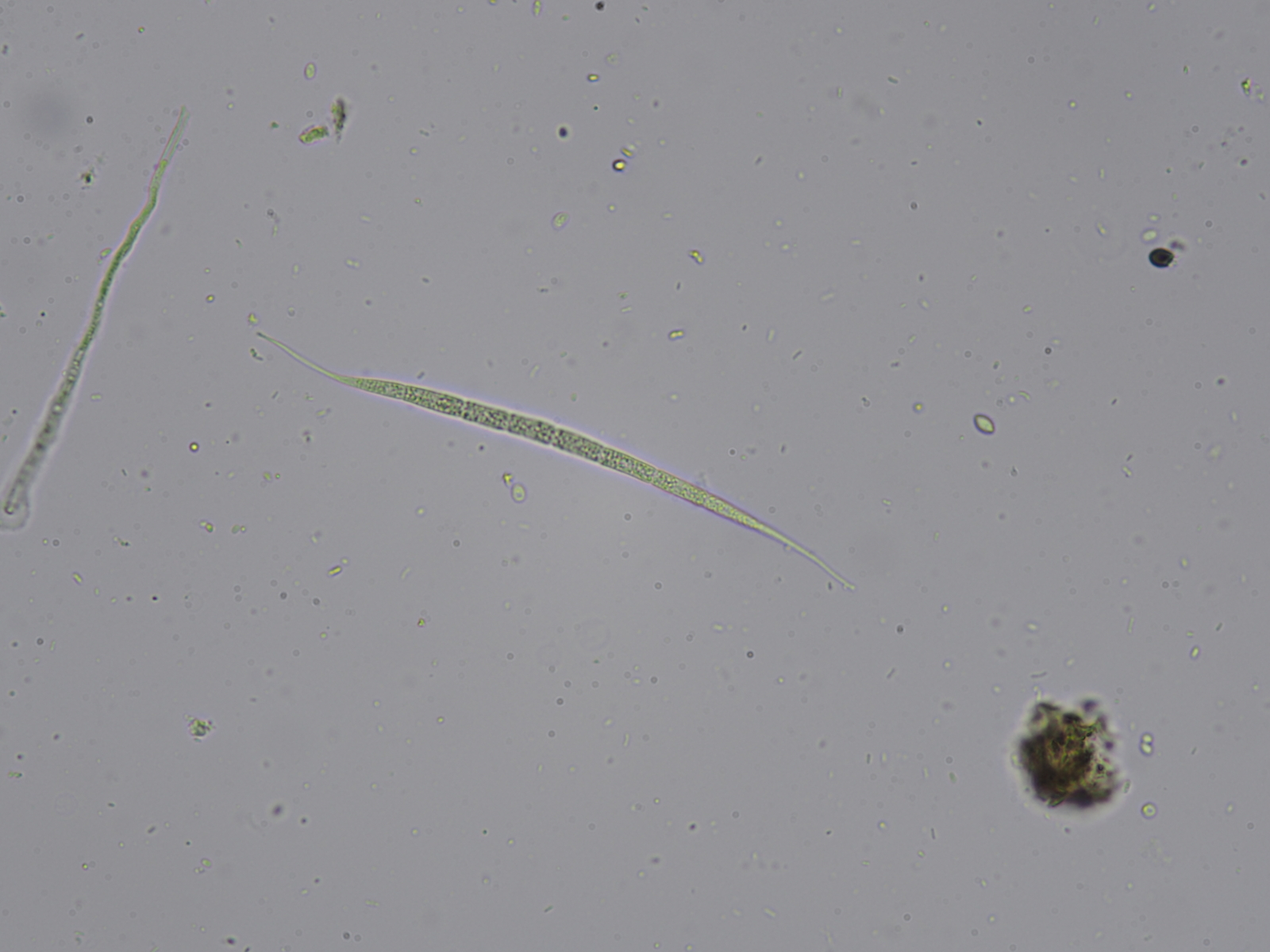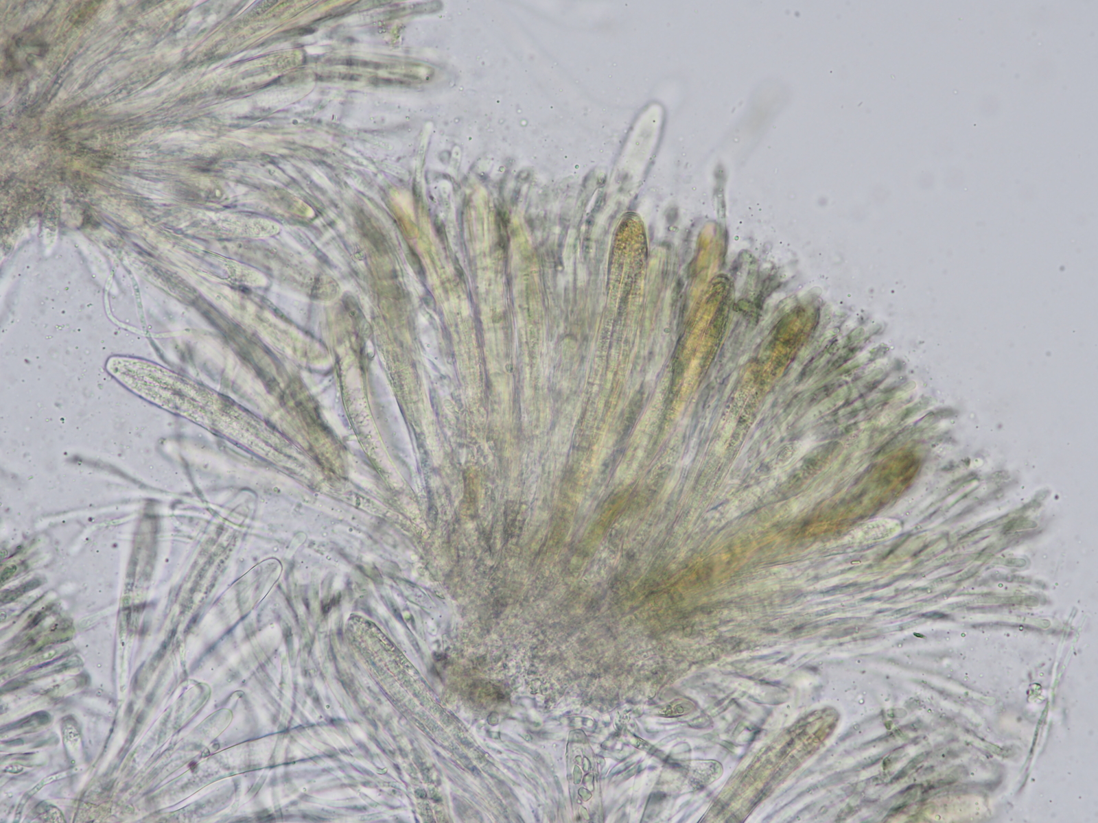• Servus Freunde des Kleinzeugs, nichts ahnend habe ich letztens dieses Kiefernästchen eingesteckt, in der Meinung es sollte eine häufige Allerweltsart sein, die bestimmt nicht schwer zu bestimmen sei. Das kann natürlich trotzdem sein ;) - aber irgendwie hab ich ein Brett vorm Kopf. Ich hätte die kleinen FK makroskopisch am ehesten bei den Pyrenomyceten verordnet. Allerdings haben sie hyaline riesige Sporen. Ich hielt sie zuerst für tote Nematoden:giggle: weil sie so lang ausgezogene Enden haben. Bis ich Sporen aus zerstörten Asci herauslugen sah die auch diese fädigen Enden hatten. Dürfen Pyrenomyceten so helle Sporen haben? Jedenfalls passt keine Spur.. Rosellinia die ich zunächst erwogen hatte, haben 1/10 so große Sporen ... :grolleyes: