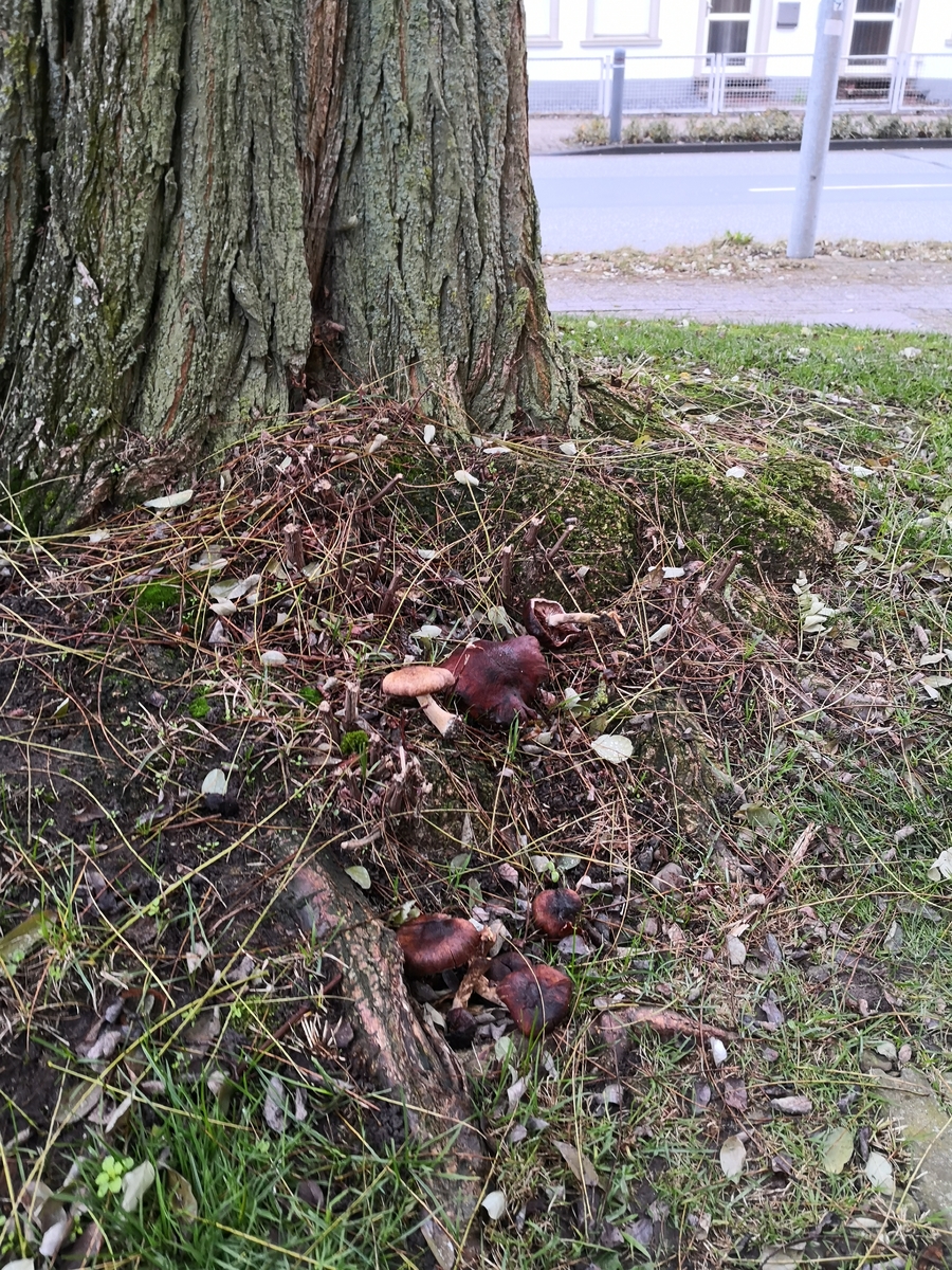 Und dann habe ich im Wurzelberiech der Robinie noch einen Pilz endeckt. Leider wurde kurz vor meiner Untersuchung der Umgebungsraum abgemäht, sodass nur noch ein paar Reste von den Pilzen zu sehen waren. Auch hhier ist an den Wurzeln oder Wurzelanläufen keine Fäule oder Morschung erkennbar. Ich habe die Vermutung das es sich dabei um den Sparrigen Schüpling (Pholiota squarrosa) handelt. Was denkt Ihr?
