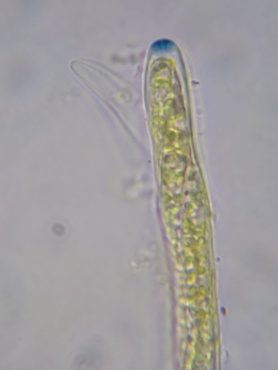 Unter dem Mikroskop fand ich bei beiden Proben Kristalle in der Medulla und rundliche Zellen (vgl. Bild 9&10); die gleichen Sporen mit vielen kleinen Öltröpfen (vgl. Bild 6), insgesamt kein Unterschied zur allerersten Probe vom Baumstamm von vor einer Woche - es sollte sich also um den gleichen Pilz handeln.