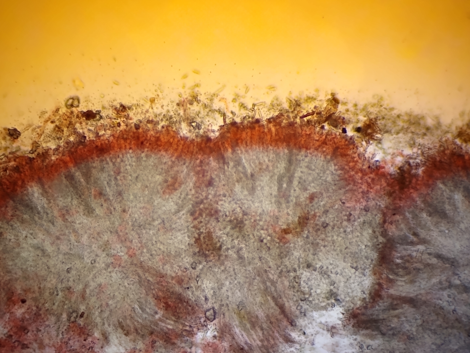 Ich habe den großen Fruchtkörper aus Bild 3 am Stielchen abgeschnitten und zum Mikroskopieren mitgenommen.