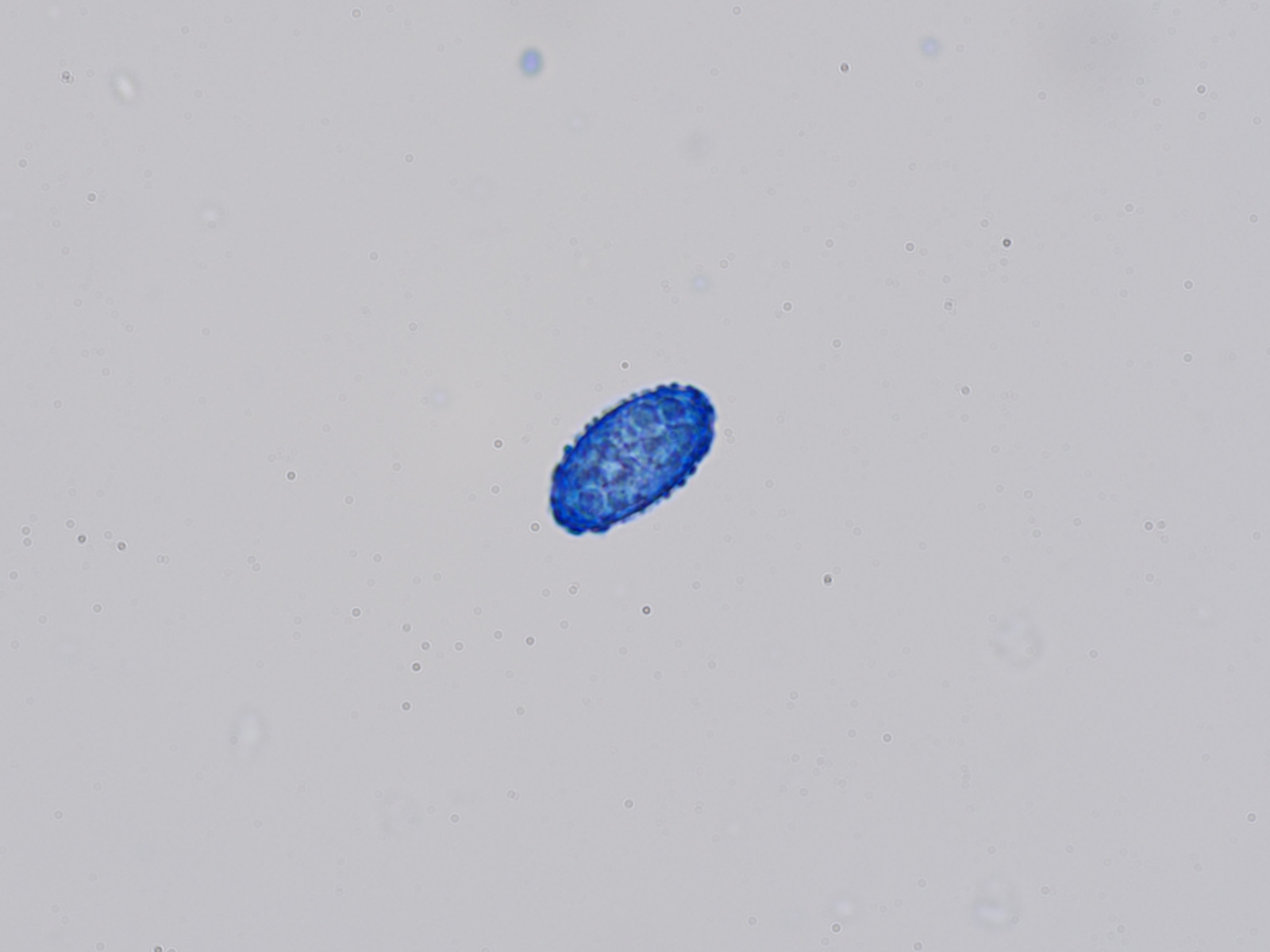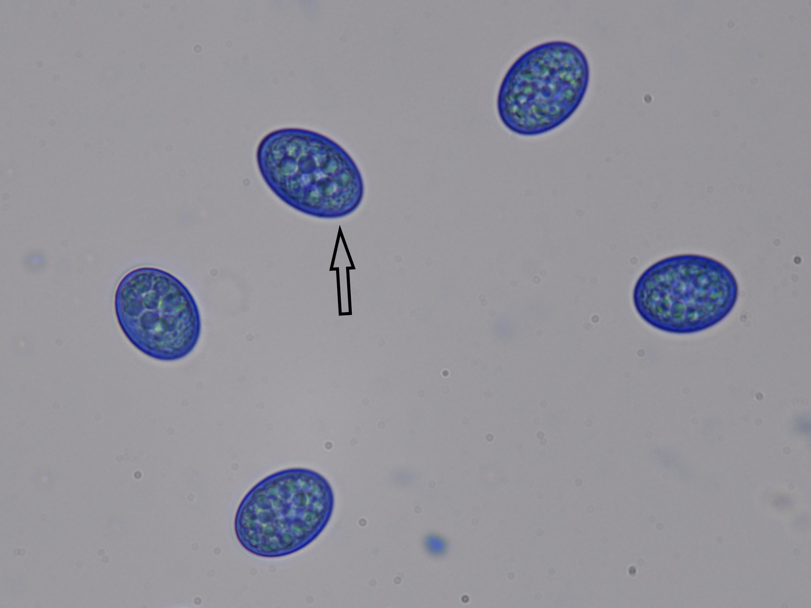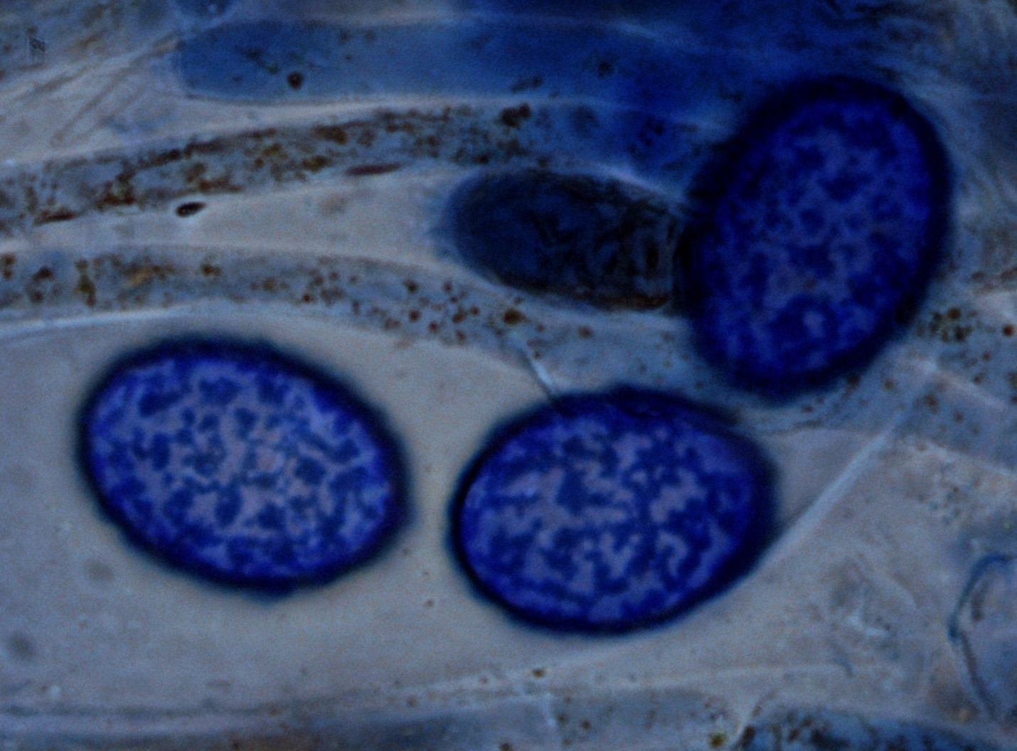 Sporen breitellipsoid, dickwandig, wirkten ohne Färbung für mich glatt (cave nicht mit den groben zytopl. Granula verwechseln)