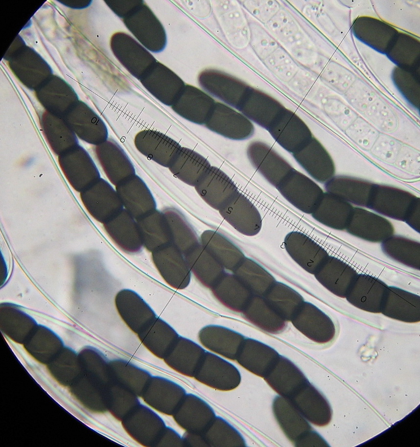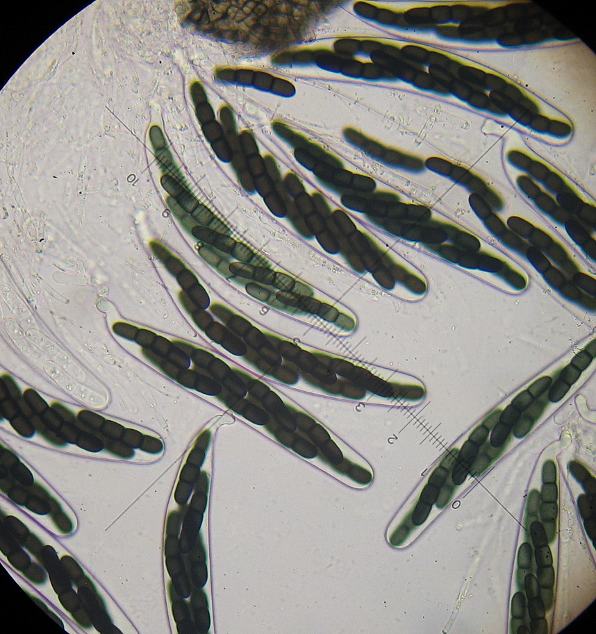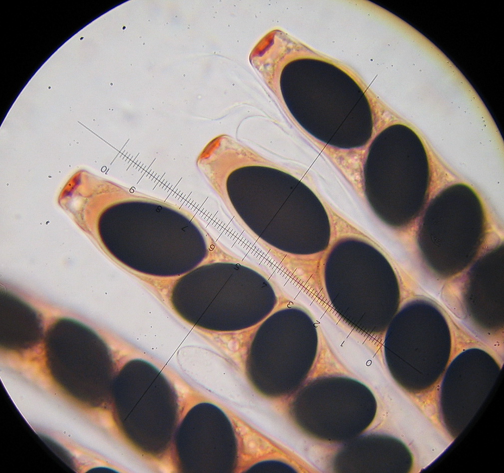 In Chloralschwarz Sporen mit Schleimhülle und dunkel gefärbten Apikalringen der Asci