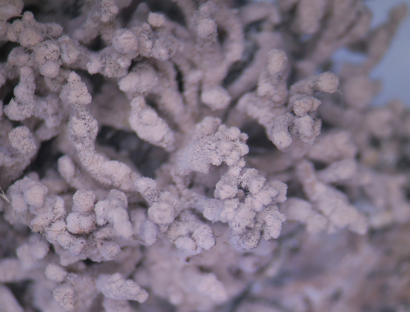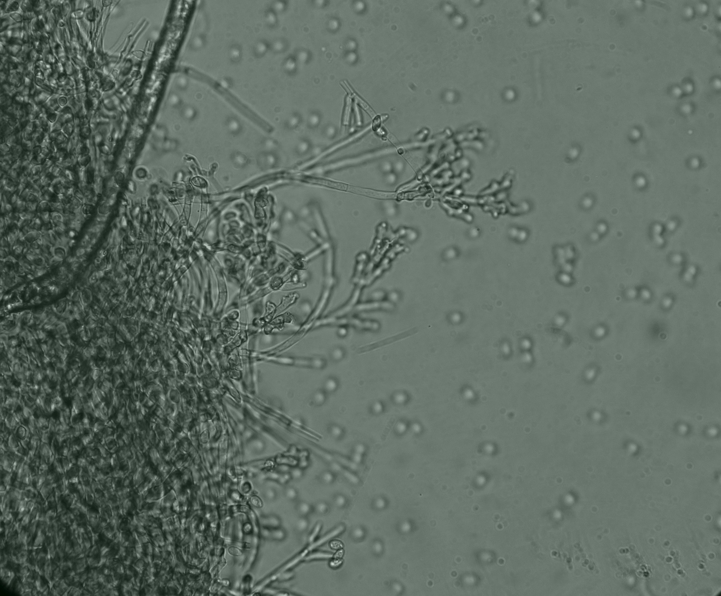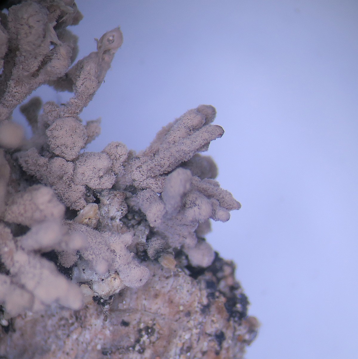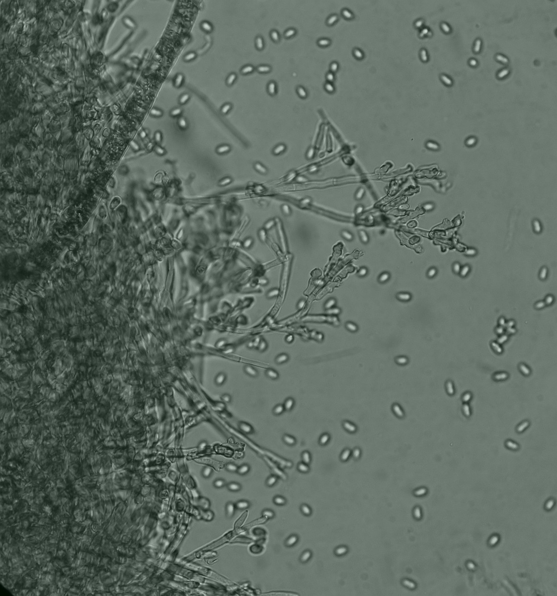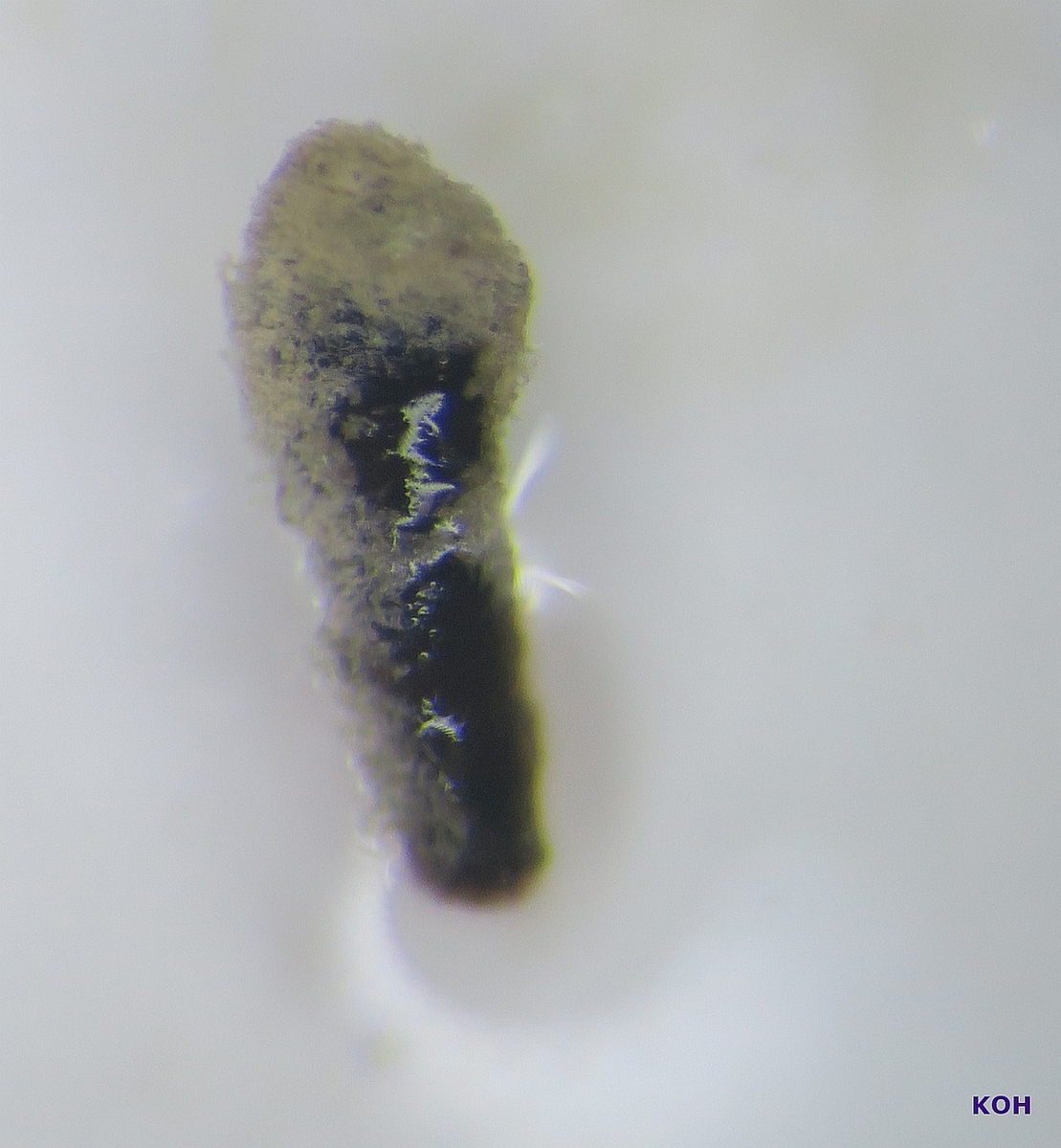 Hi, here I am writing again about another strange fungus growing on the bark of a dead tree that I suspect is Ficus carica. First seen, it looks like a dry coral mushroom with a pale beige-ink color. It grows in tufts and then it apparently blackens out. Under the microscope, it turned out to be a synematous microfungus composed of sterile structural core of thick entangled hyphae, mustard-brown to curry-brown in color but dull. This becomes black in KOH. The outer layer is a thick dense coat of penicillate hyphae, with branches arranged in whorls and each subbranch seems to have a small head of phialides each producing one conidiospore. Conidiosore bean-shaped. This layer is pale mauve (almost greyish) and turns dirty green in KOH. The conidiospores are cream-straw color and become mauve-pink in KOH.