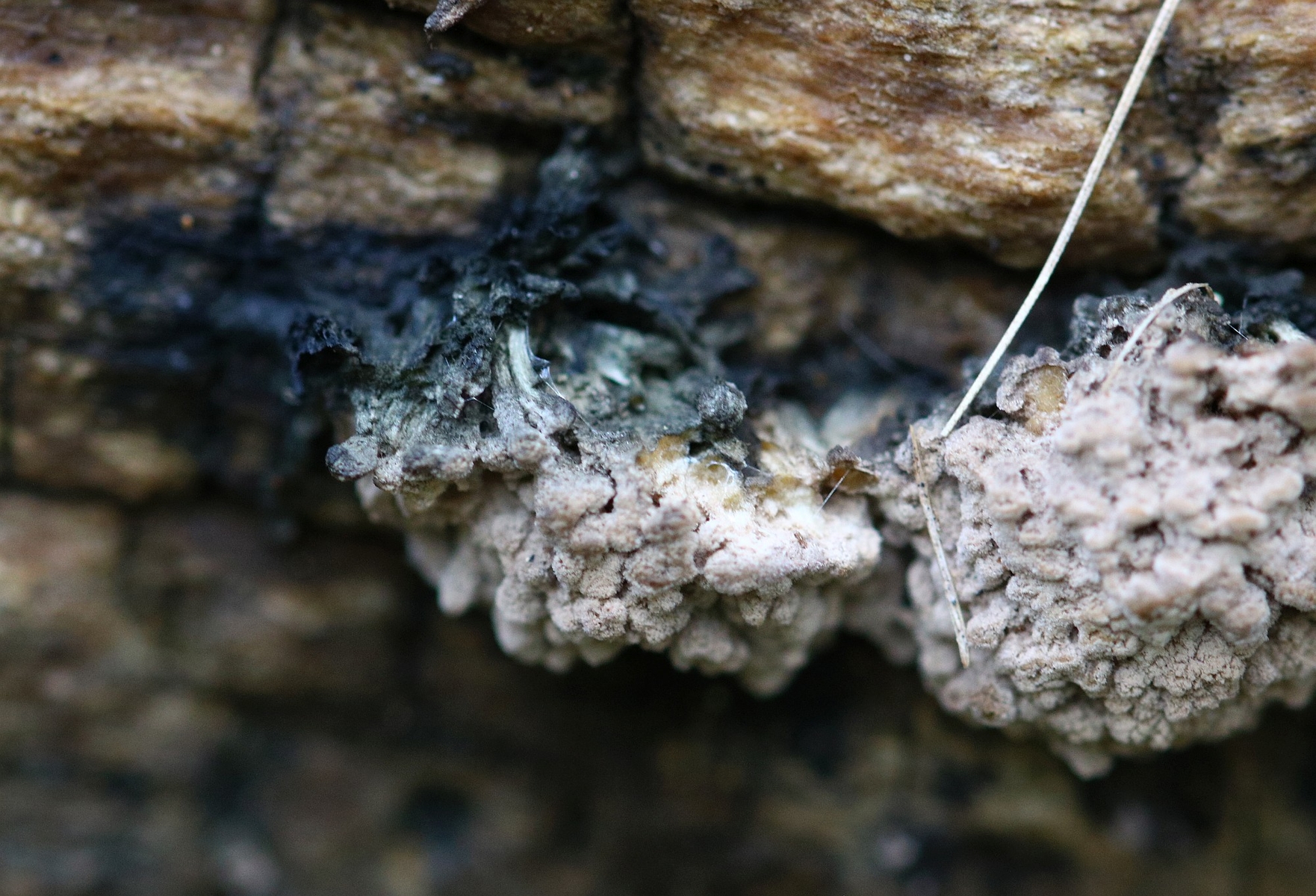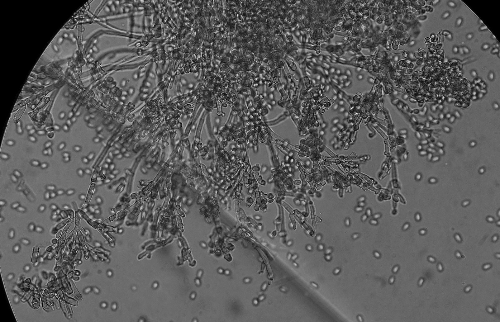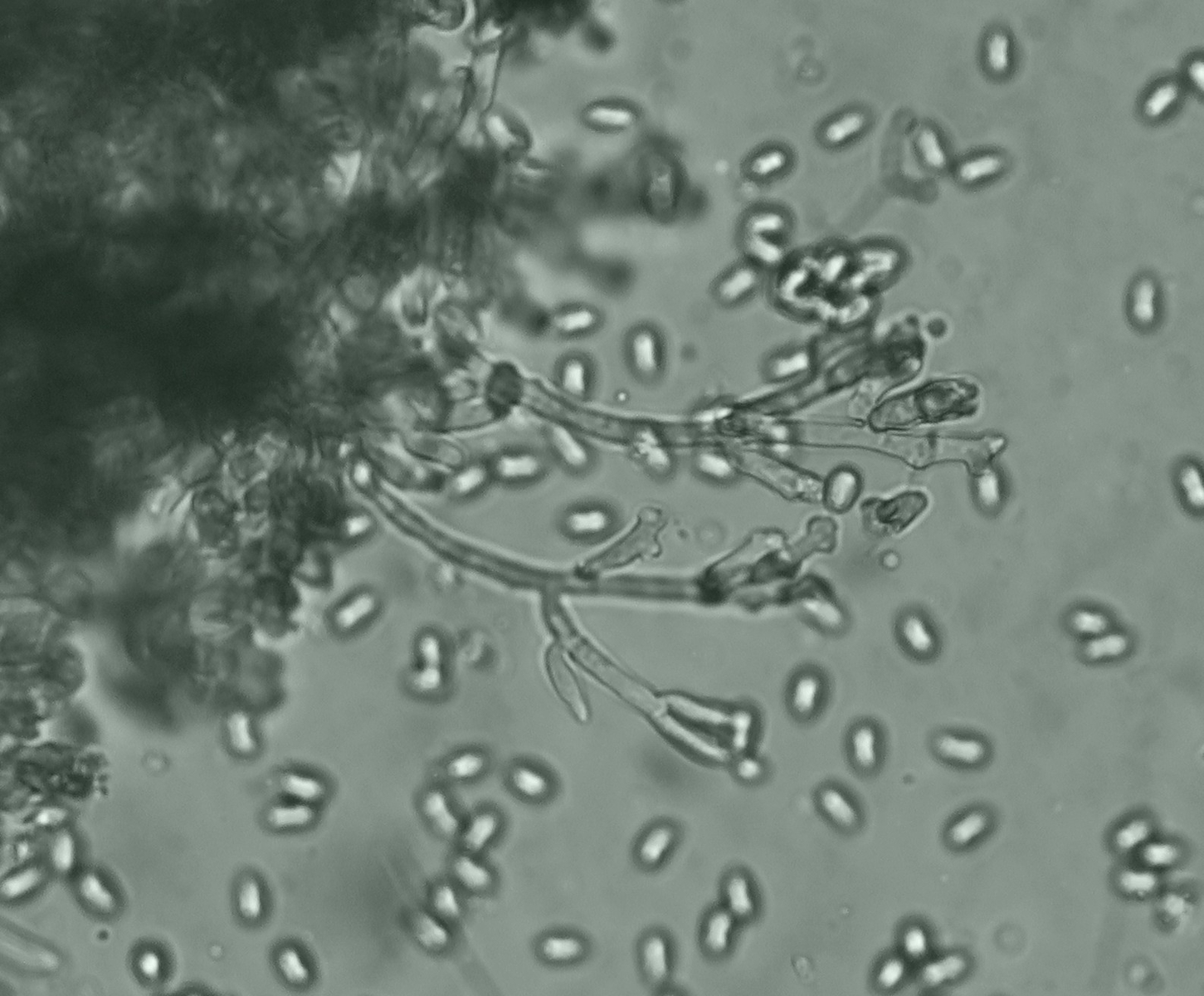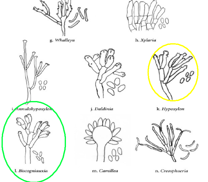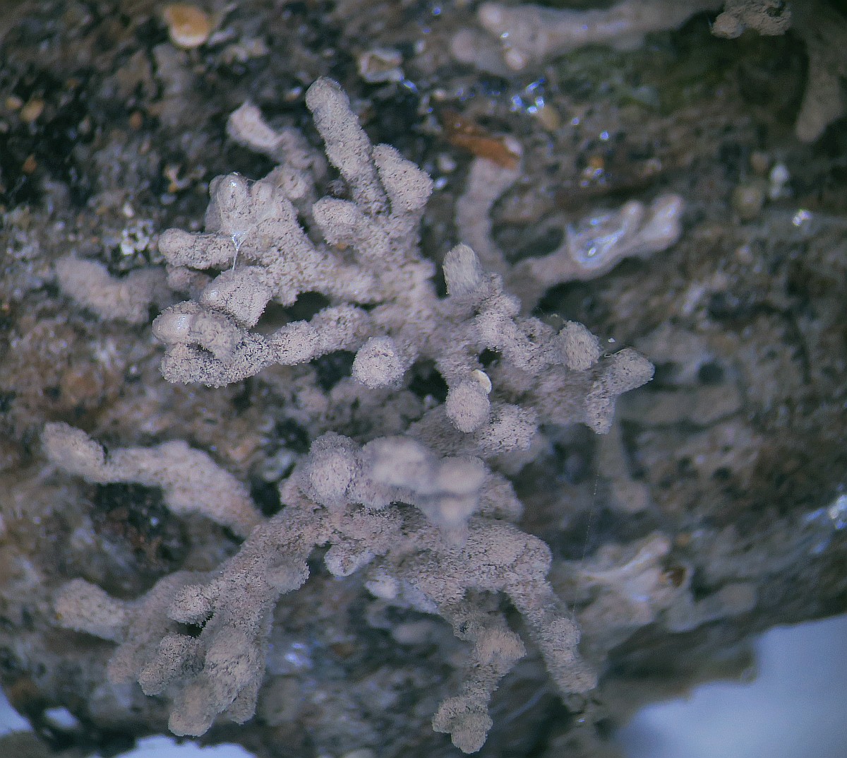 Hi, here I am writing again about another strange fungus growing on the bark of a dead tree that I suspect is Ficus carica. First seen, it looks like a dry coral mushroom with a pale beige-ink color. It grows in tufts and then it apparently blackens out. Under the microscope, it turned out to be a synematous microfungus composed of sterile structural core of thick entangled hyphae, mustard-brown to curry-brown in color but dull. This becomes black in KOH. The outer layer is a thick dense coat of penicillate hyphae, with branches arranged in whorls and each subbranch seems to have a small head of phialides each producing one conidiospore. Conidiosore bean-shaped. This layer is pale mauve (almost greyish) and turns dirty green in KOH. The conidiospores are cream-straw color and become mauve-pink in KOH.