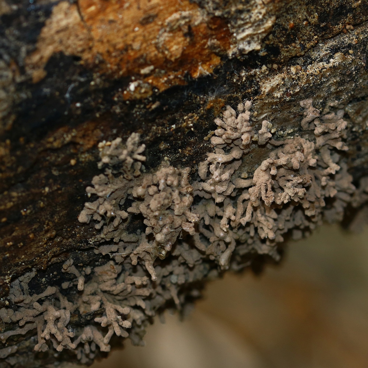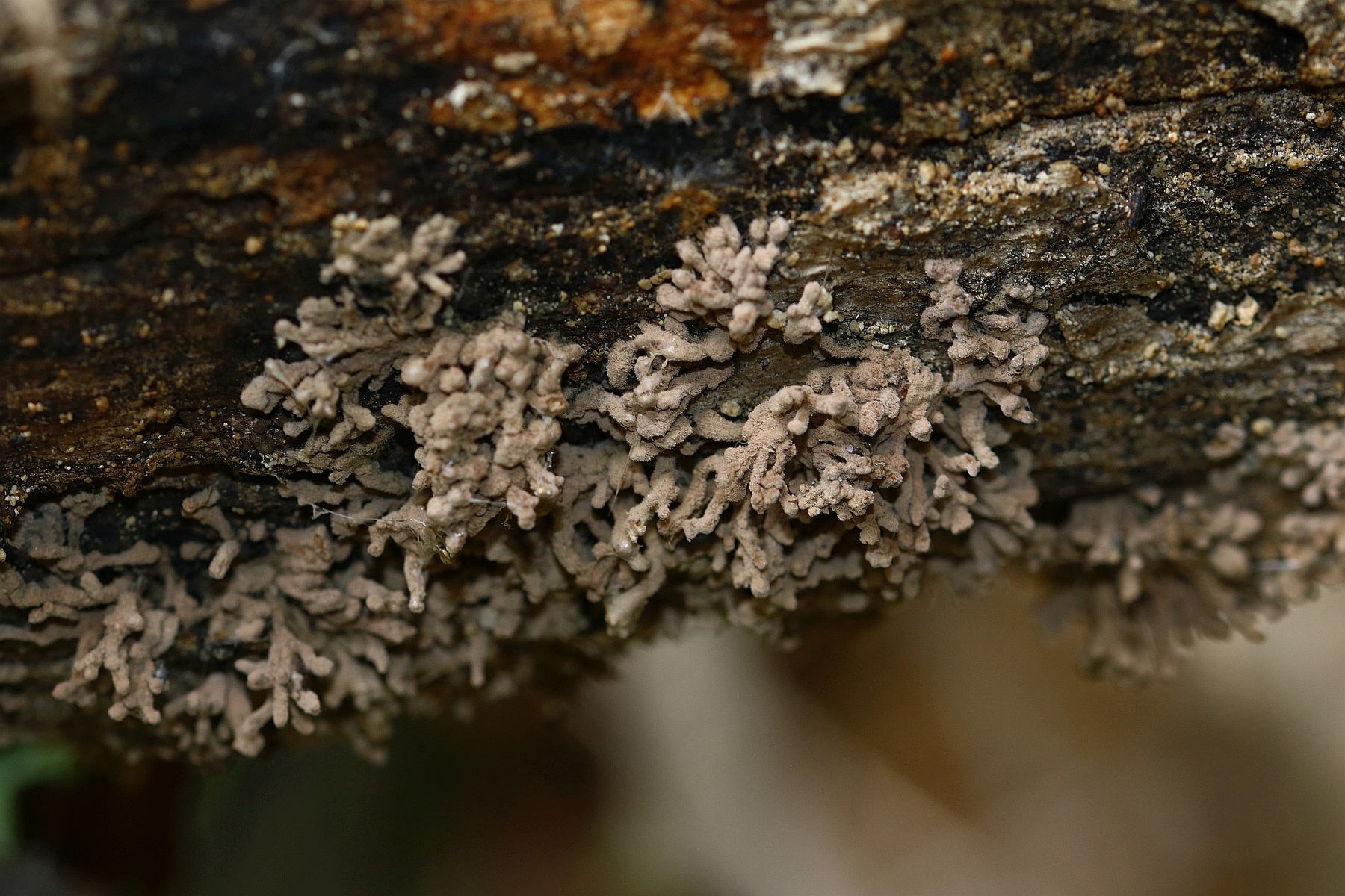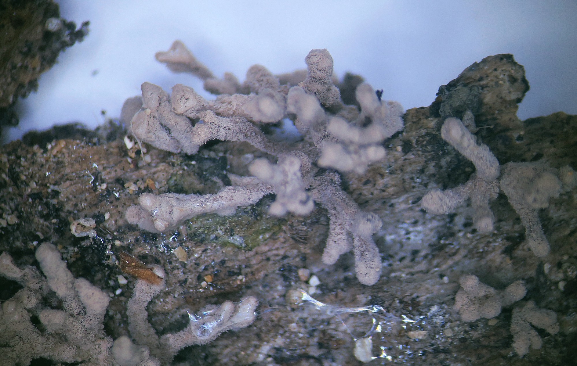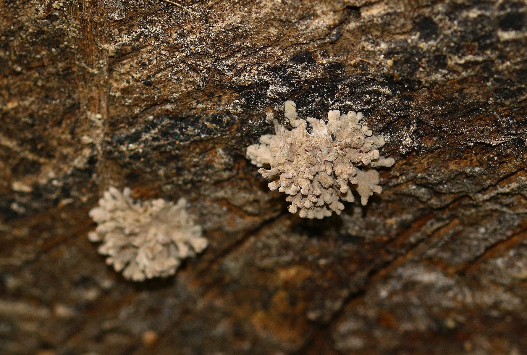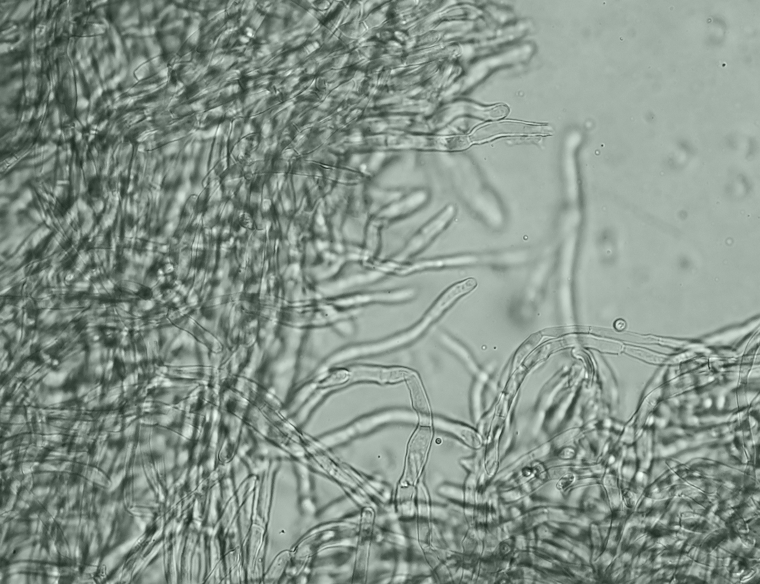 Hi, here I am writing again about another strange fungus growing on the bark of a dead tree that I suspect is Ficus carica. First seen, it looks like a dry coral mushroom with a pale beige-ink color. It grows in tufts and then it apparently blackens out. Under the microscope, it turned out to be a synematous microfungus composed of sterile structural core of thick entangled hyphae, mustard-brown to curry-brown in color but dull. This becomes black in KOH. The outer layer is a thick dense coat of penicillate hyphae, with branches arranged in whorls and each subbranch seems to have a small head of phialides each producing one conidiospore. Conidiosore bean-shaped. This layer is pale mauve (almost greyish) and turns dirty green in KOH. The conidiospores are cream-straw color and become mauve-pink in KOH.