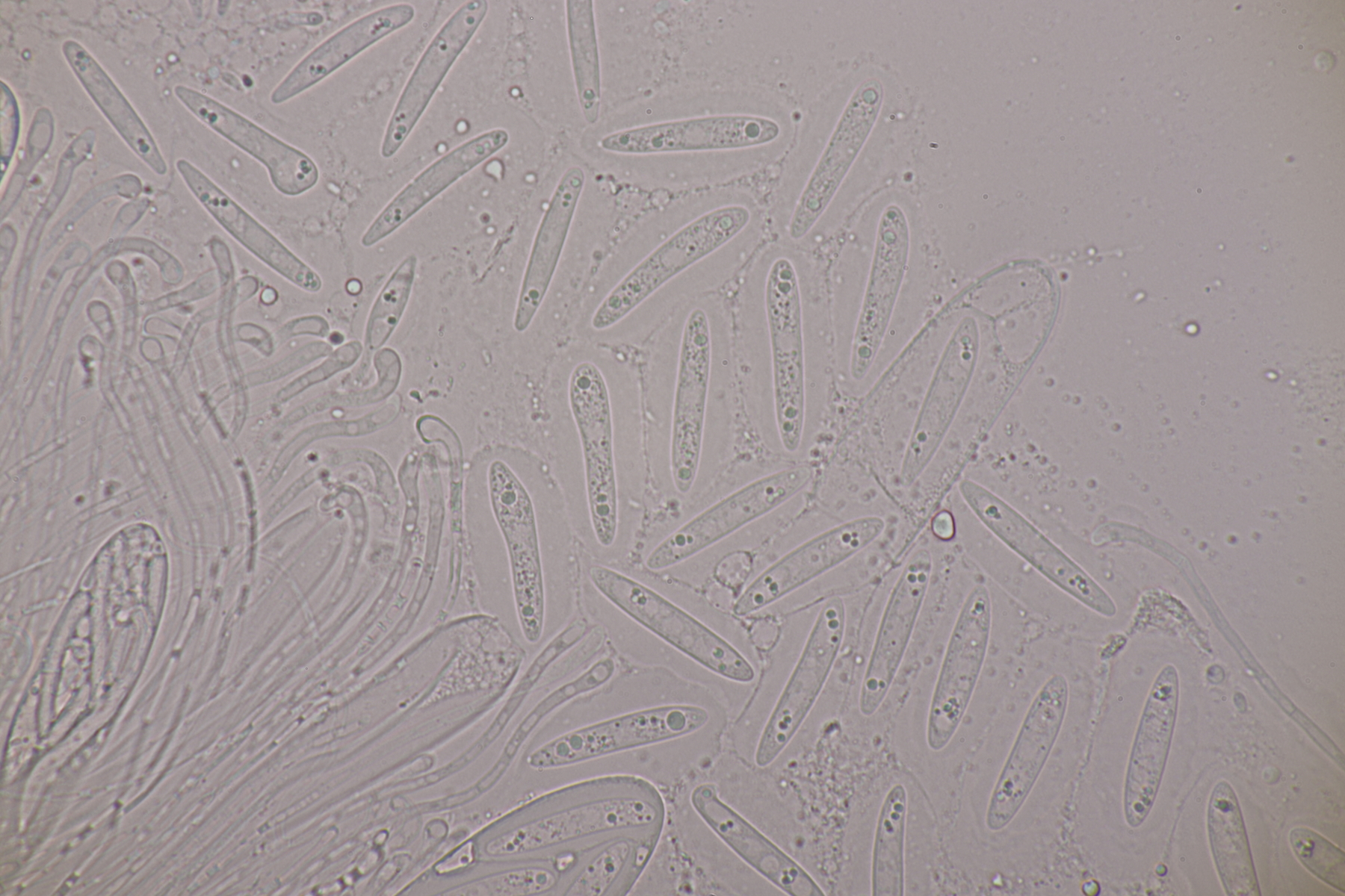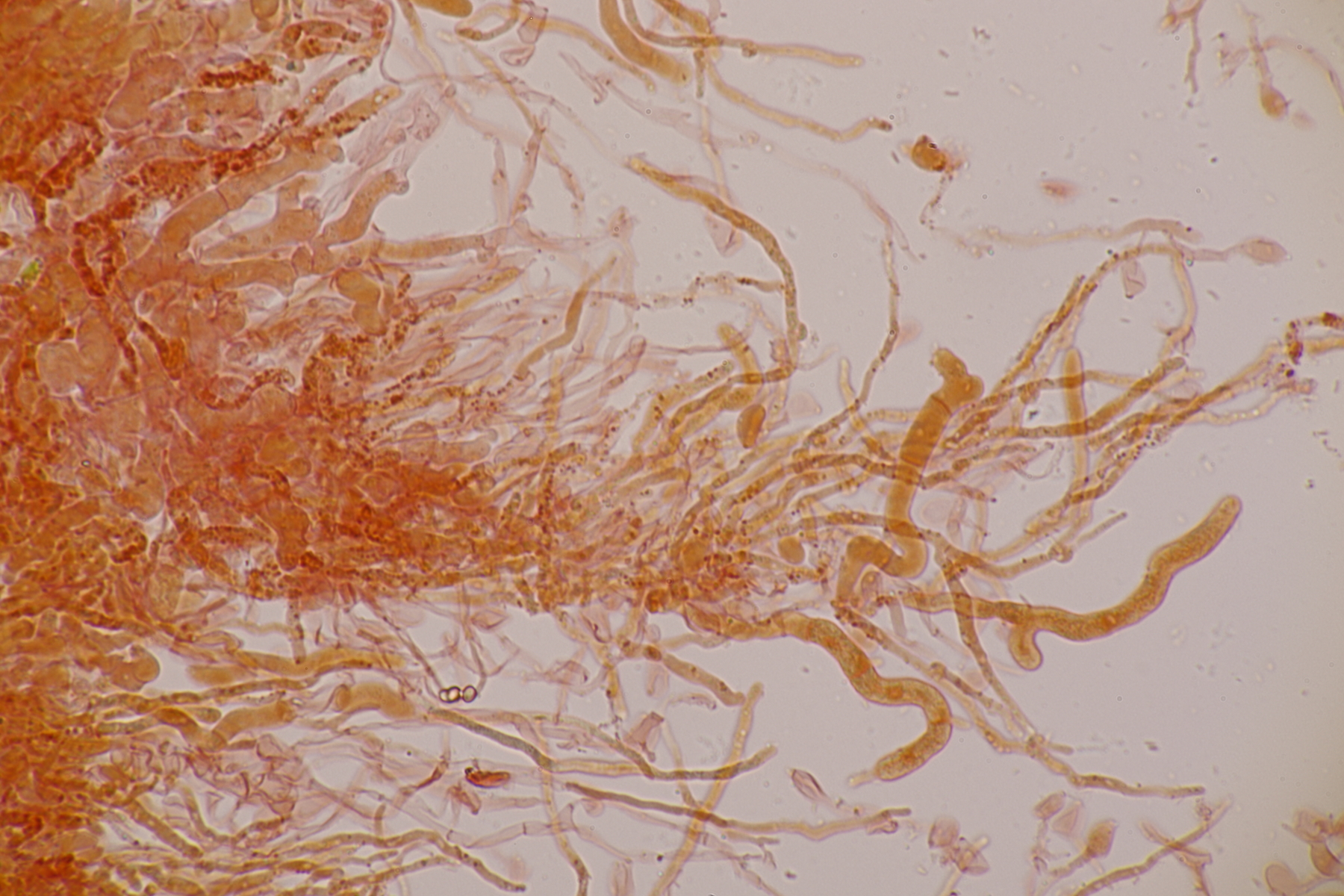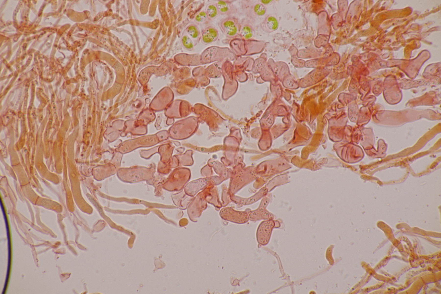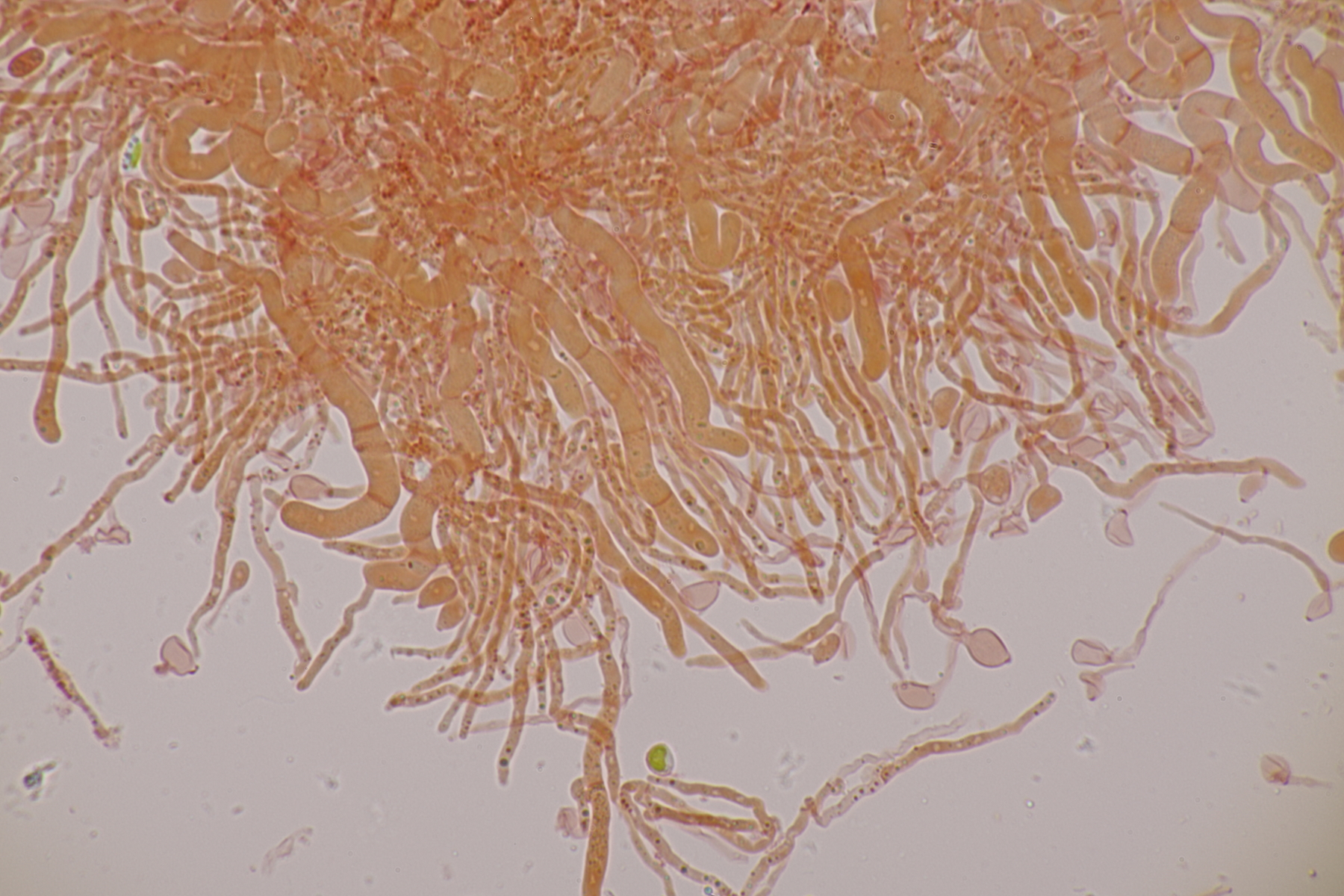 2. Ein weißer Heterobasidiomycet. Im Subikulum sind recht dickwandige, breite Zellen mit Schnallen vorhanden, dazu auriculariode Basidien mit vier langen Sterigmen. Mit dem Phragmoschlüssel der Niederländer lande ich dann bei Colacogloea effusa. Der soll aber an Peniophorella praetermissa parasitieren und die ist hier weit und breit nicht zu sehen.