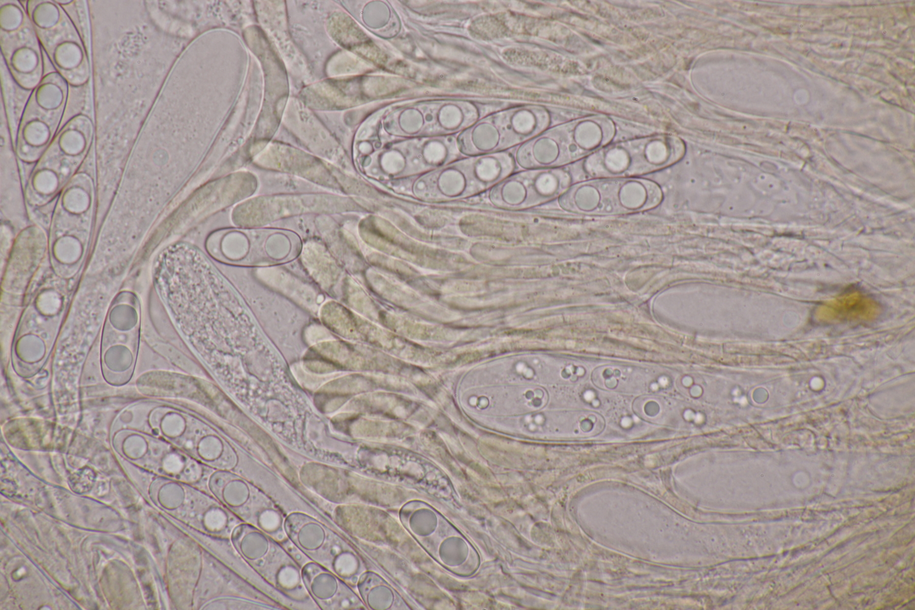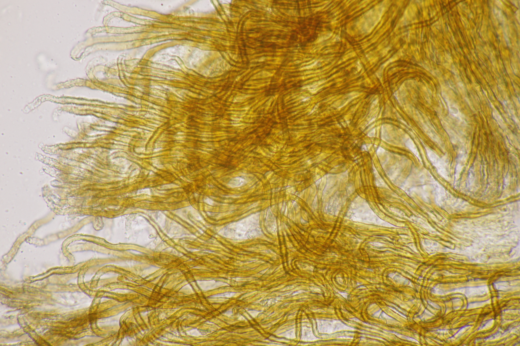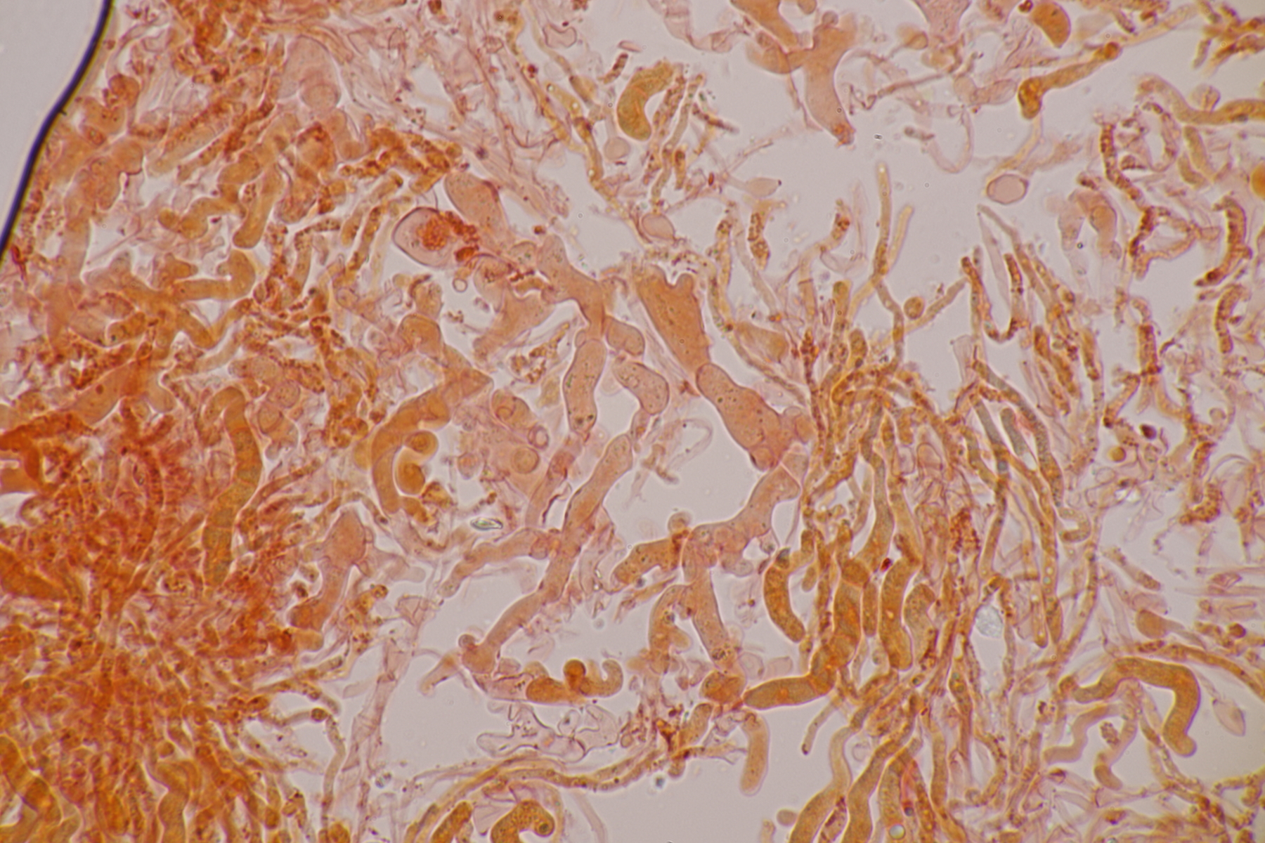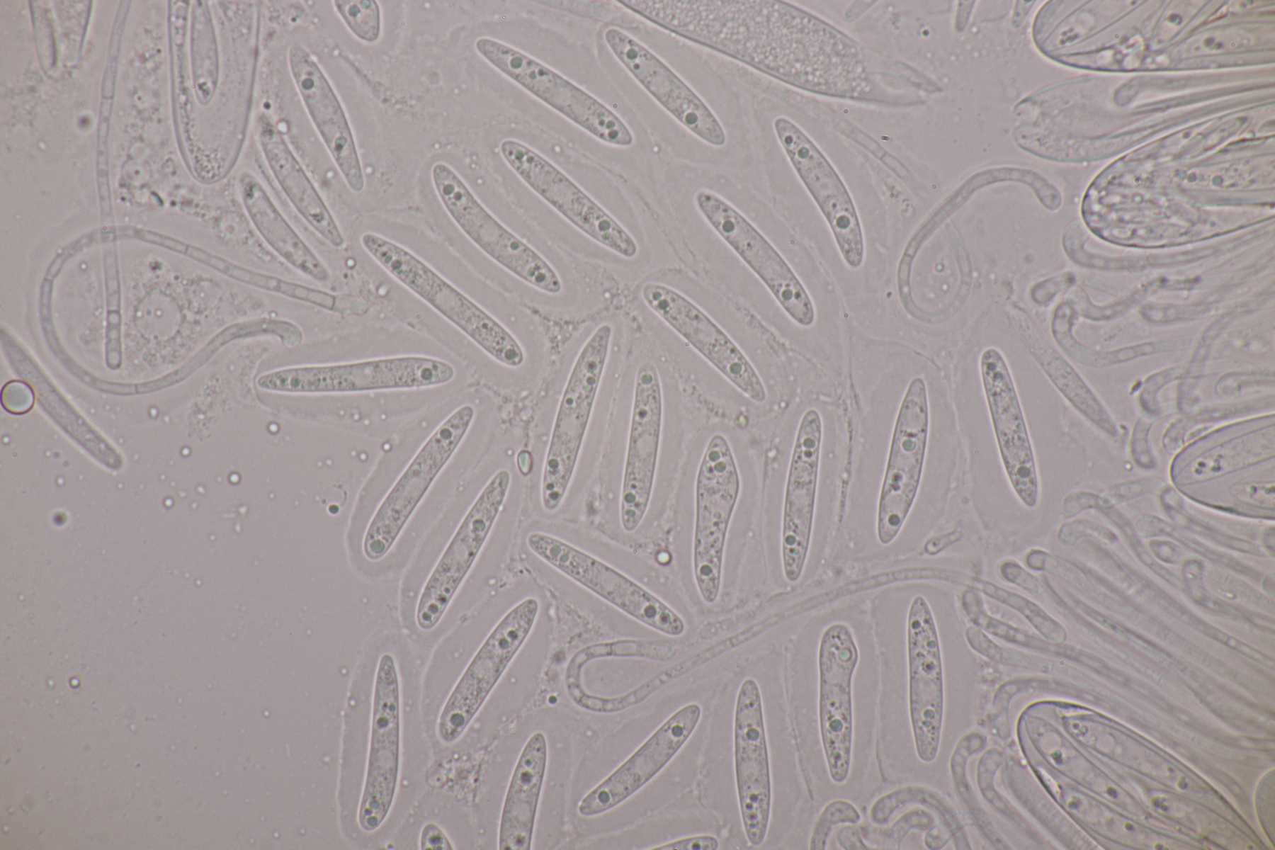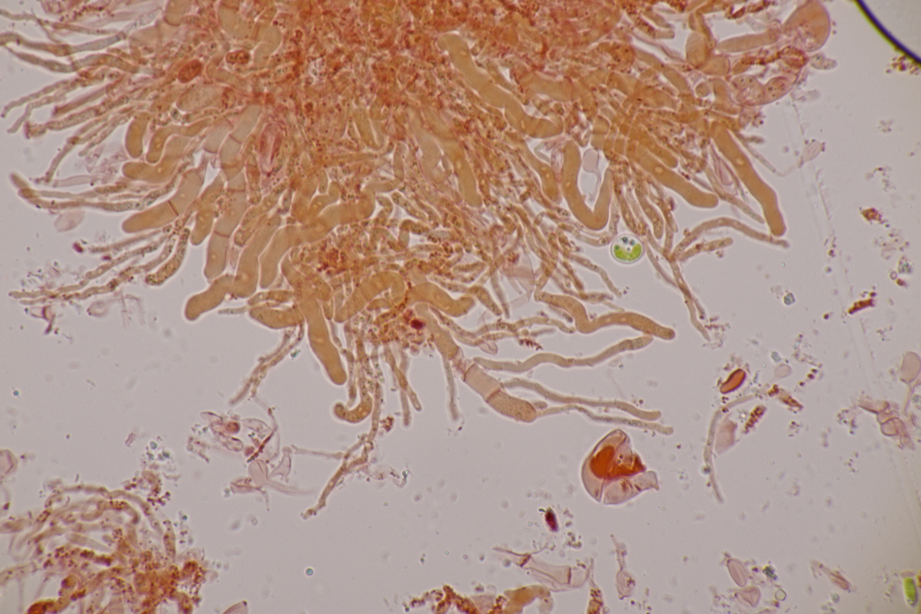 2. Ein weißer Heterobasidiomycet. Im Subikulum sind recht dickwandige, breite Zellen mit Schnallen vorhanden, dazu auriculariode Basidien mit vier langen Sterigmen. Mit dem Phragmoschlüssel der Niederländer lande ich dann bei Colacogloea effusa. Der soll aber an Peniophorella praetermissa parasitieren und die ist hier weit und breit nicht zu sehen.