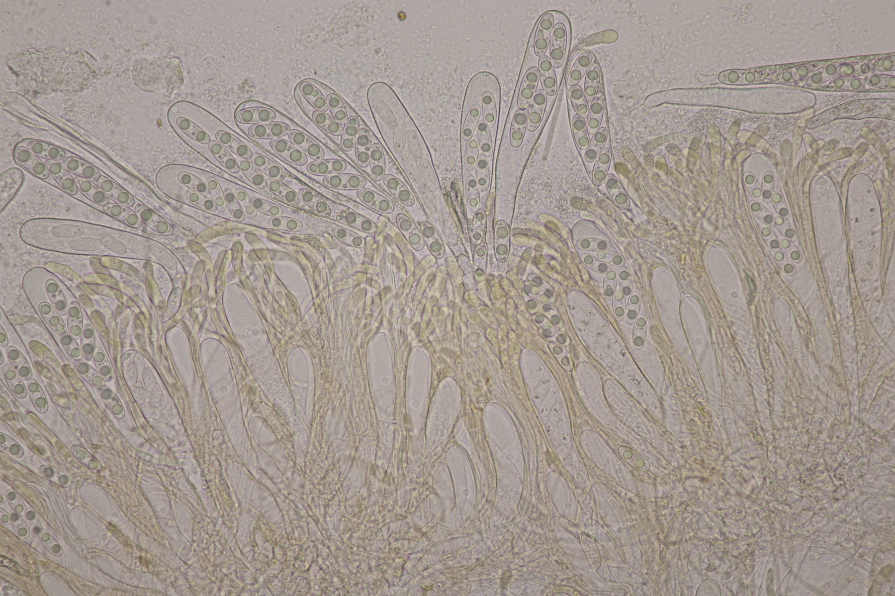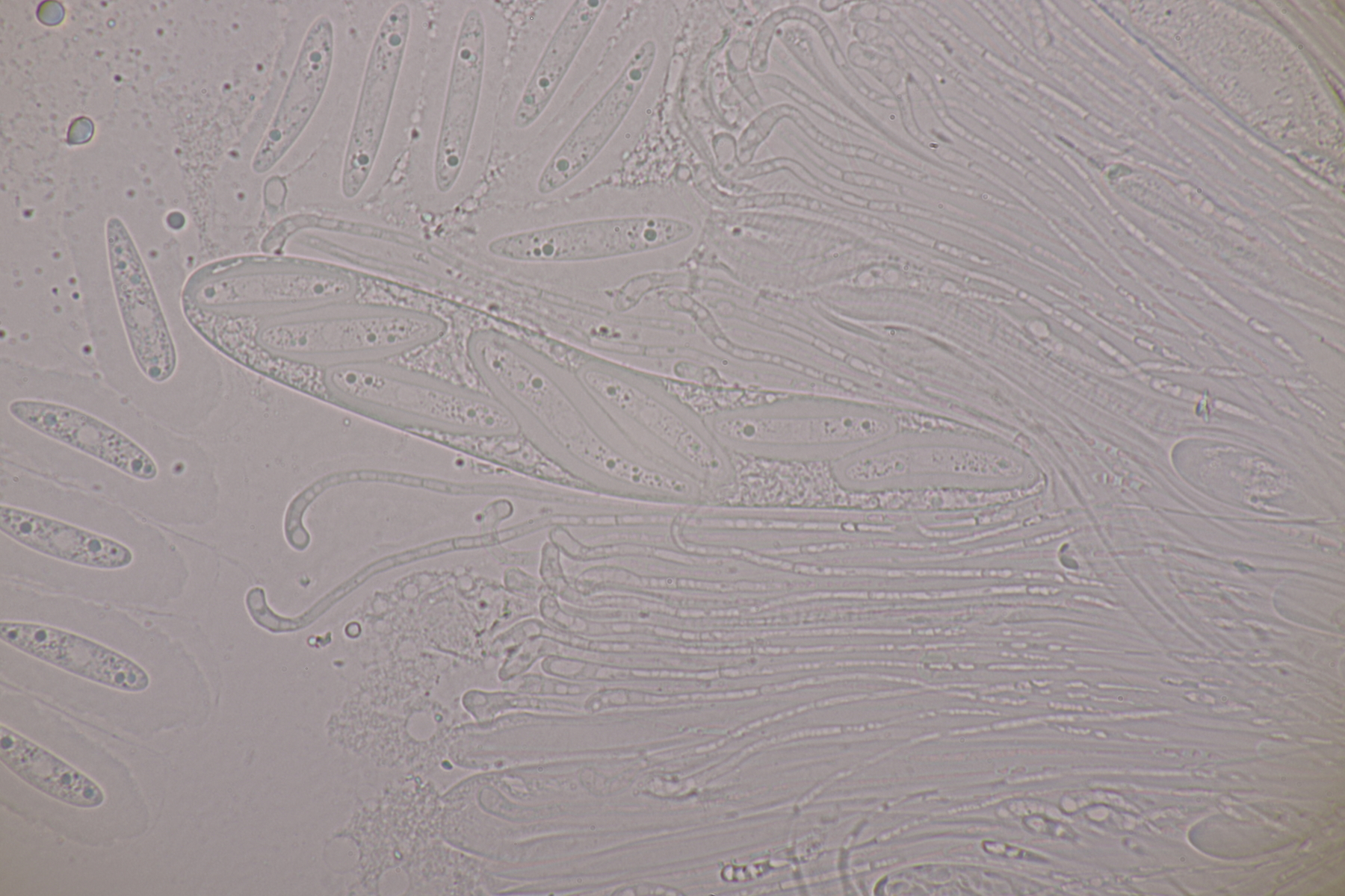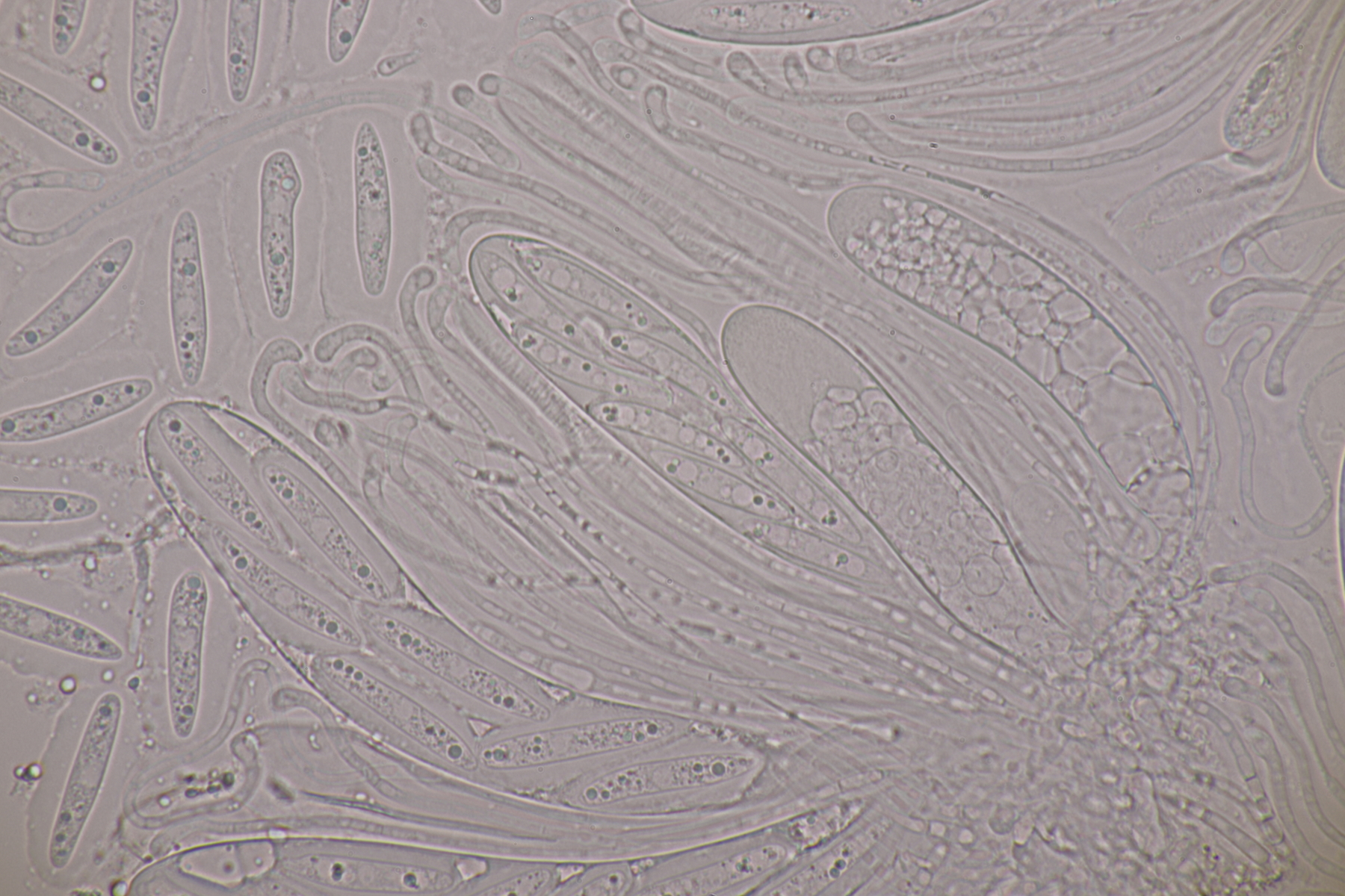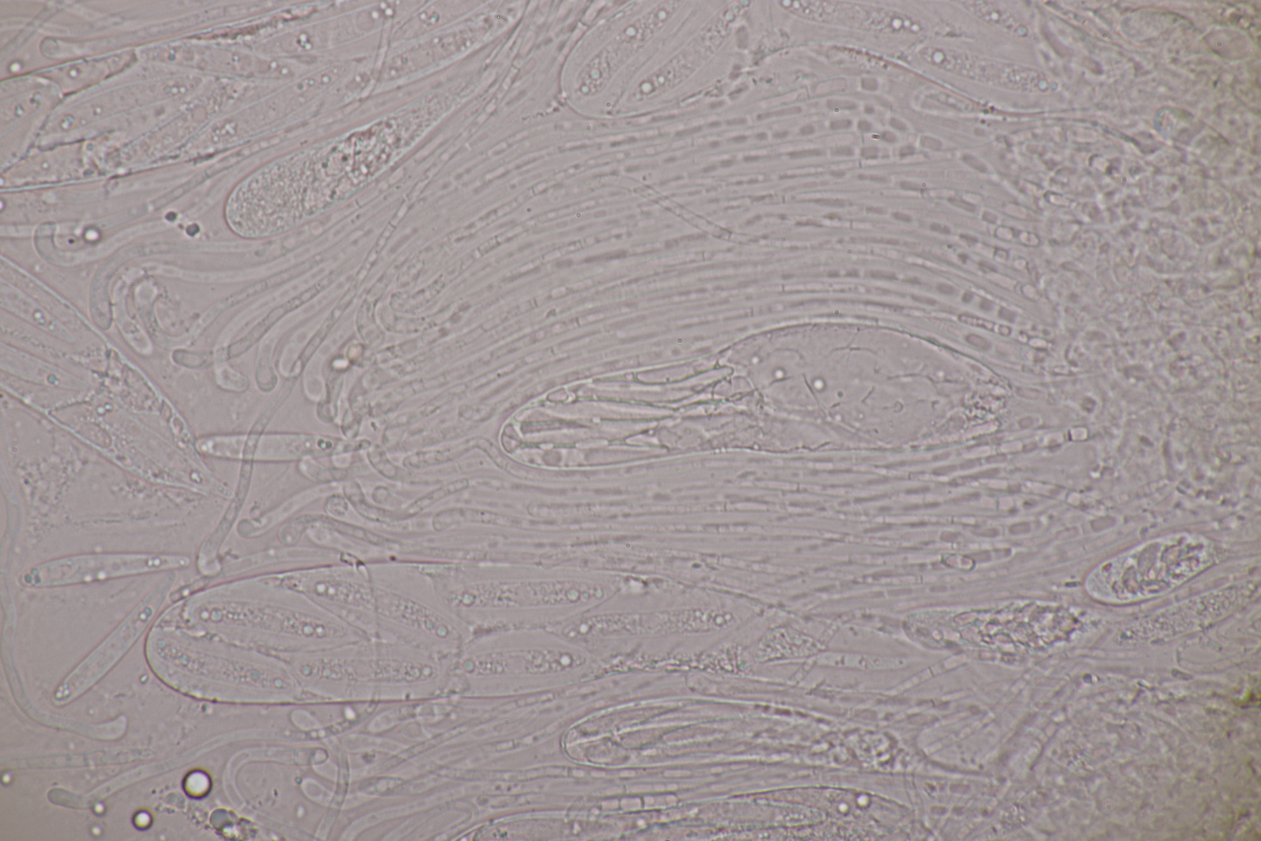 2. Ein weißer Heterobasidiomycet. Im Subikulum sind recht dickwandige, breite Zellen mit Schnallen vorhanden, dazu auriculariode Basidien mit vier langen Sterigmen. Mit dem Phragmoschlüssel der Niederländer lande ich dann bei Colacogloea effusa. Der soll aber an Peniophorella praetermissa parasitieren und die ist hier weit und breit nicht zu sehen.