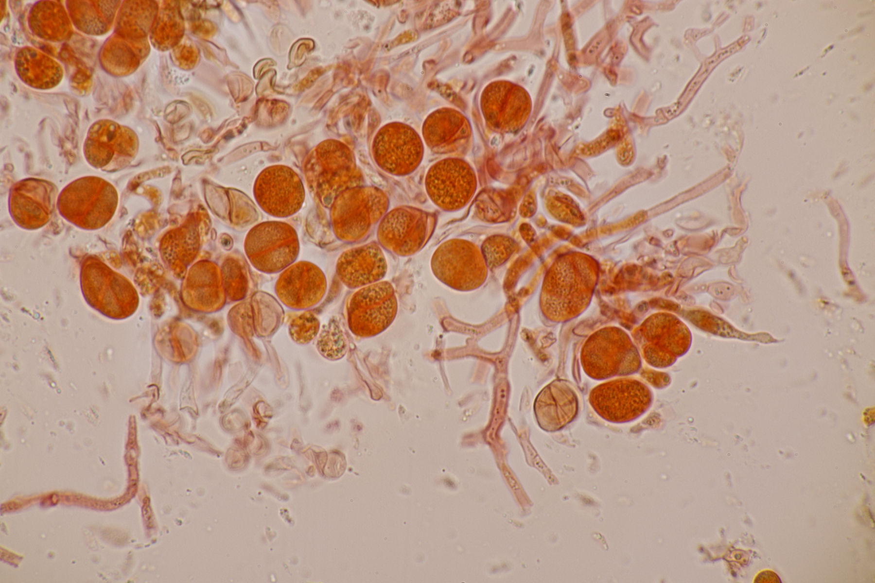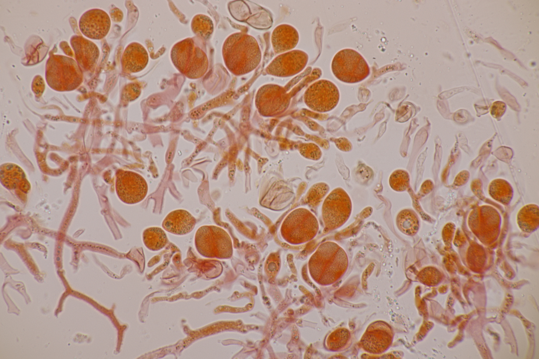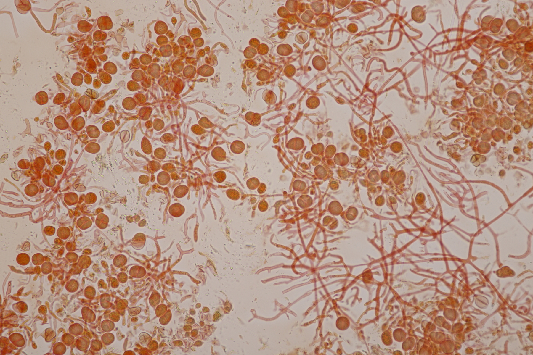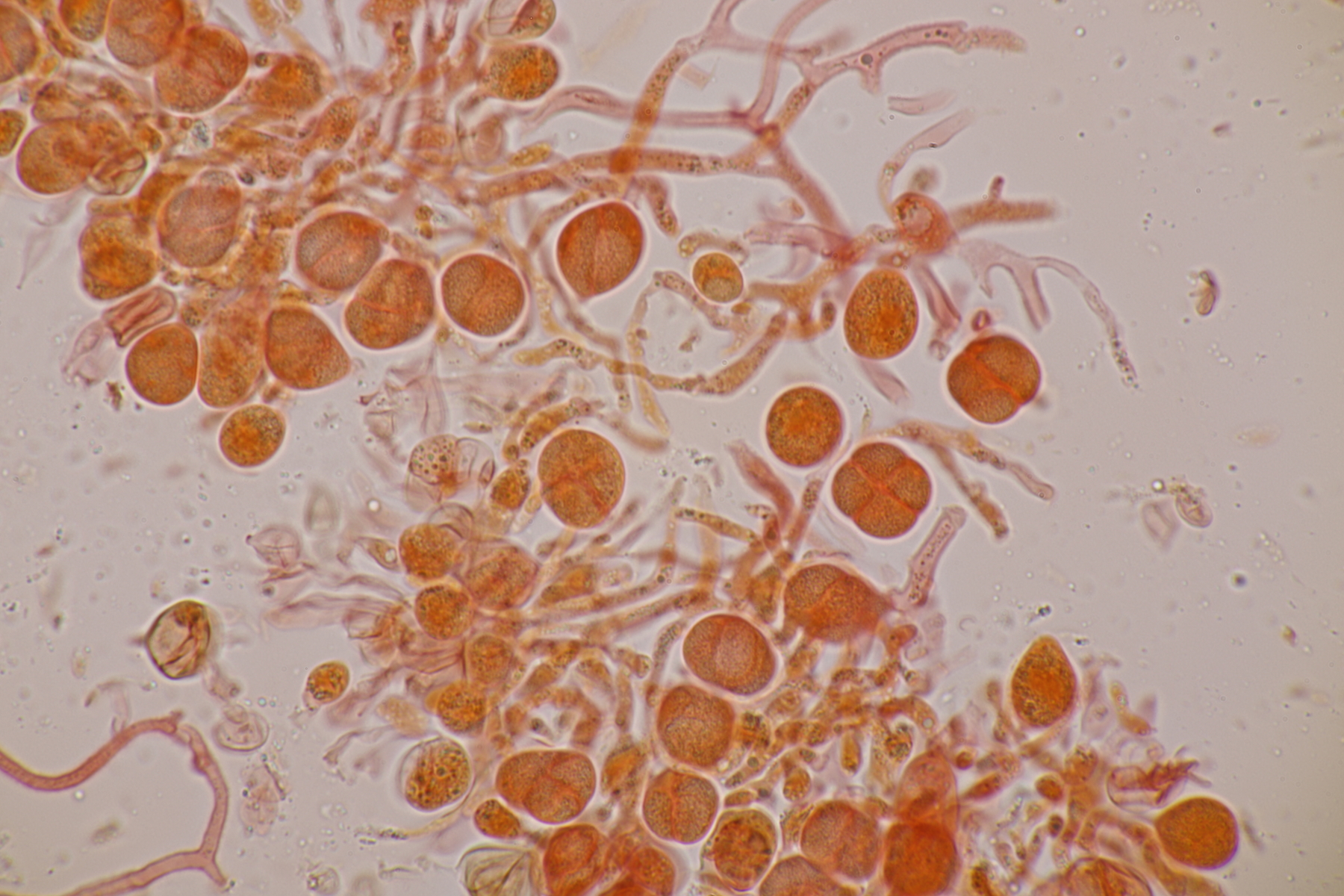 1. Phaeotremella frondosa. Das Exsikkat bräunt zwar, aber die Sporen messen 9.1+-0.6 x 6.5+-0.5, Q=1.4+-0.1, 7.5-10.5 x 5.4-7.3, Q=1.2-1.7