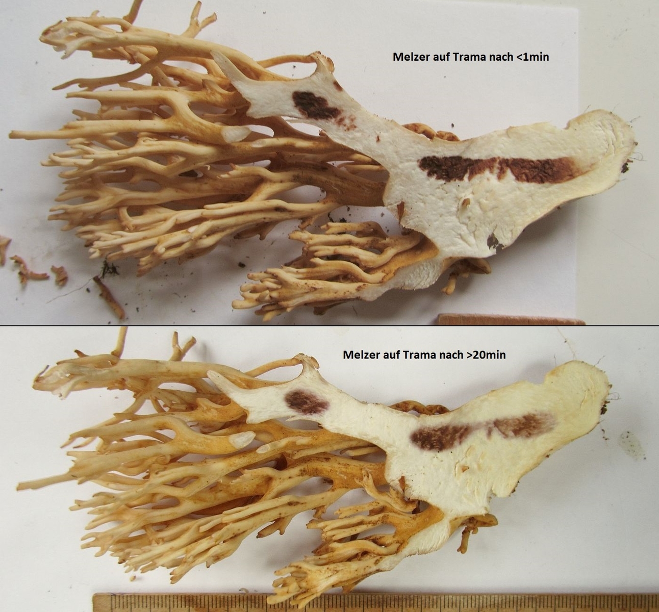 Da die drei Hahnenkämme aber die einzigen Korallen mit spiralig - rippigem Sporenornament sind, und R. botrytis dabei die einzige Art mit Sporen bis >15µm ist, ließ sich das dennoch bestimmen.