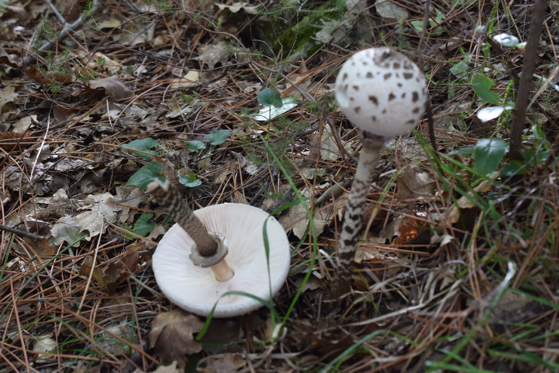 Fundort Mediterranraum . Unten Kiefern und Steineiche gefunden . Stielmuster dunkel fast schwarz . Nur diese 2 Exemplaren , etwas weiter ( ca 30 Meter ) noch ein paar Macrolepiota aber andere Art