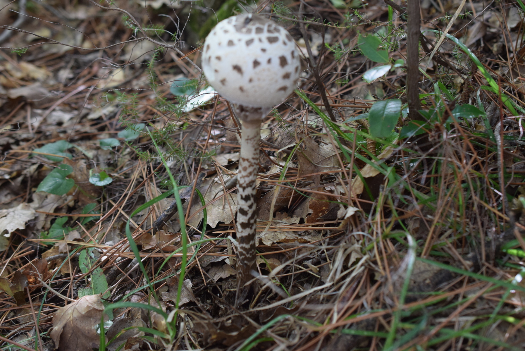 Hallo Macrolepiota sp. Fundort Mediterranraum . Unten Kiefern und Steineiche gefunden . Stielmuster dunkel fast schwarz . Nur diese 2 Exemplaren , etwas weiter ( ca 30 Meter ) noch ein paar Macrolepiota aber andere Art - - - Kennt jemand ? LG