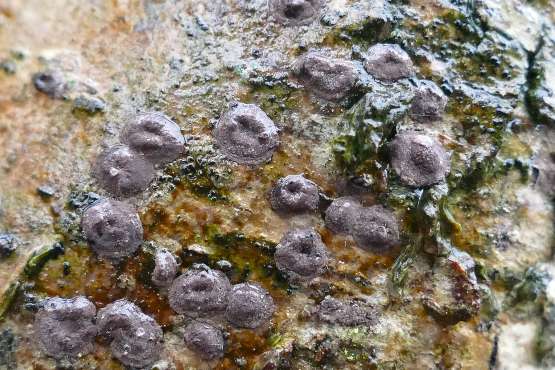 am einem Busch in einem Hain befinden sich an einem der abgestorbenen Stämme in etwa 1 - 1,5 m Höhe violette 3 - 5 mm große Objekte, welche gut Pilze sein könnten.