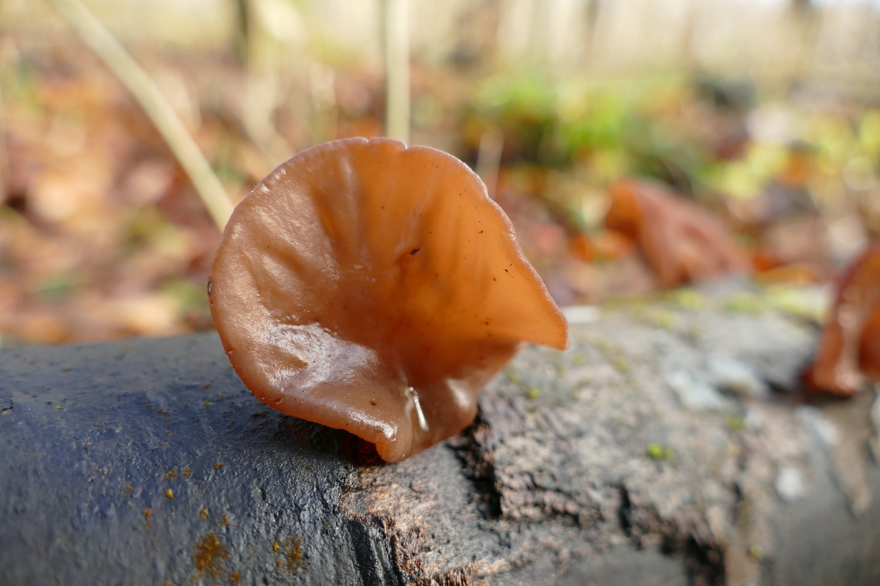 Beim ersten Fund (liegender Laubholzstamm) bin ich mir recht sicher, Auricularia auricula-judae gefunden zu haben.