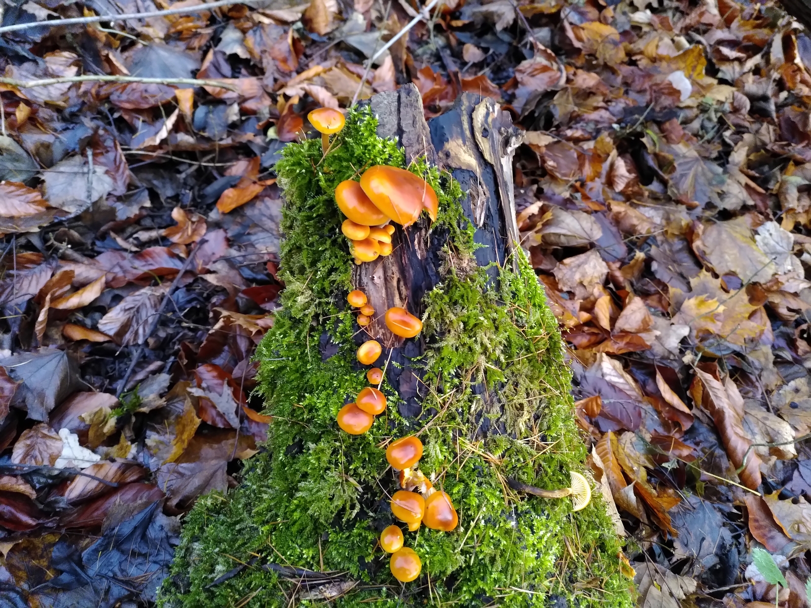 gerade eben im Buchenwald habe ich auf Totholz Pilze gefunden, die sehr nach Samtfußrüblingen aussehen, allerdings sind die Stiele völlig gelb ohne braunen Samt. Nur der Teil des Stiels, der im Substrat gesteckt hat, ist vom Substrat etwas schwärzlich, aber als samtig würde ich das nicht bezeichnen. Ansonsten haben die Pilze einen orangefarbenen, klebrigen, am Rand etwas helleren Hut und einen trockenen orangenen Stiel mit weißlichem Fleisch sowie gelbliche, leicht aufsteigend angewachsene Lamellen. Was meint ihr dazu? Ist das Flammulina velutipes und sieht der typischerweise so aus? Danke für die Hilfe.