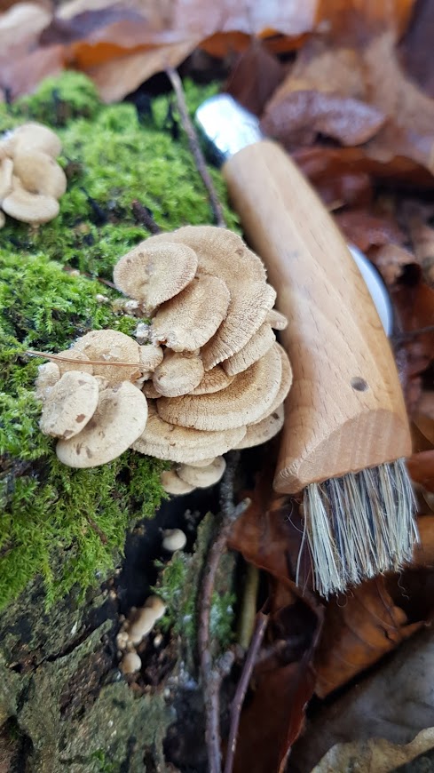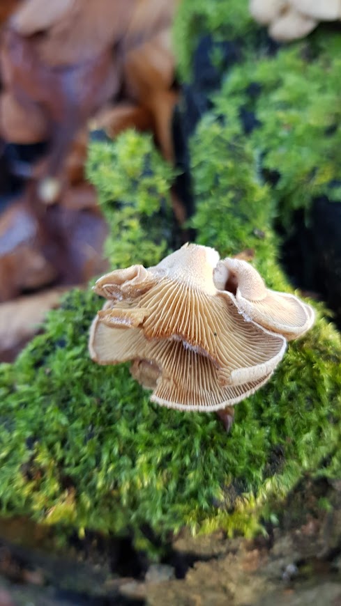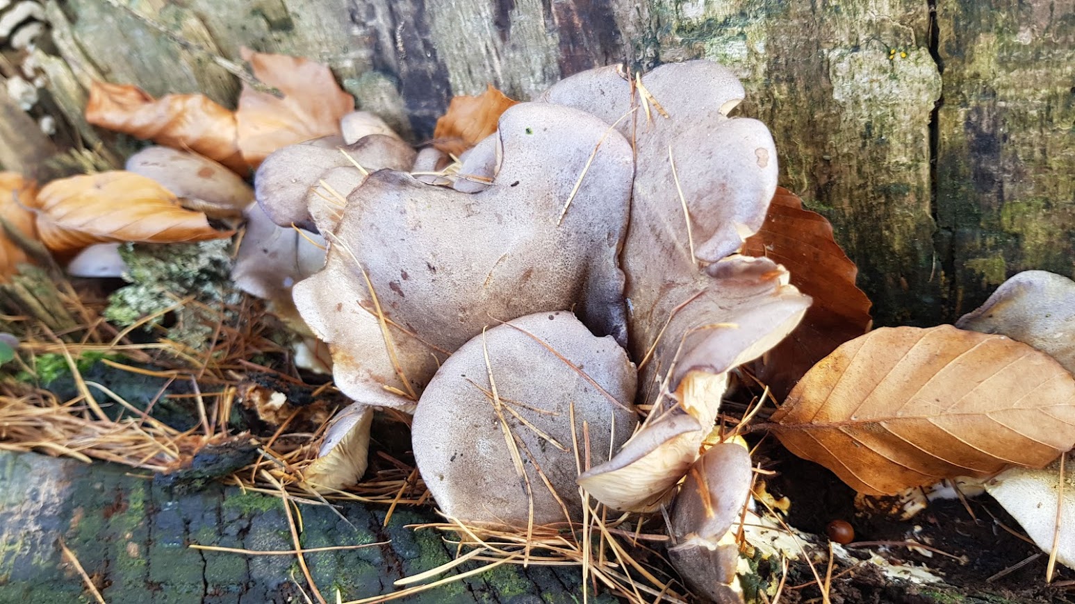 Die Pilze wuchsen an Buche. Da die Hüte doch irgendwie olivgrüne Farbtöne aufweisen (auch wenn das auf den Fotos nicht so klar erkennbar ist) und die Unterseiten gelblich erscheinen, bin ich mir nicht sicher, ob es sich um Austernseitlinge oder Gelbstielige Muschelseitlinge handelt. Irgendwie habe ich auch noch nirgends einen Hinweis gefunden, wie man die beiden Arten zweifelsfrei voneinander unterscheiden kann.