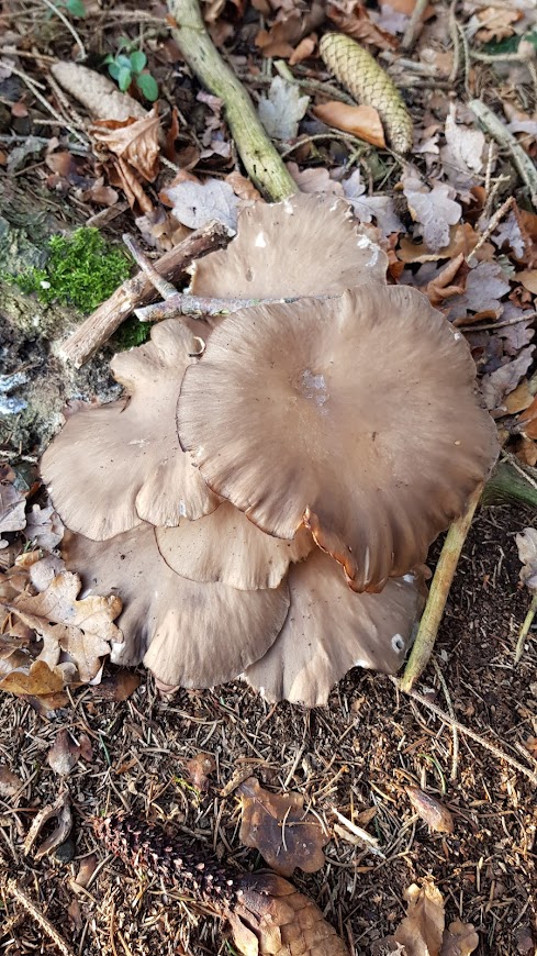 3. Bei dem letzten Pilz komme ich mit der Bestimmung überhaupt nicht weiter. Er wuchs büschelig an der Wurzel einer Fichte. Der einzelne Fruchtkörper auf dem Foto hat einen Durchmesser von ca. 15 cm. Der Pilz riecht ziemlich penetrant. (Für diejenigen, die sich damit auskennen: Der Geruch ist ziemlich identisch mit dem Geruch, den einige Wasserschildkrötenarten, z. B. Moschusschildkröten und Chinesische Dreikielschildkröten,abgeben, wenn sie sich gestört fühlen. Anders kann ich es leider nicht beschreiben).