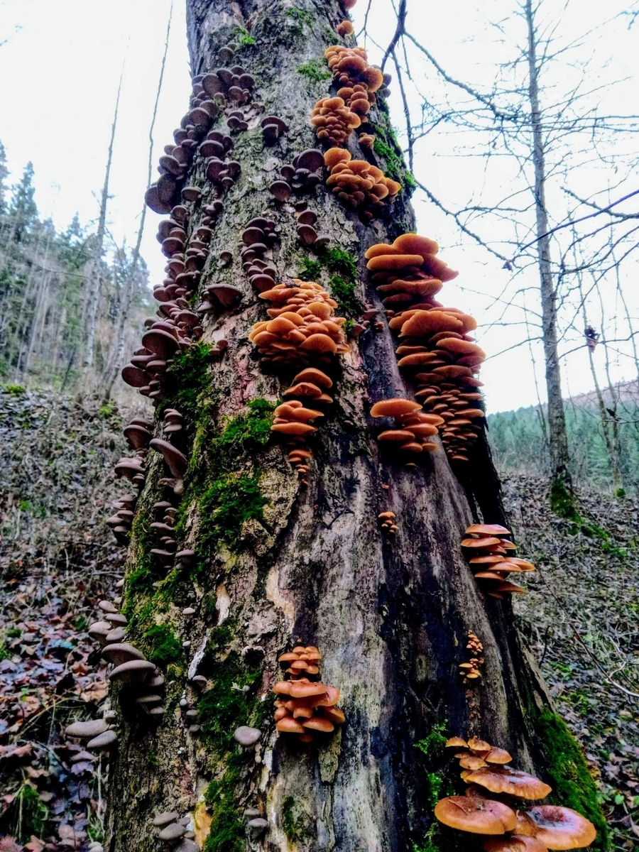 Und weil ihr so freundlich seid, euch den Kopf über den Rindenpilz zu zerbrechen, zeige ich euch gleich noch einen grandiosen Baumstamm. Ich habe so ein üppiges Wachstum von Austernseitlingen und Samtfußrüblingen am selben Stamm noch nie gesehen. Leider hab ich ihn nicht selbst entdeckt. Aber auch, wenn man selbst nicht von den Pilzen profitieren kann, ist zumindest der Anblick des Baumes ein Augenschmaus.