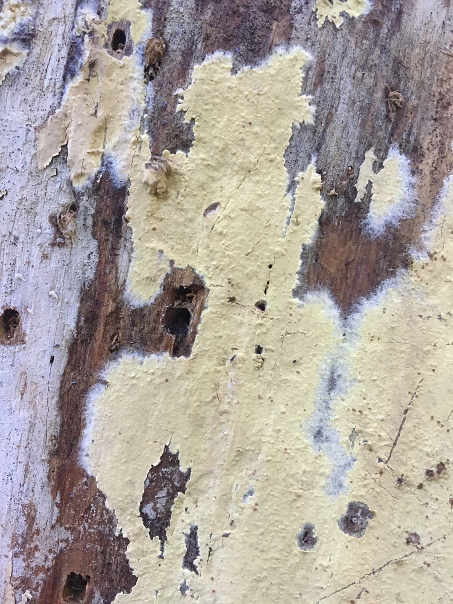 ich habe am 22. Mai 2021 an einer stehenden abgestorbenen Föhre einen Rindenpilz gefunden, der mich allein aufgrund seines großflächigen Wachstums interessiert. Der Pilz wuchs über mehrere Meter an diesem entrindeten Stamm und hat eine gelbliche Farbe. Die Föhre befindet sich im Randbereich eines Hochmoores.