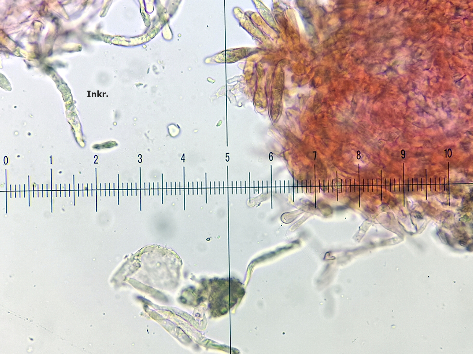 Haben denn nicht alle Täublinge mit Hutbereifung auch Inkrustierungen? R. fageticola hat doch gar keine Inkrustierungen und wäre damit doch eine Fehlbestimmung! Hier die vorhandenen Mikroaufnahmen: