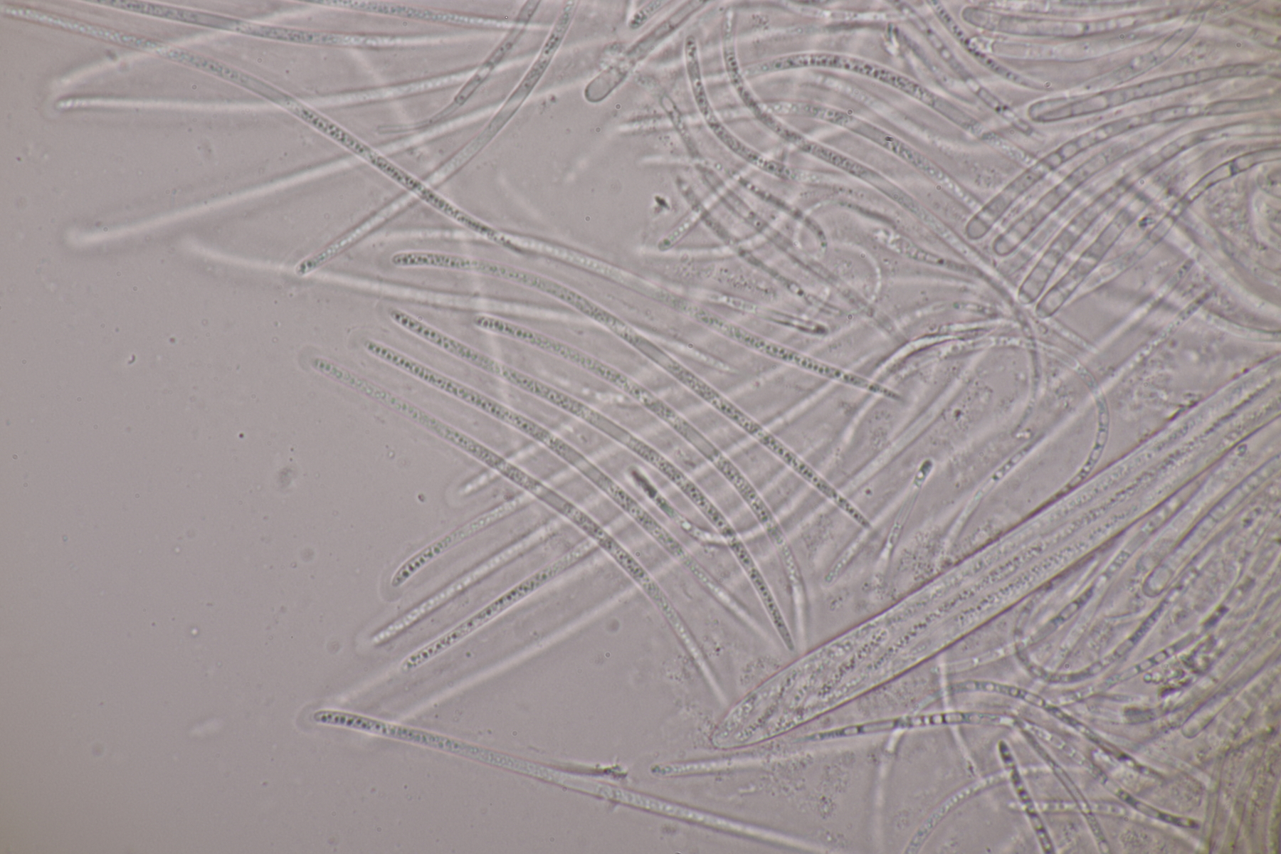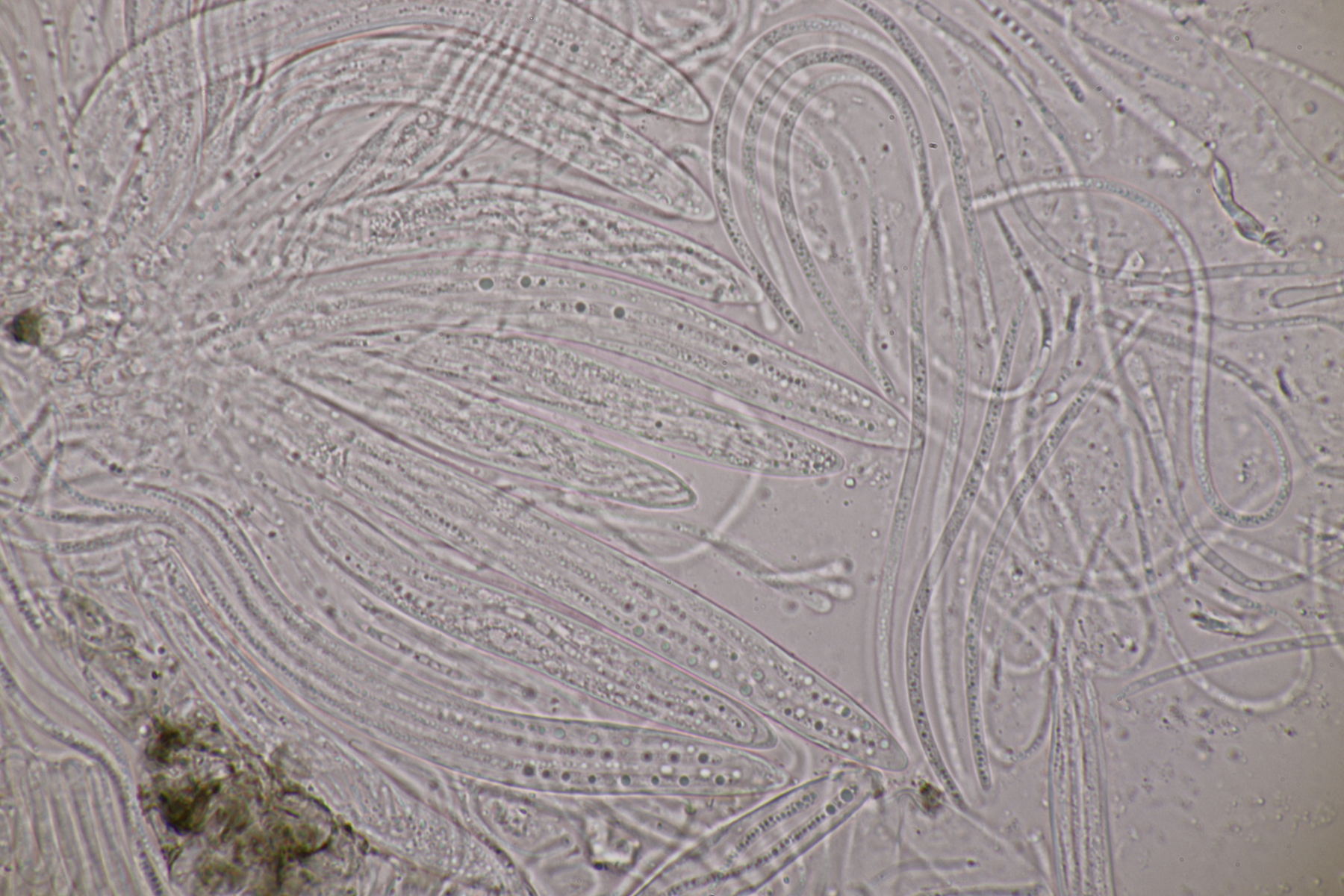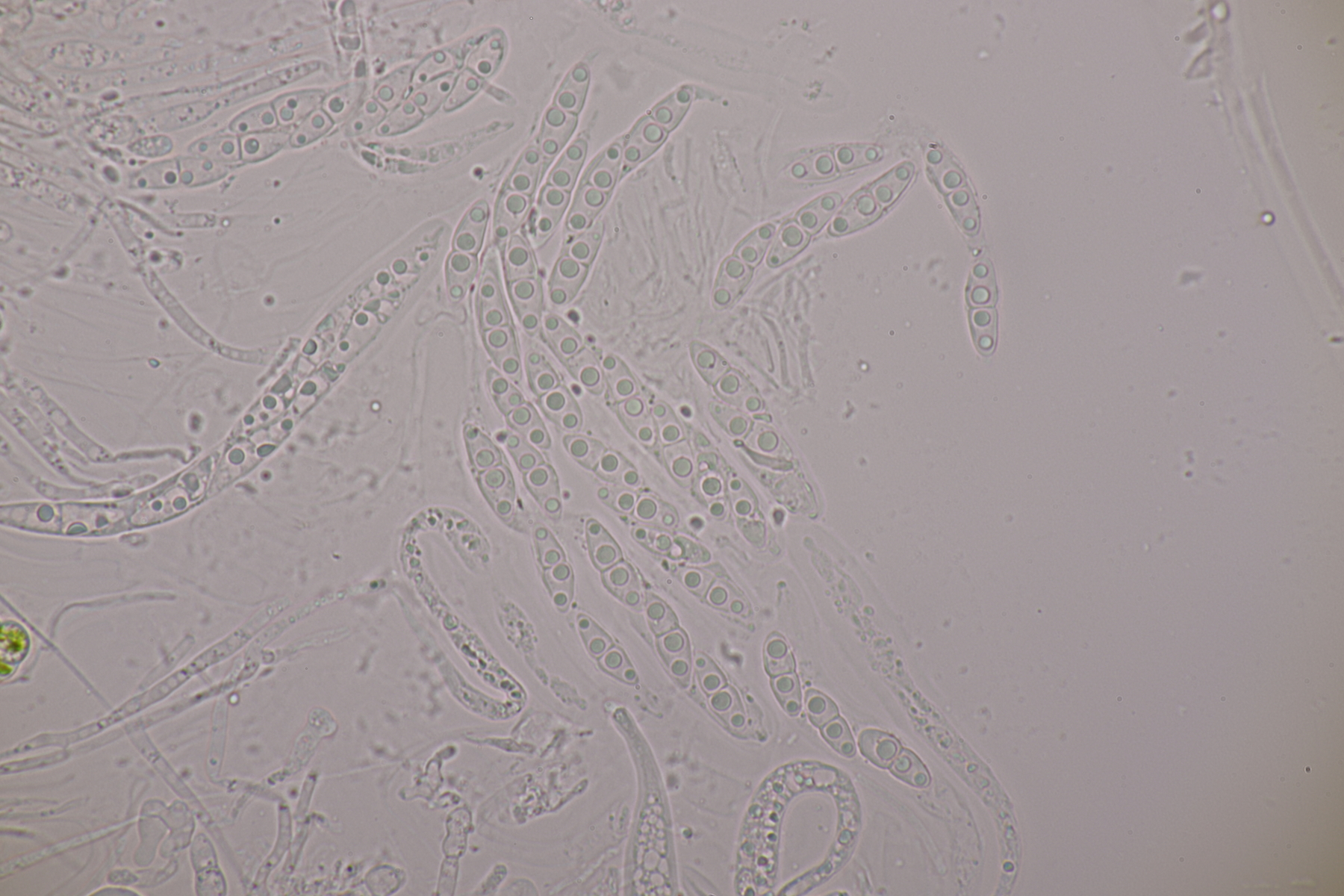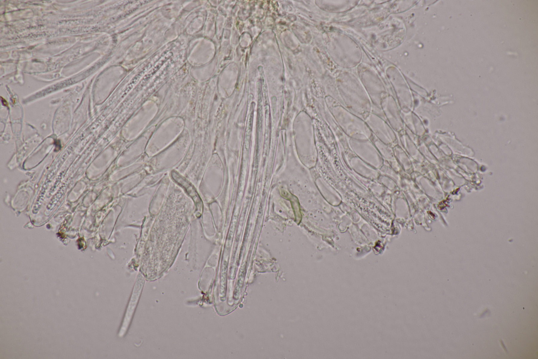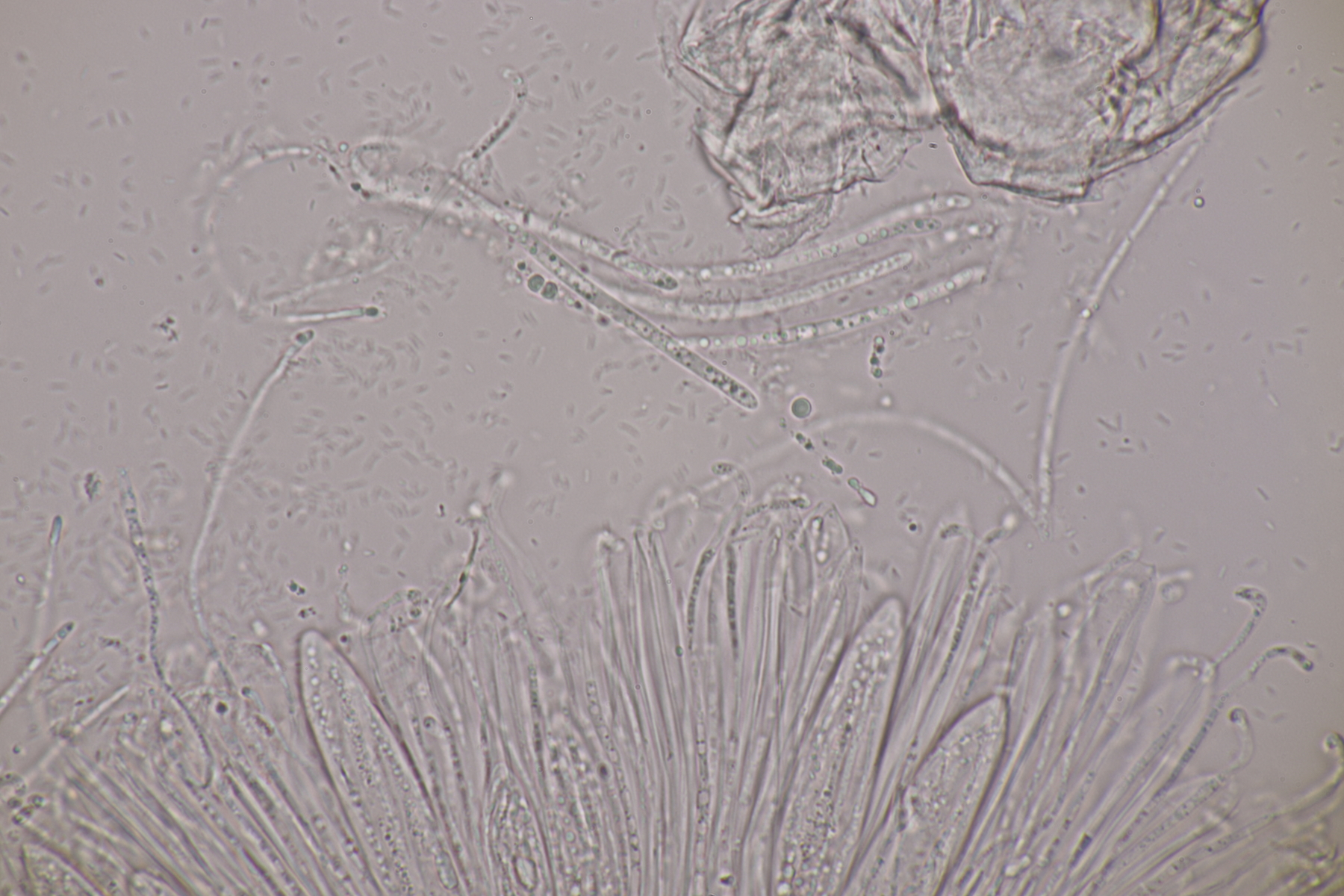 3. Dendrostoma leiphaemia mit Sporen von 17-20.5 x 5-5.5 µm und kongophilem Apikalapparat an Eiche.