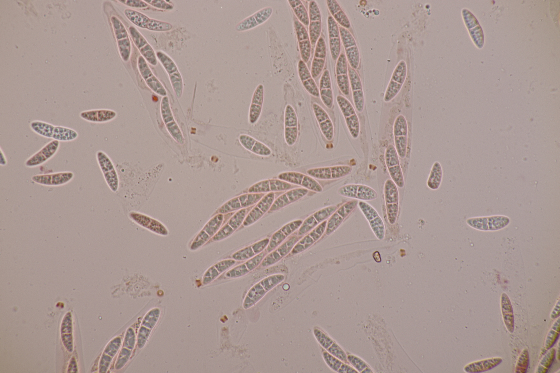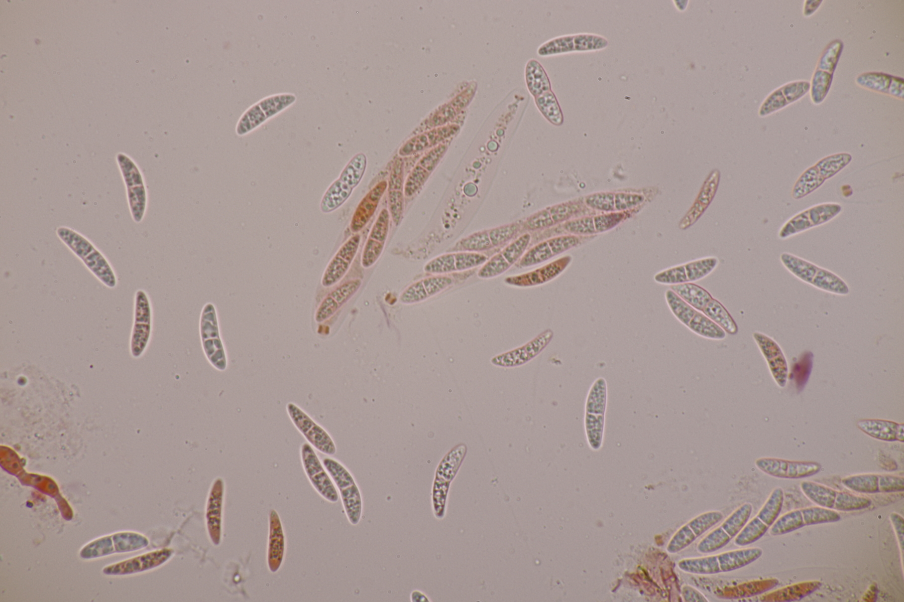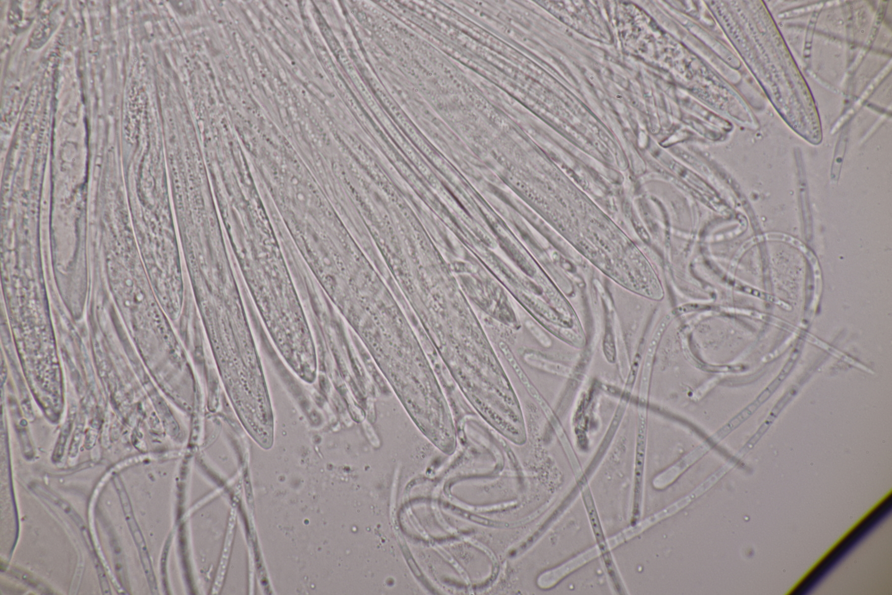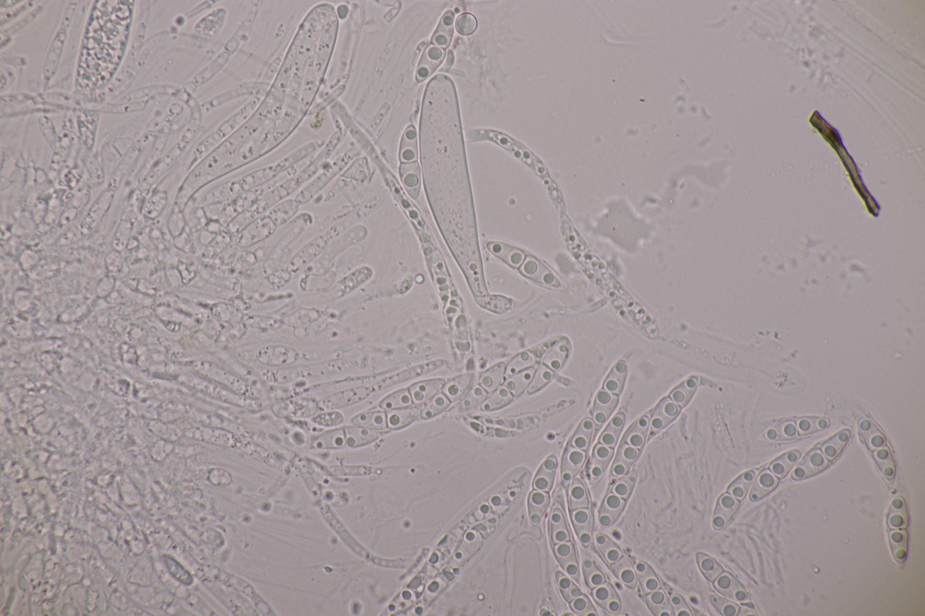 3. Dendrostoma leiphaemia mit Sporen von 17-20.5 x 5-5.5 µm und kongophilem Apikalapparat an Eiche.