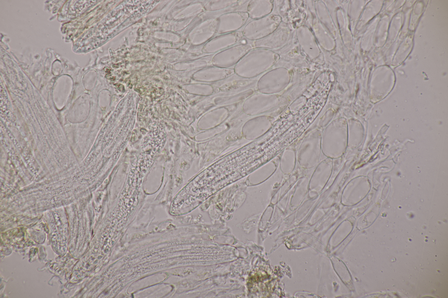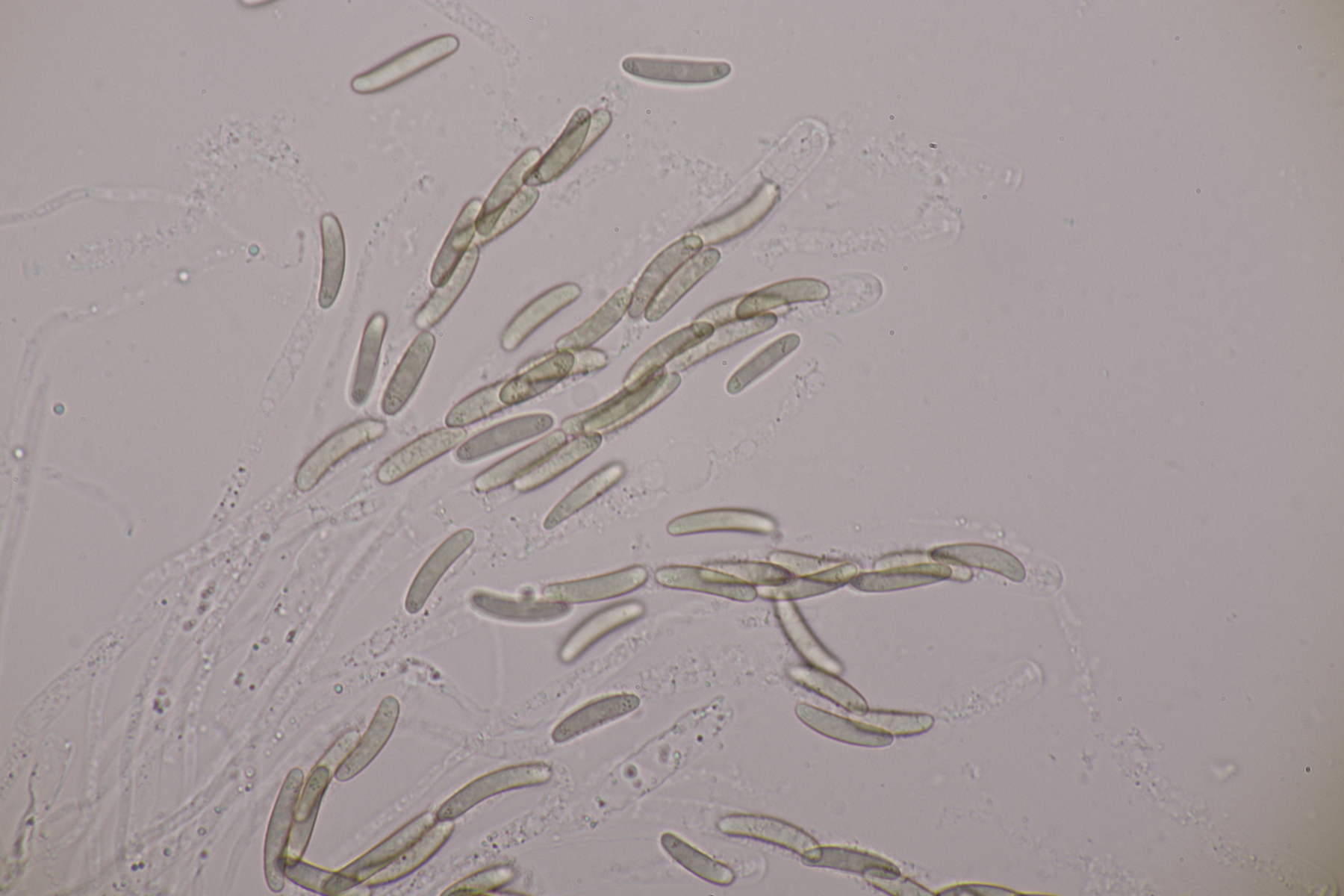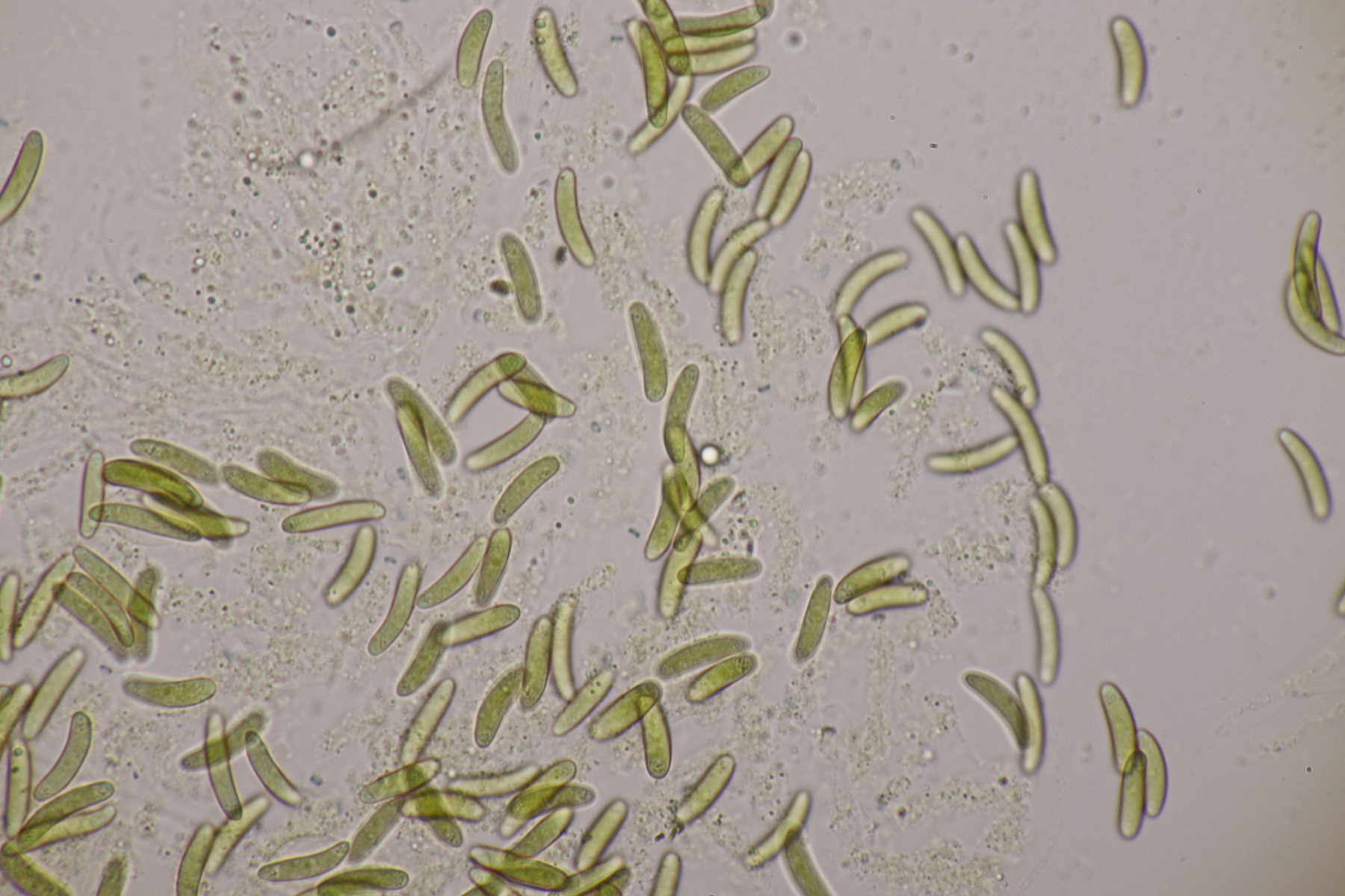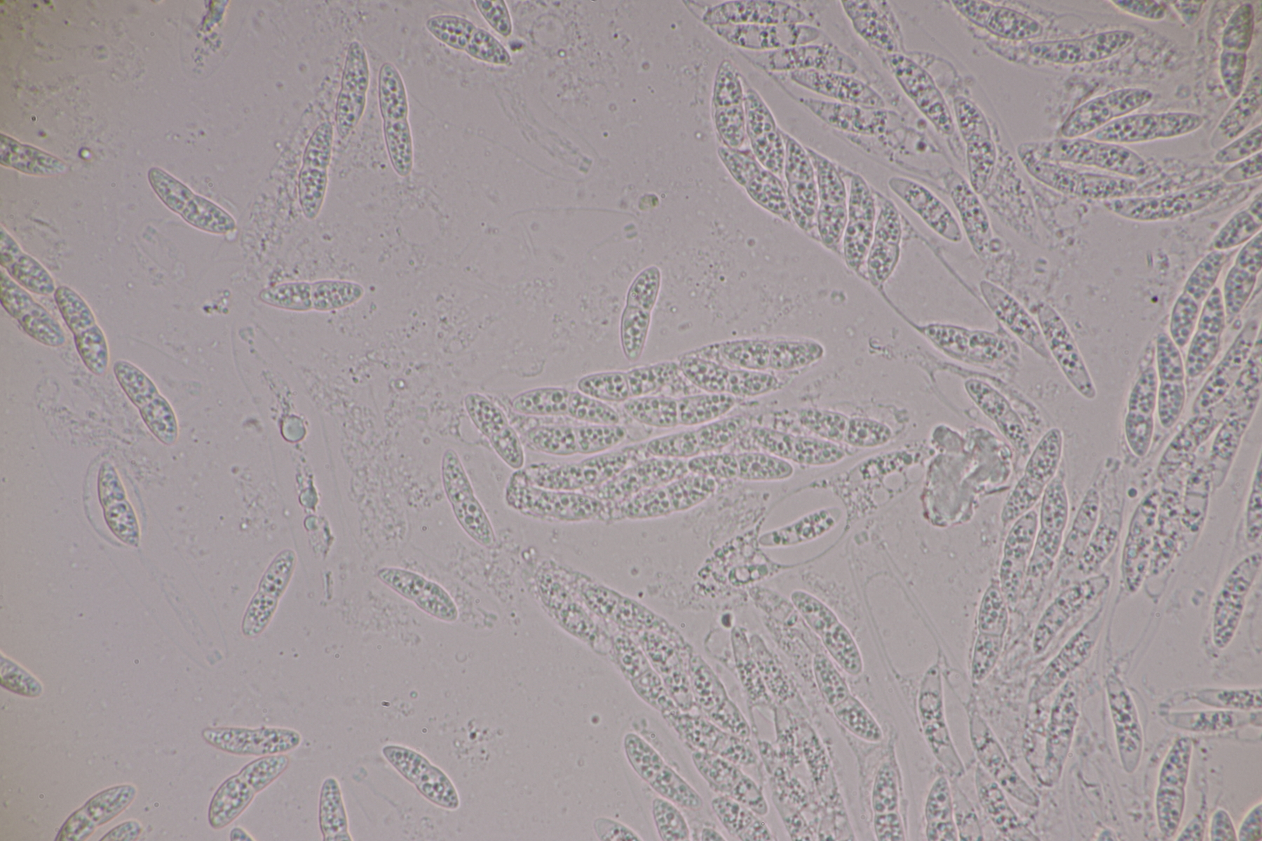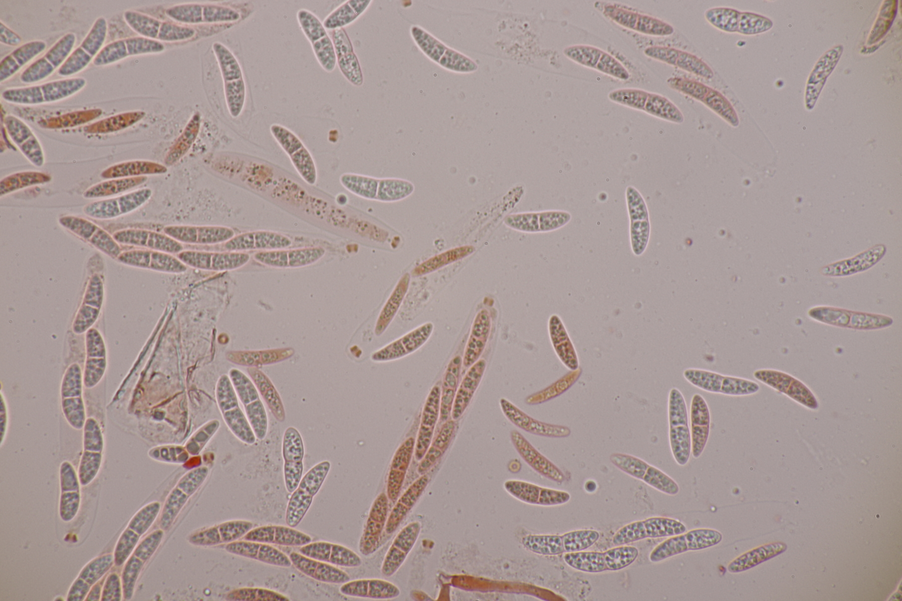 3. Dendrostoma leiphaemia mit Sporen von 17-20.5 x 5-5.5 µm und kongophilem Apikalapparat an Eiche.