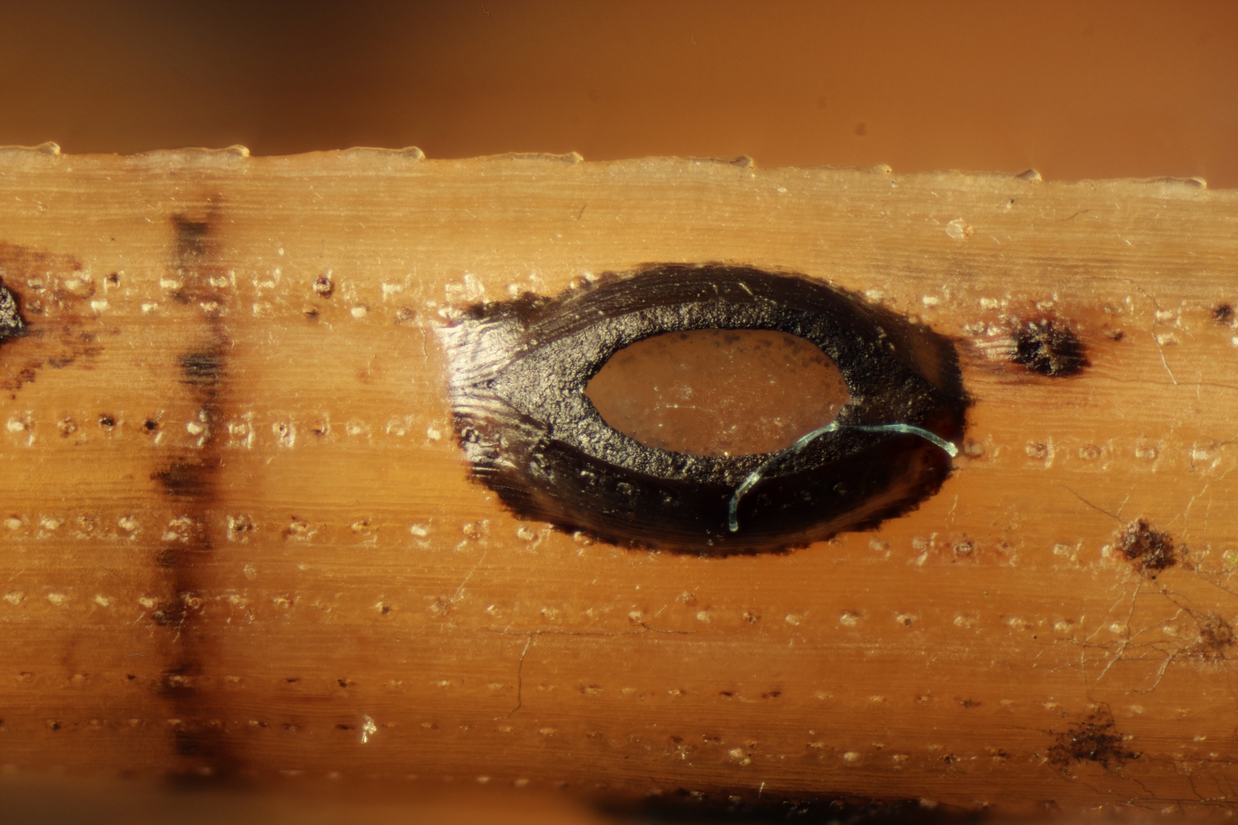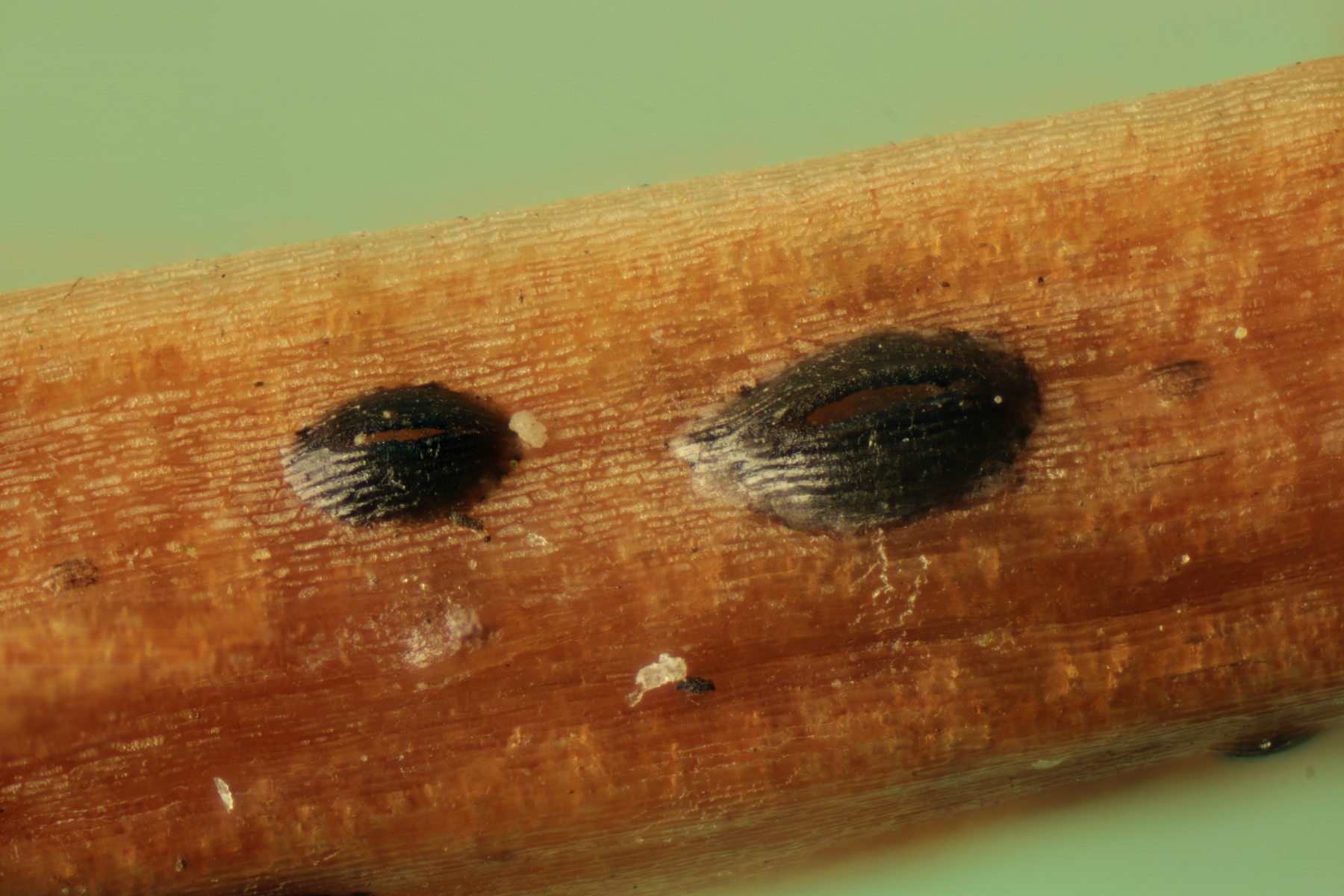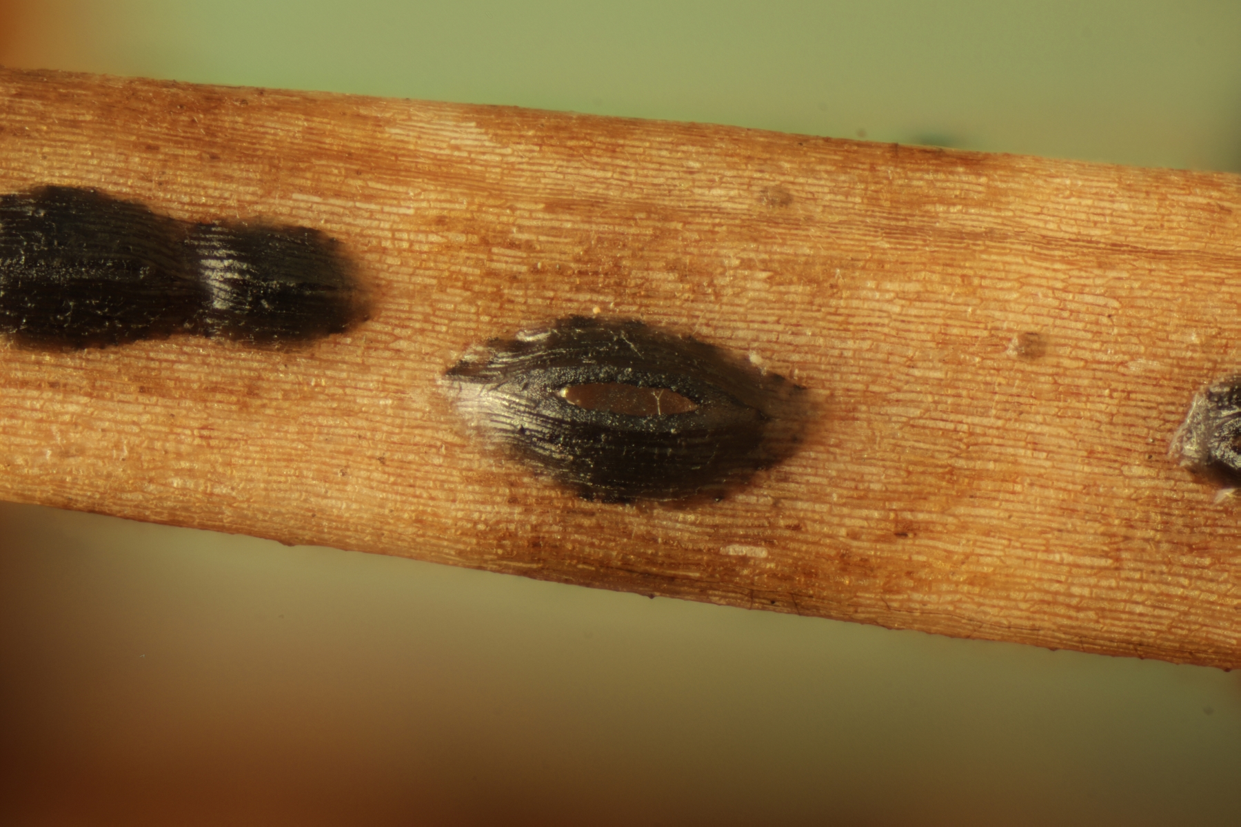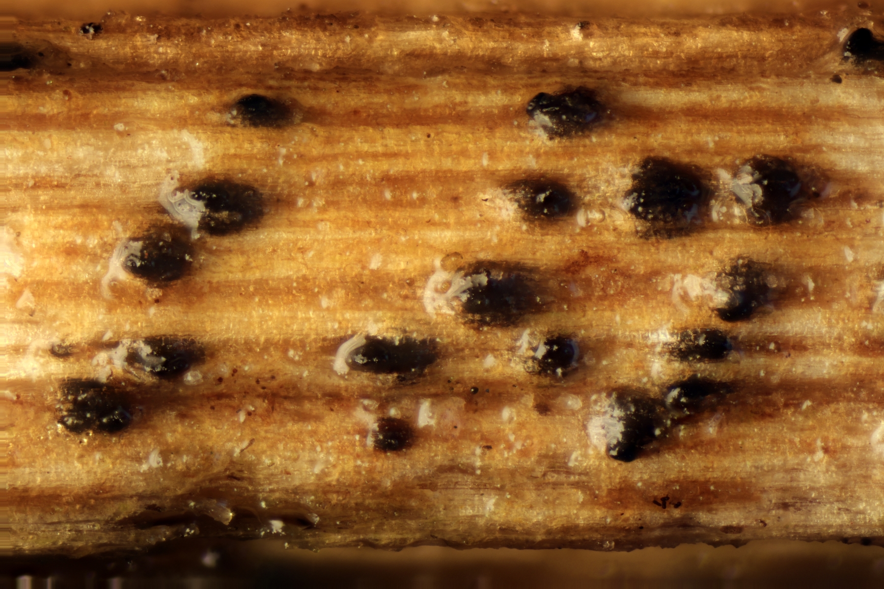 4. Lophodermium pinastri an Pinus sylvestris. Auch wenn die Lippen nicht rotbraun sind, lassen die Sporenlängen von ~100 µm und die Demarkationslinien hier nichts anderes zu.