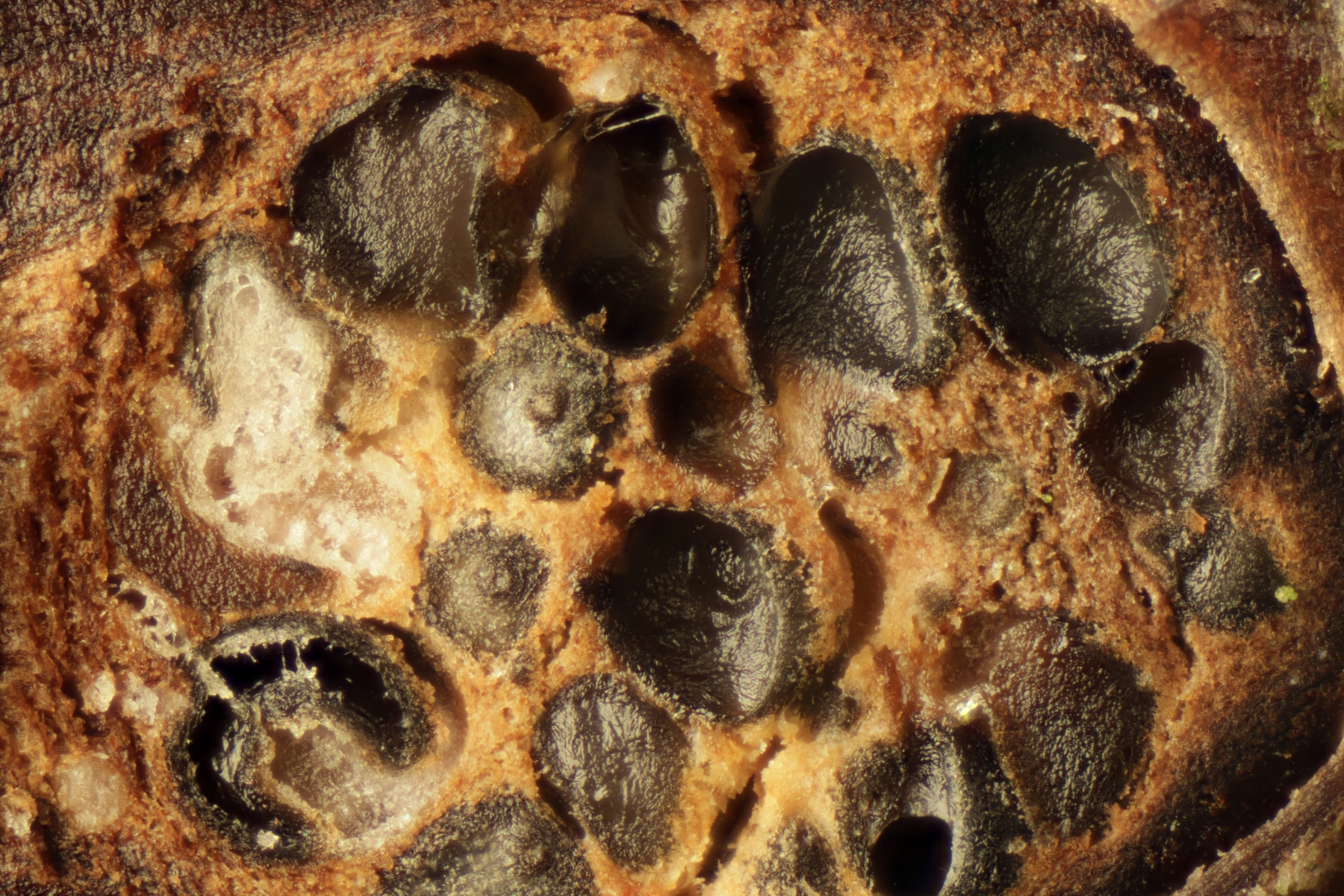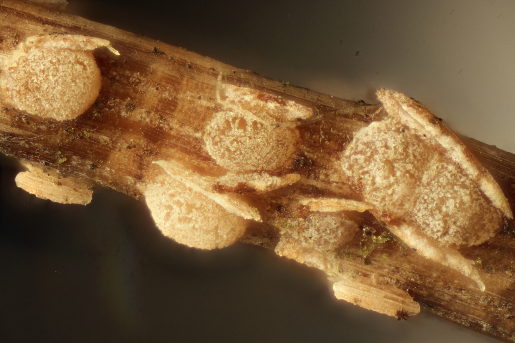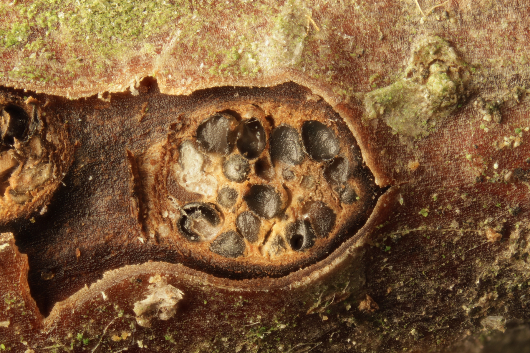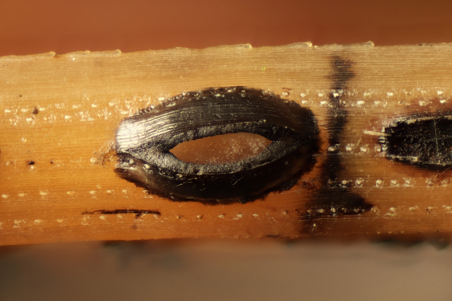 4. Lophodermium pinastri an Pinus sylvestris. Auch wenn die Lippen nicht rotbraun sind, lassen die Sporenlängen von ~100 µm und die Demarkationslinien hier nichts anderes zu.