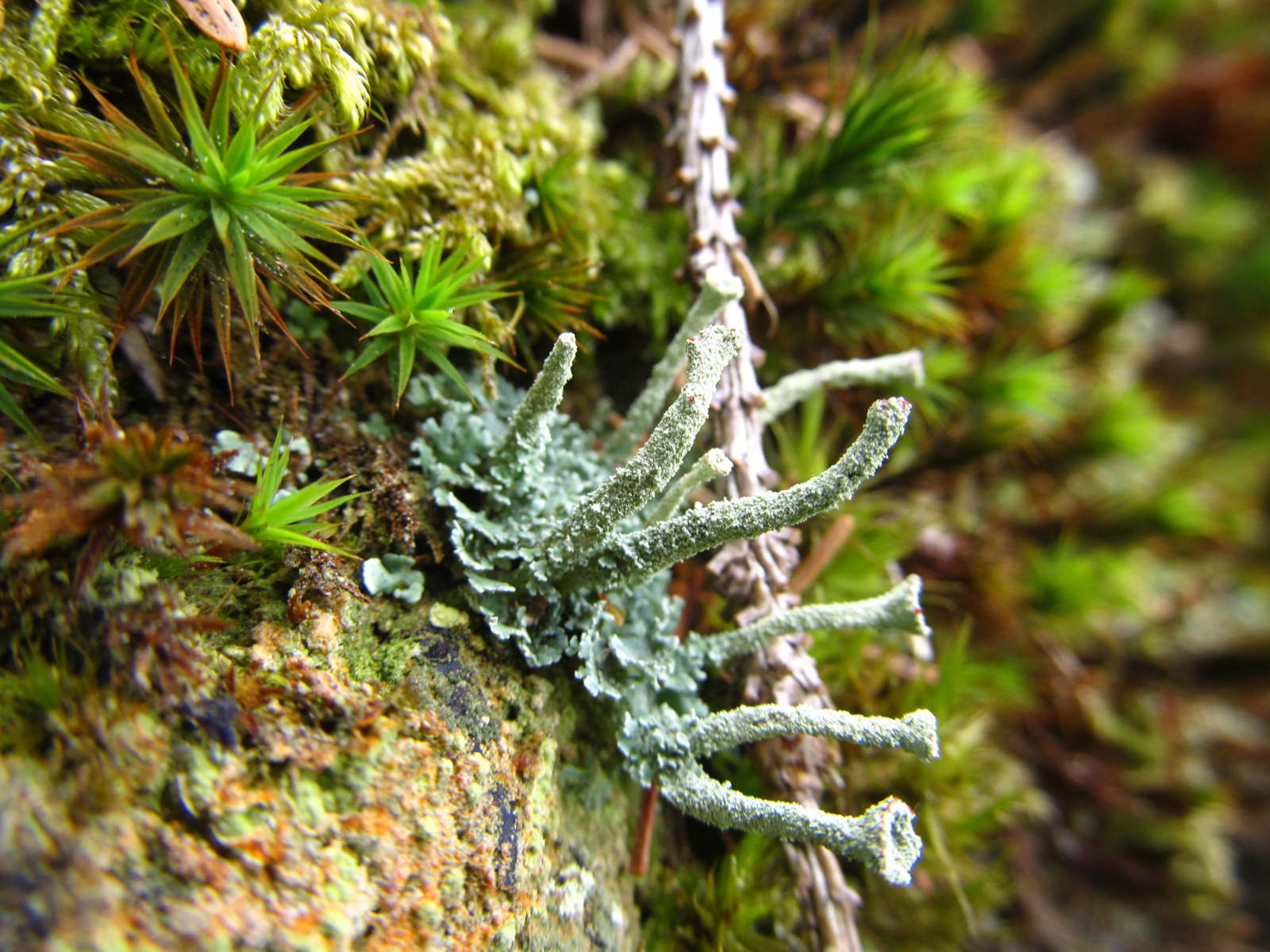 Und zwar sieht man auf deinem dritten Foto genau ein Podetium einer Becherflechte (Cladonie).