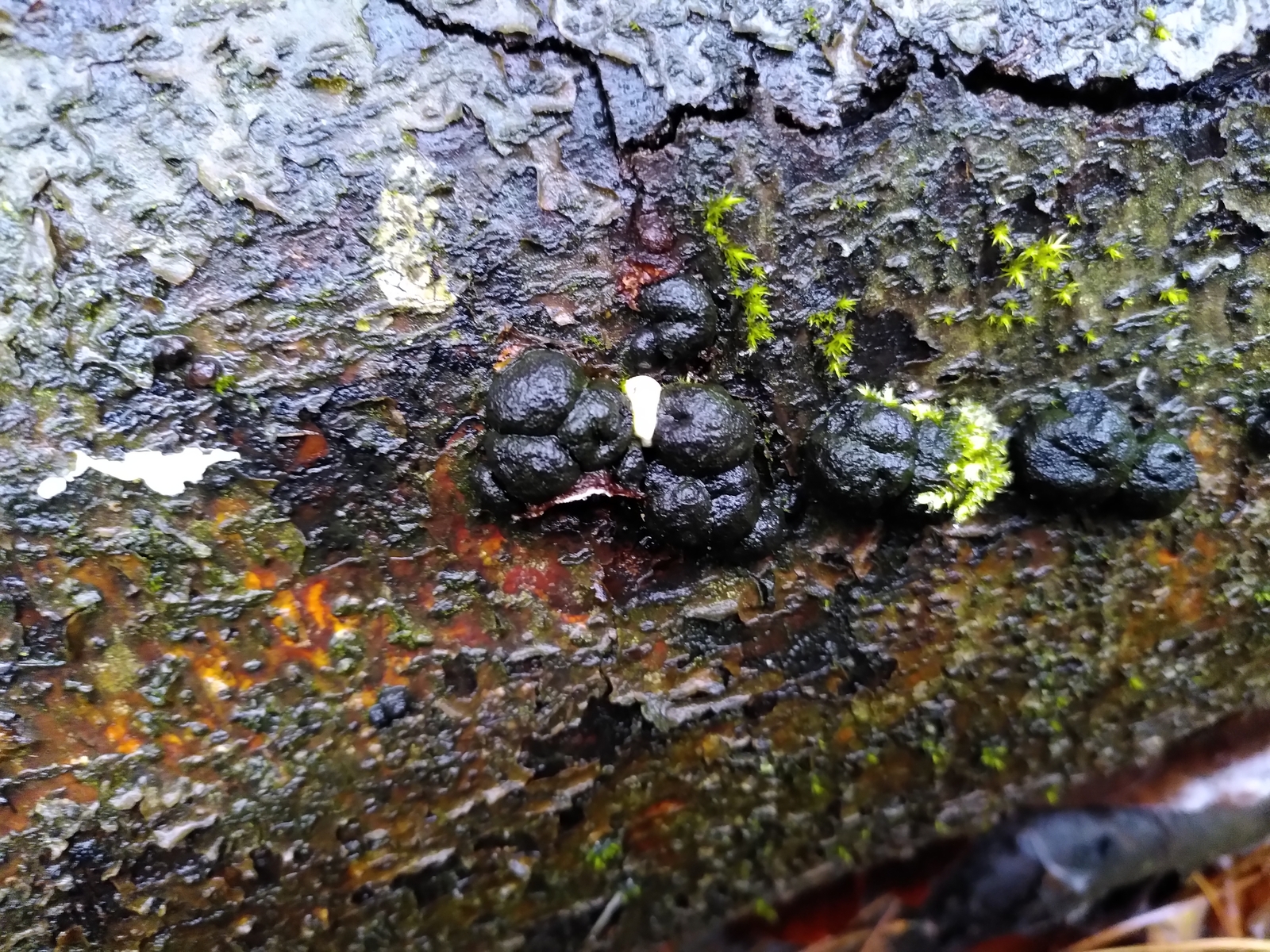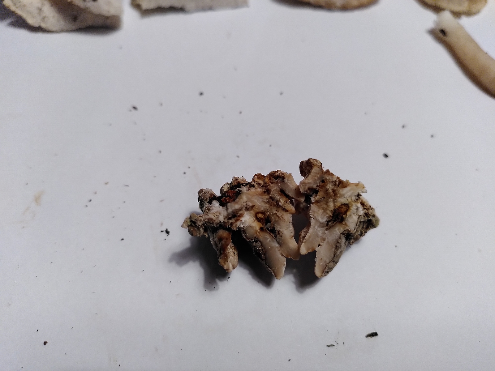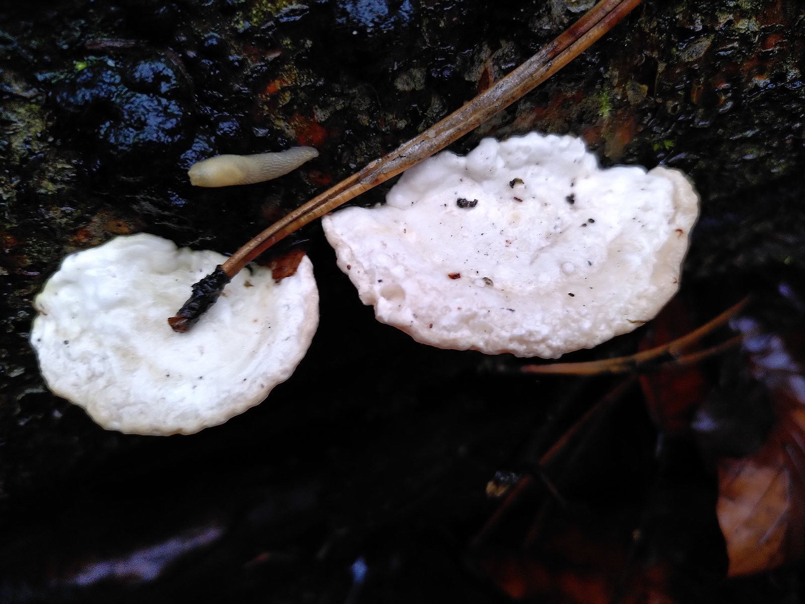 4)Ein in allen Teilen weißer, weicher Porling mit sehr feinen Röhren und unauffälligem Geruch. Da bin ich definitiv überfragt. Ein Bild vom Substrat (Nadelholz?) ist auch dabei: