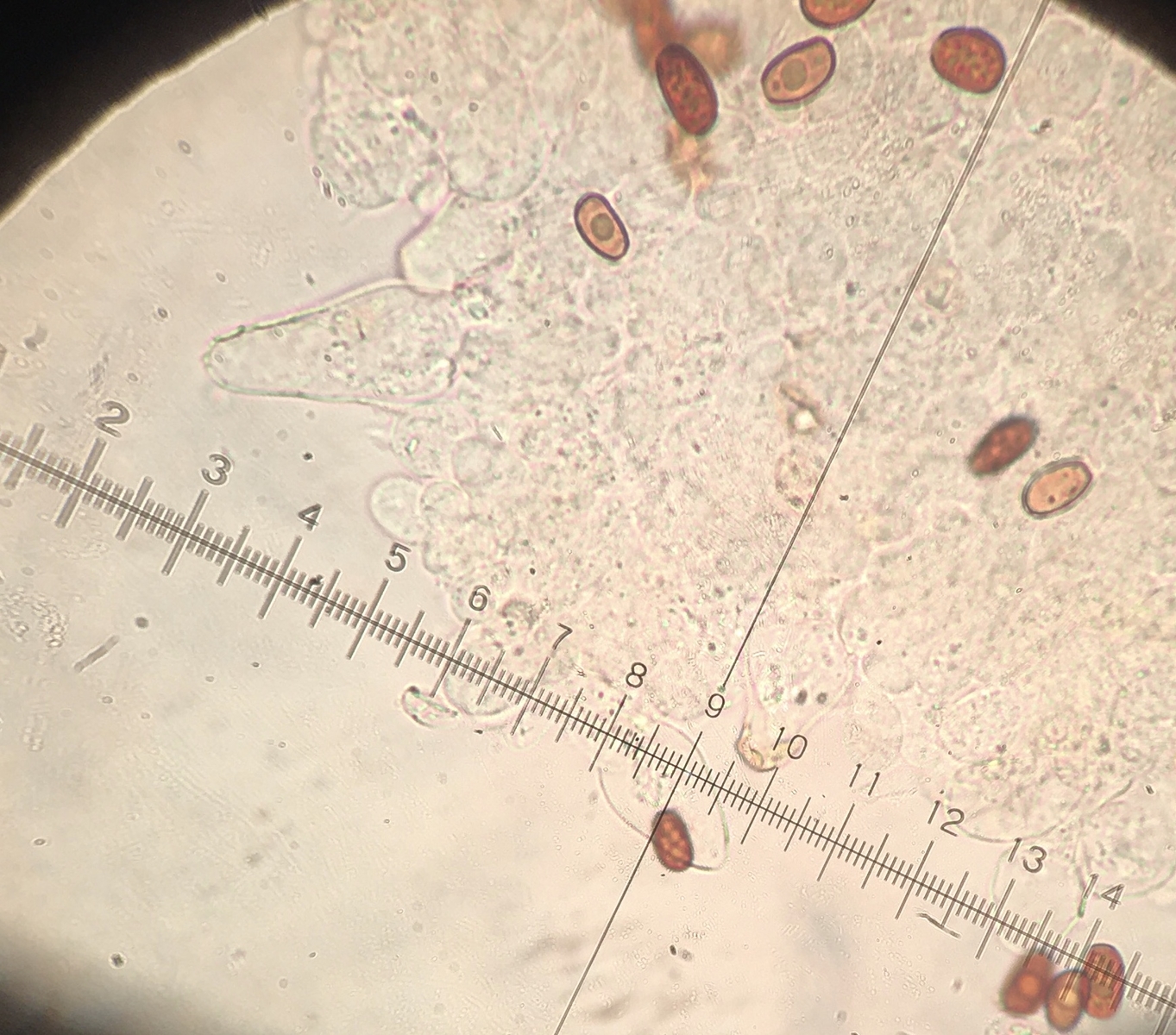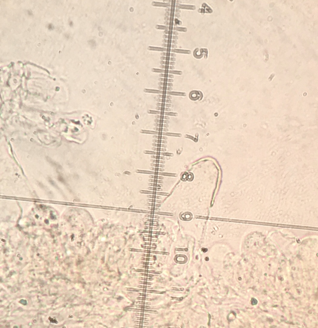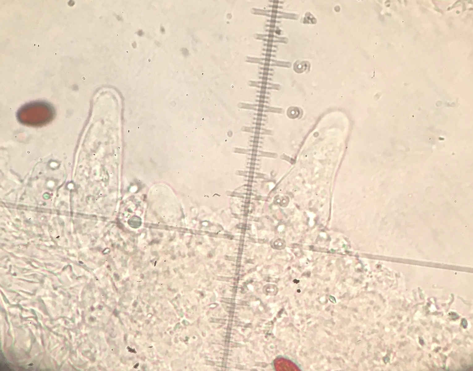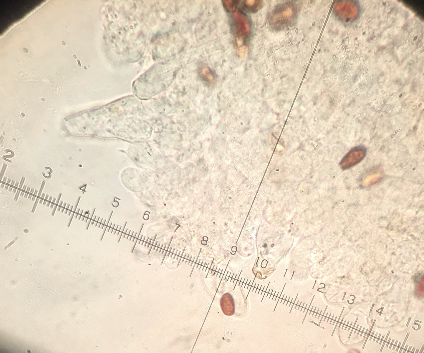 Die Sporenmaße sind 7,5 - 9 x 4 - 5, die Pleurozystiden messen ca. 50 x 18. Ich habe auch etwas, das ich für Velum am Hutrand gehalten habe, mikroskopiert, doch dabei könnte es sich auch um angeklebtes Papier gehandelt haben, denn es wirkt nicht wirklich pilzlich.