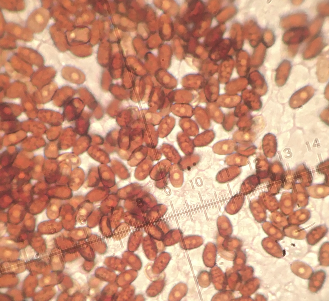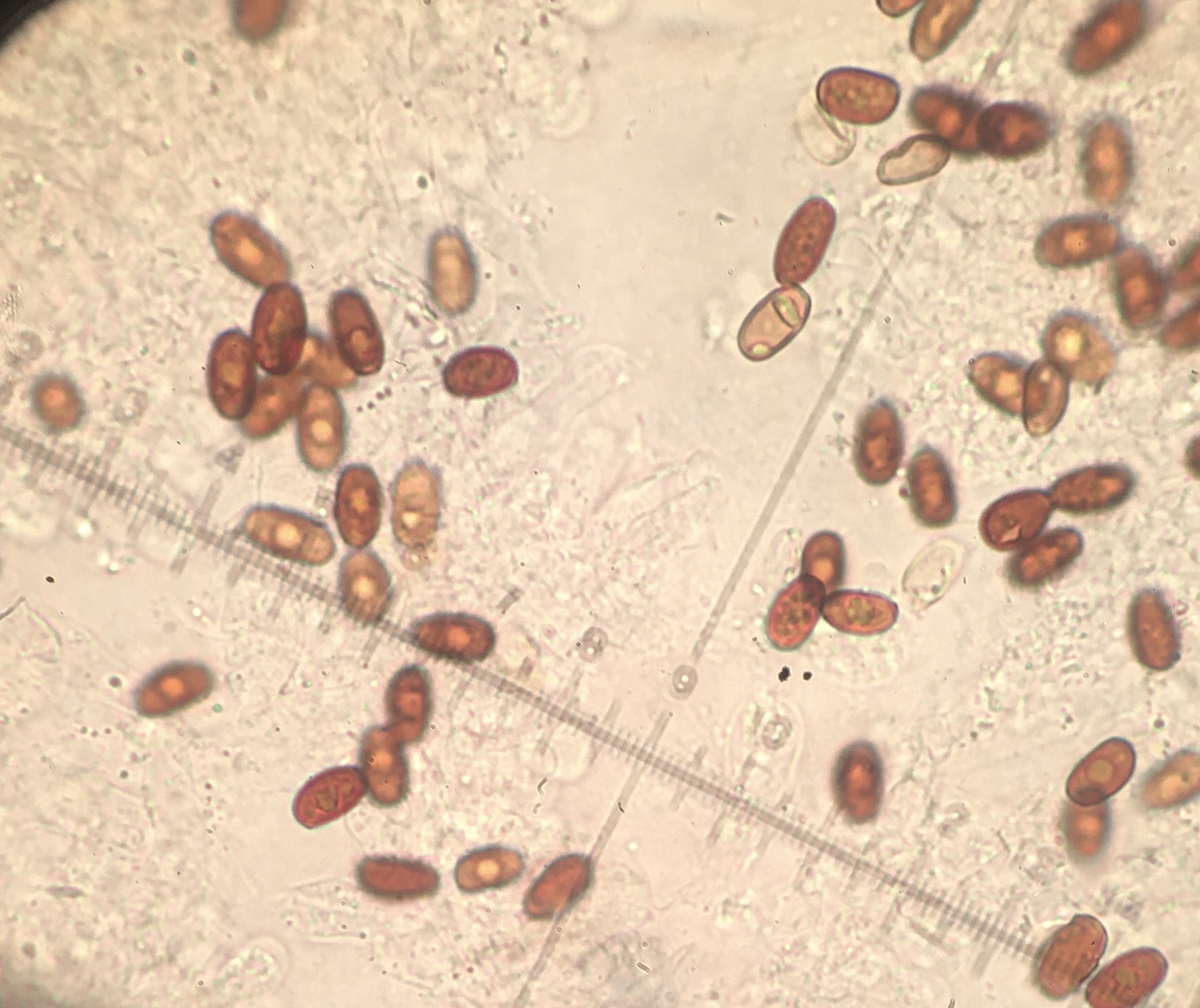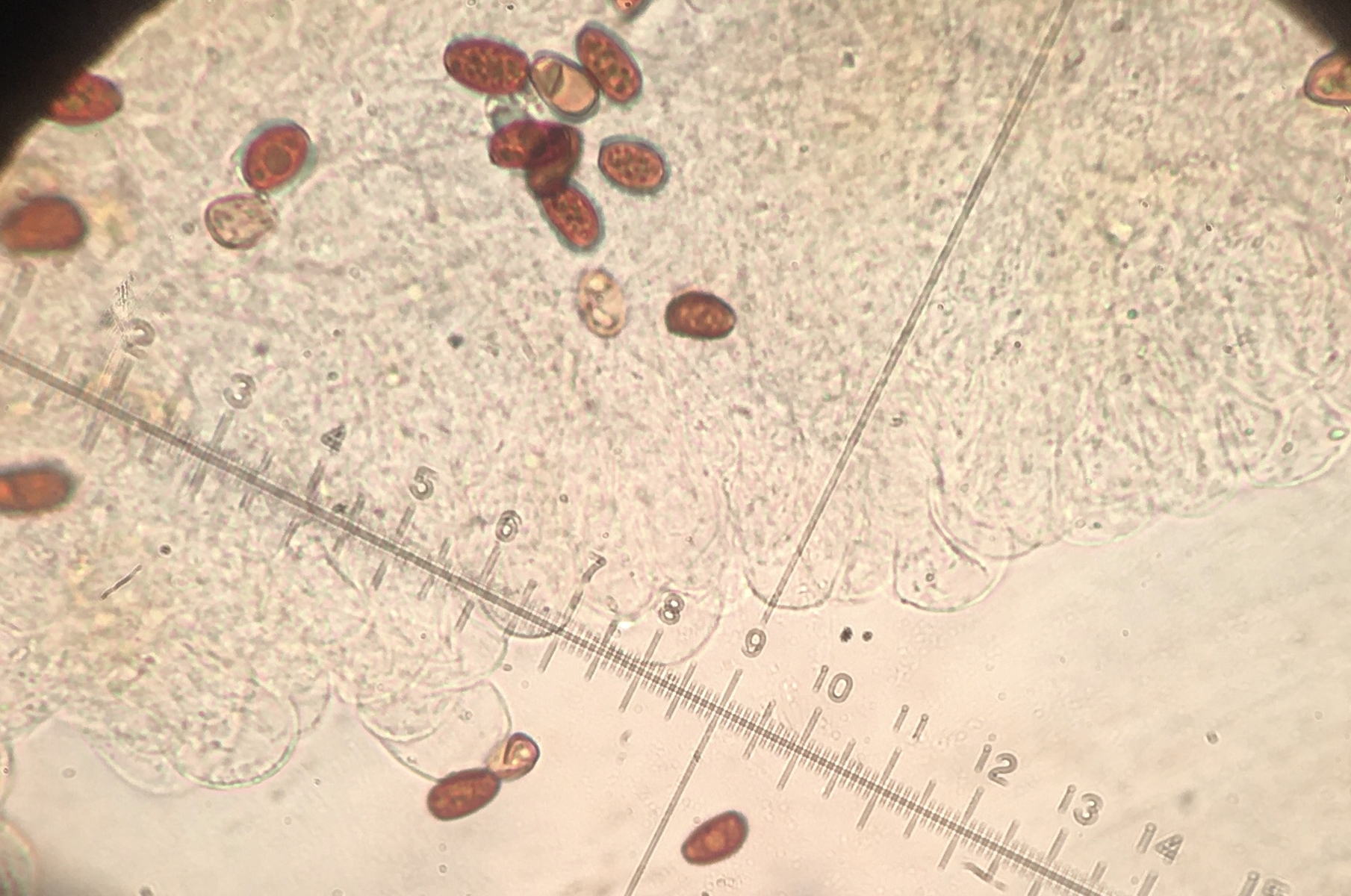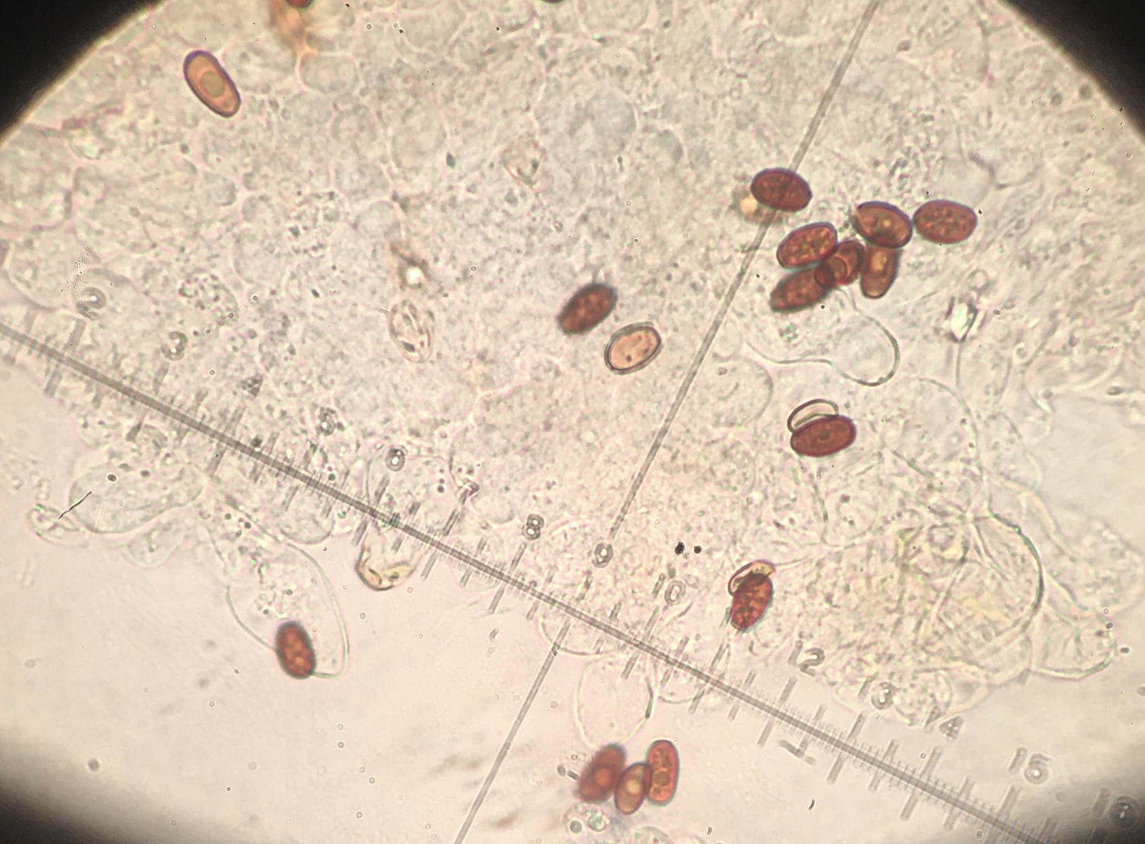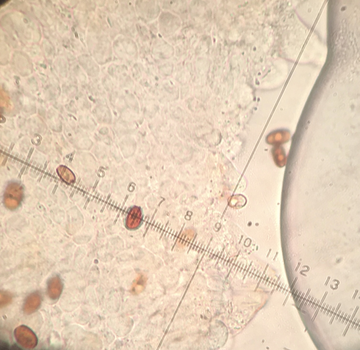 Die Sporenmaße sind 7,5 - 9 x 4 - 5, die Pleurozystiden messen ca. 50 x 18. Ich habe auch etwas, das ich für Velum am Hutrand gehalten habe, mikroskopiert, doch dabei könnte es sich auch um angeklebtes Papier gehandelt haben, denn es wirkt nicht wirklich pilzlich.