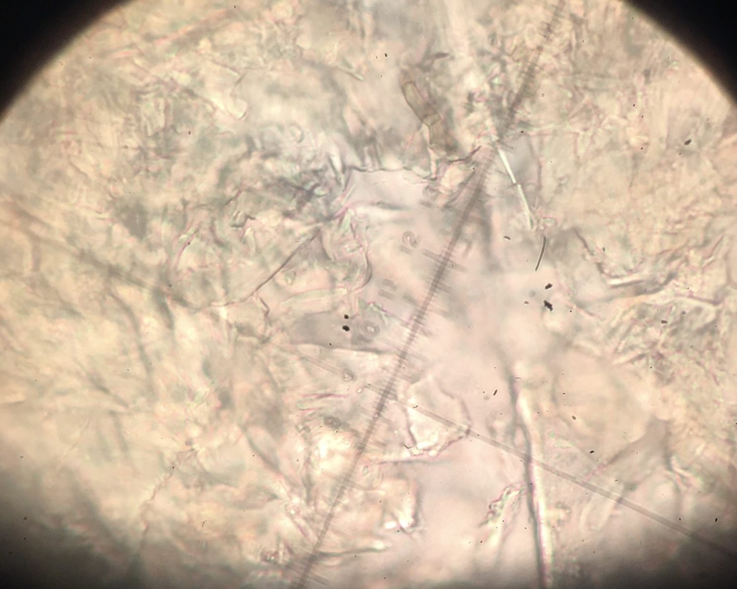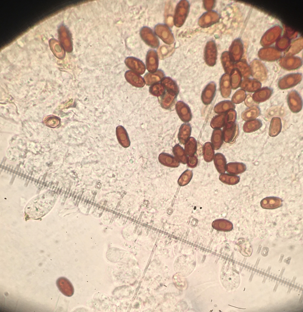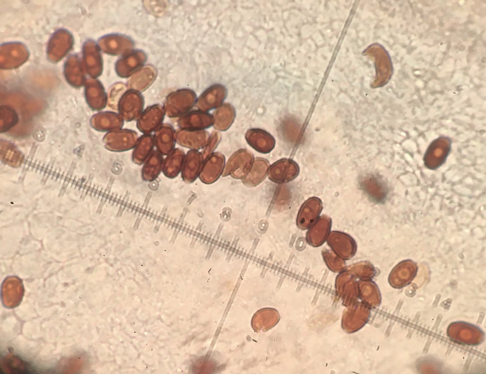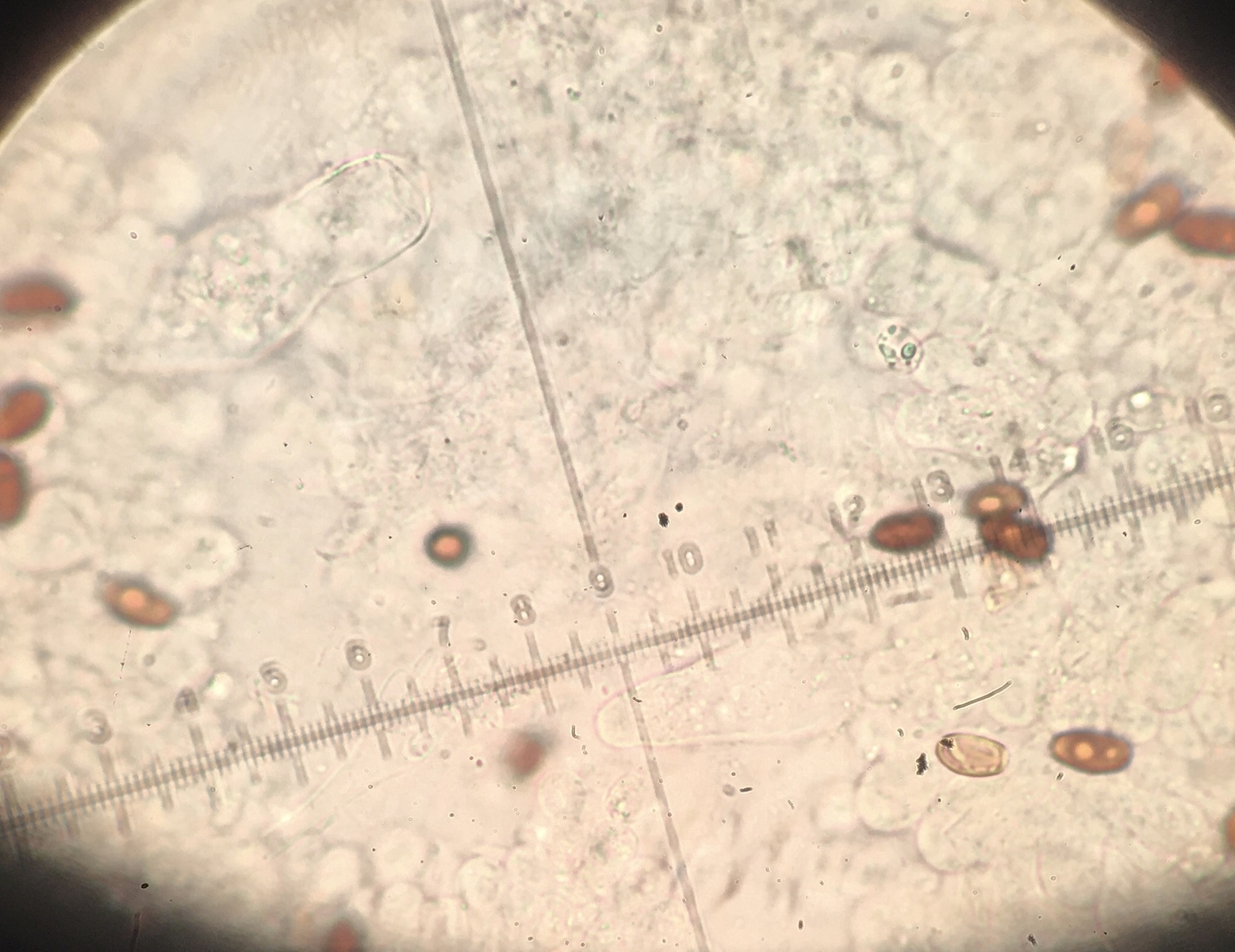 Die Sporenmaße sind 7,5 - 9 x 4 - 5, die Pleurozystiden messen ca. 50 x 18. Ich habe auch etwas, das ich für Velum am Hutrand gehalten habe, mikroskopiert, doch dabei könnte es sich auch um angeklebtes Papier gehandelt haben, denn es wirkt nicht wirklich pilzlich.