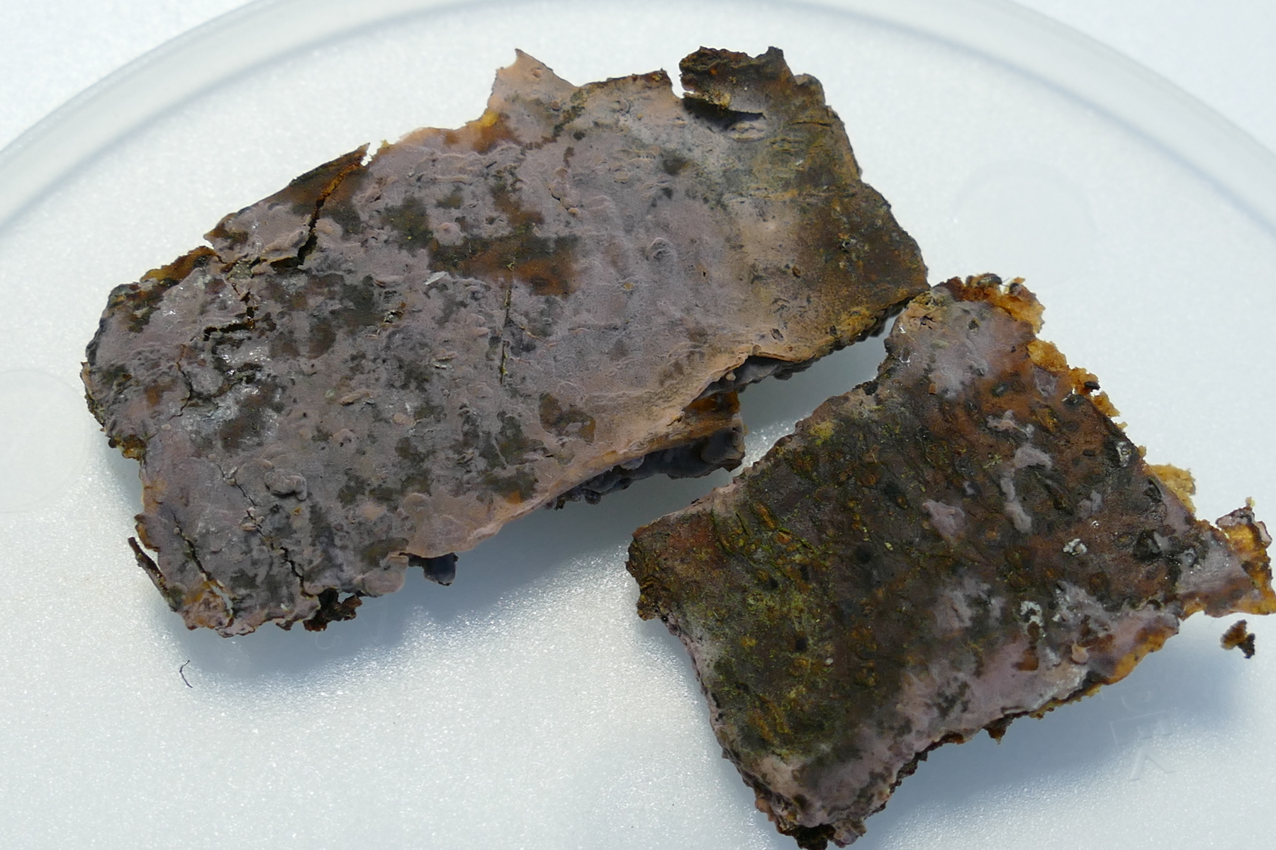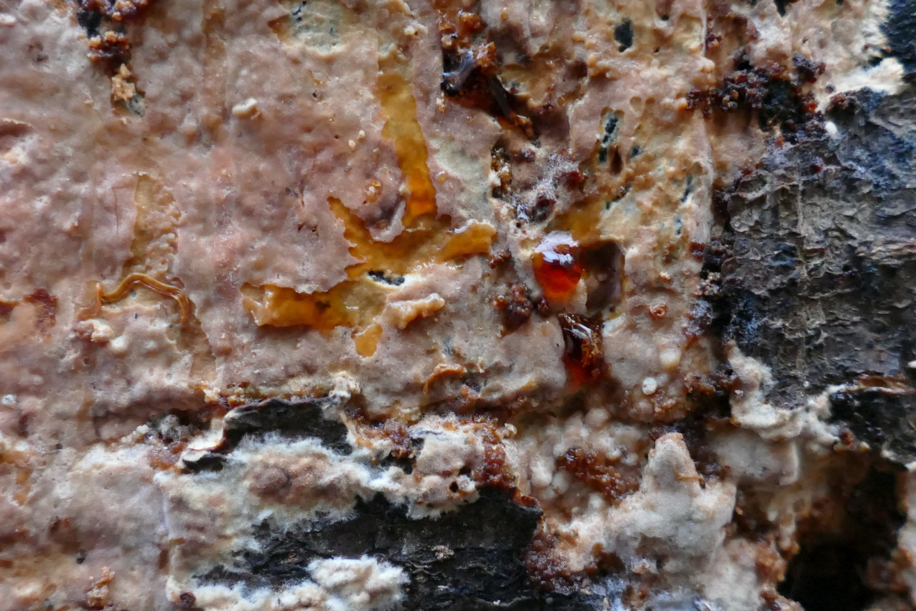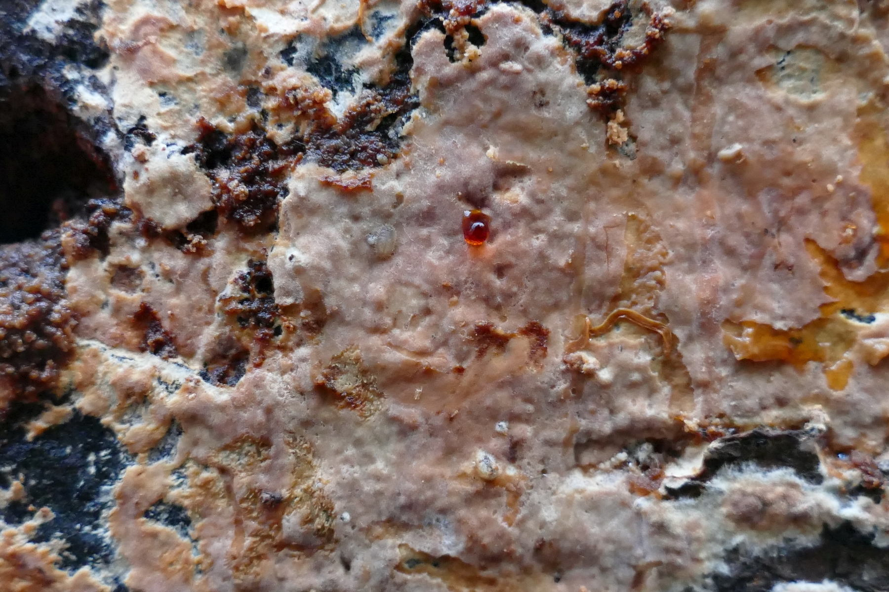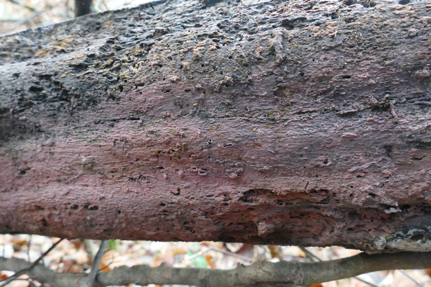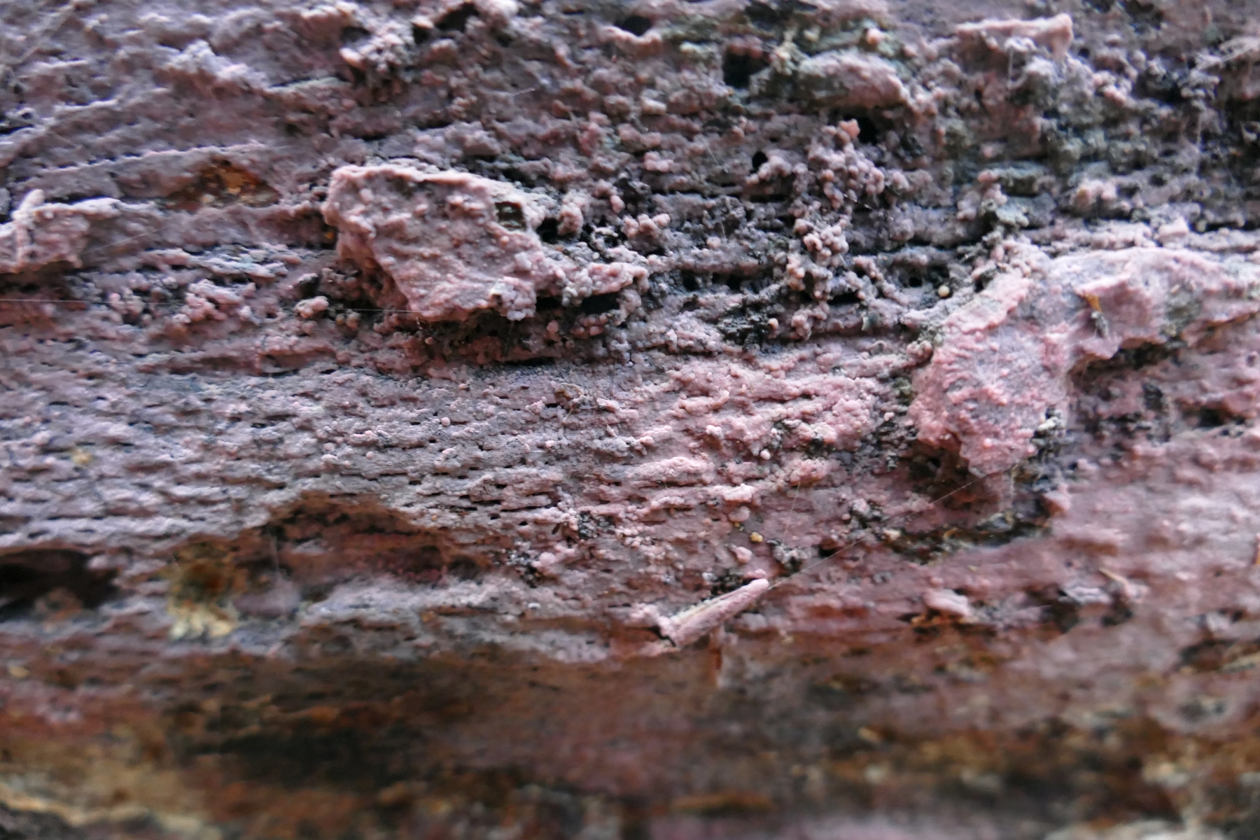 Zum Beispiel ein auffälliger, rosafarbener, resupinater Pilz mit glatter Oberfläche - stellenweise mit Knubbelchen in Bild 1a und 1b (Hyphoderma cf roseocremum?), ...