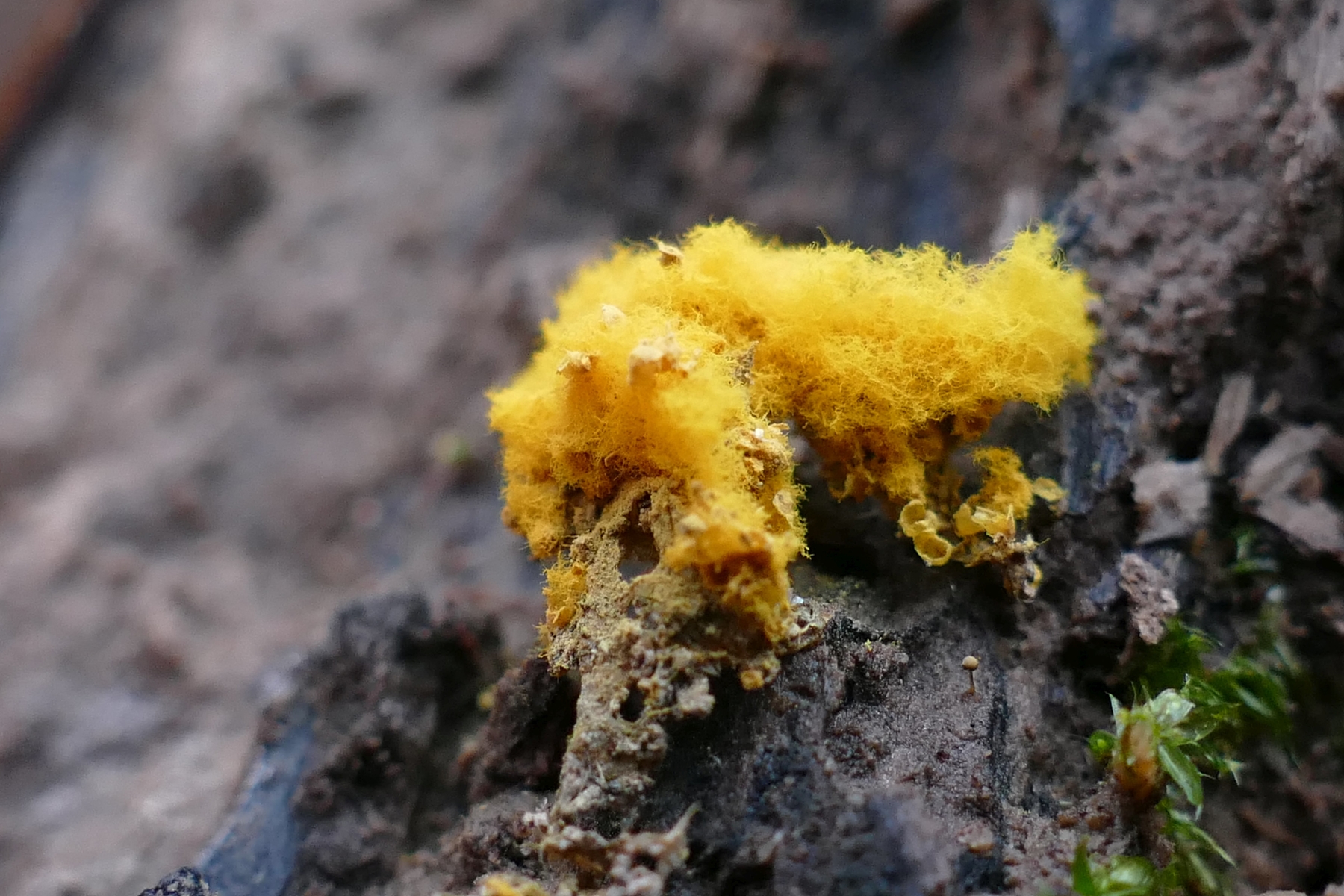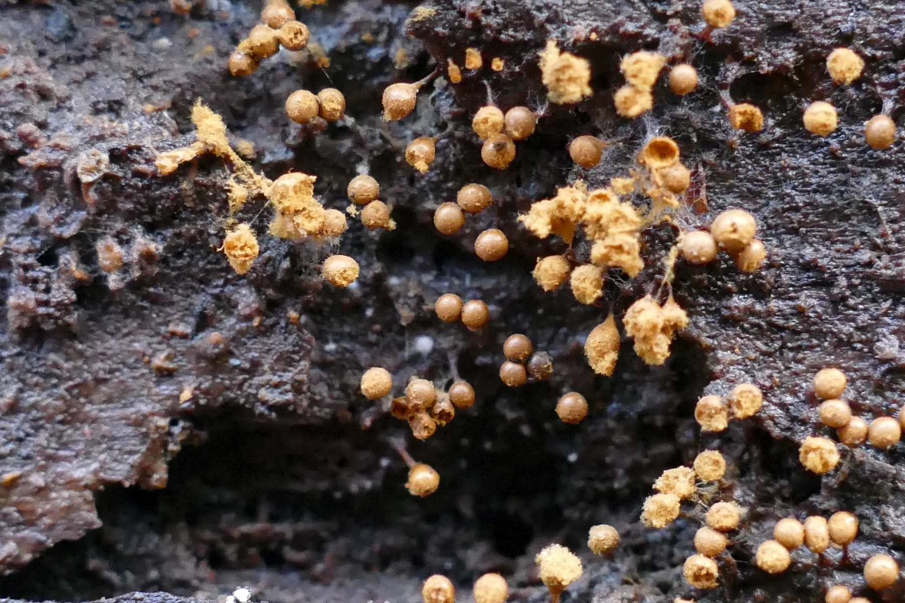 ... ausgesporten, goldgelben Winterschleimpilz-Fruktifikationen (Hemitrichia spec?), ...