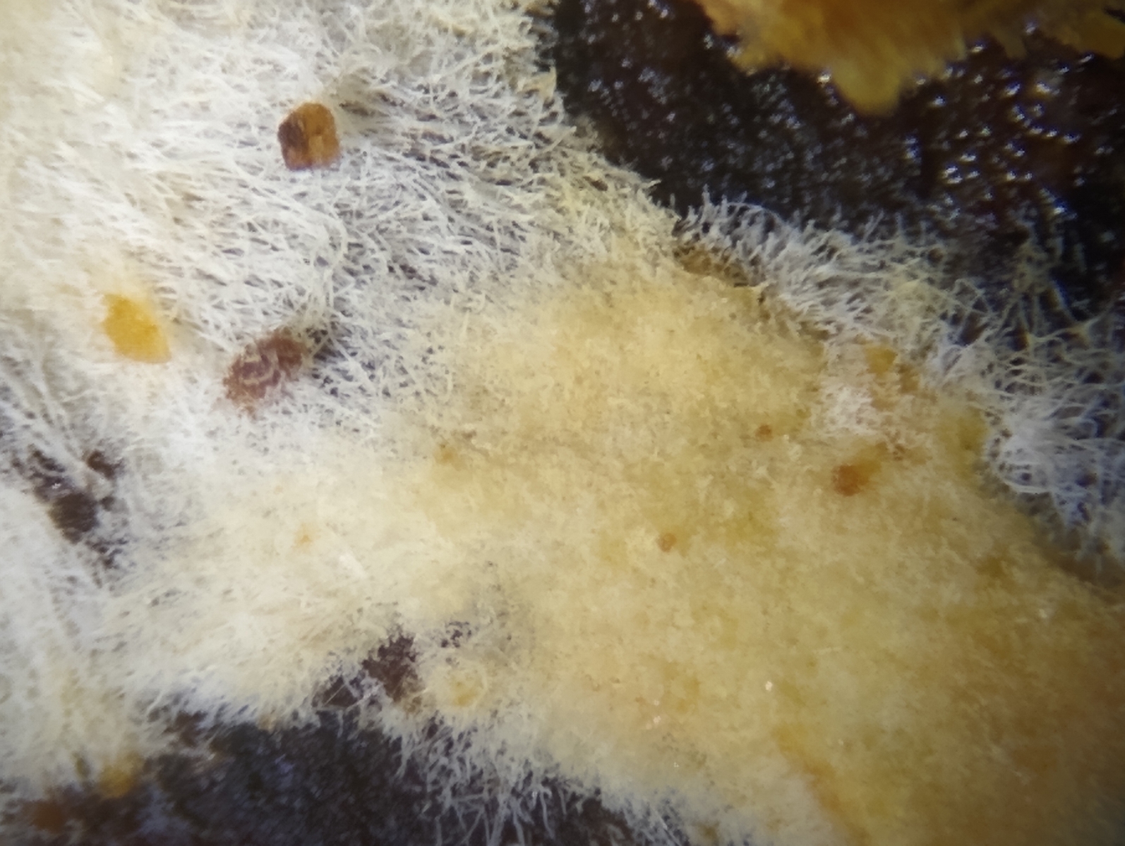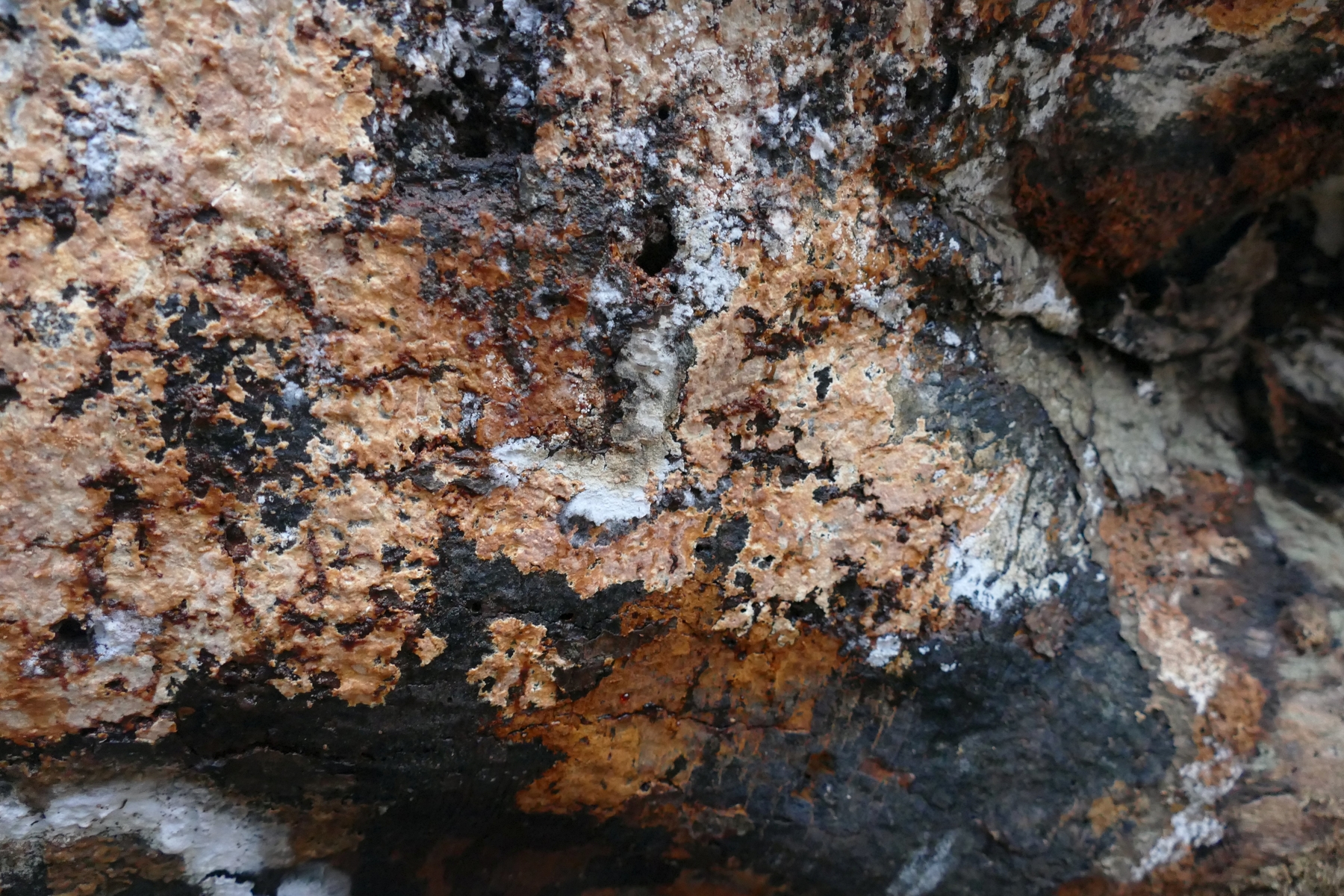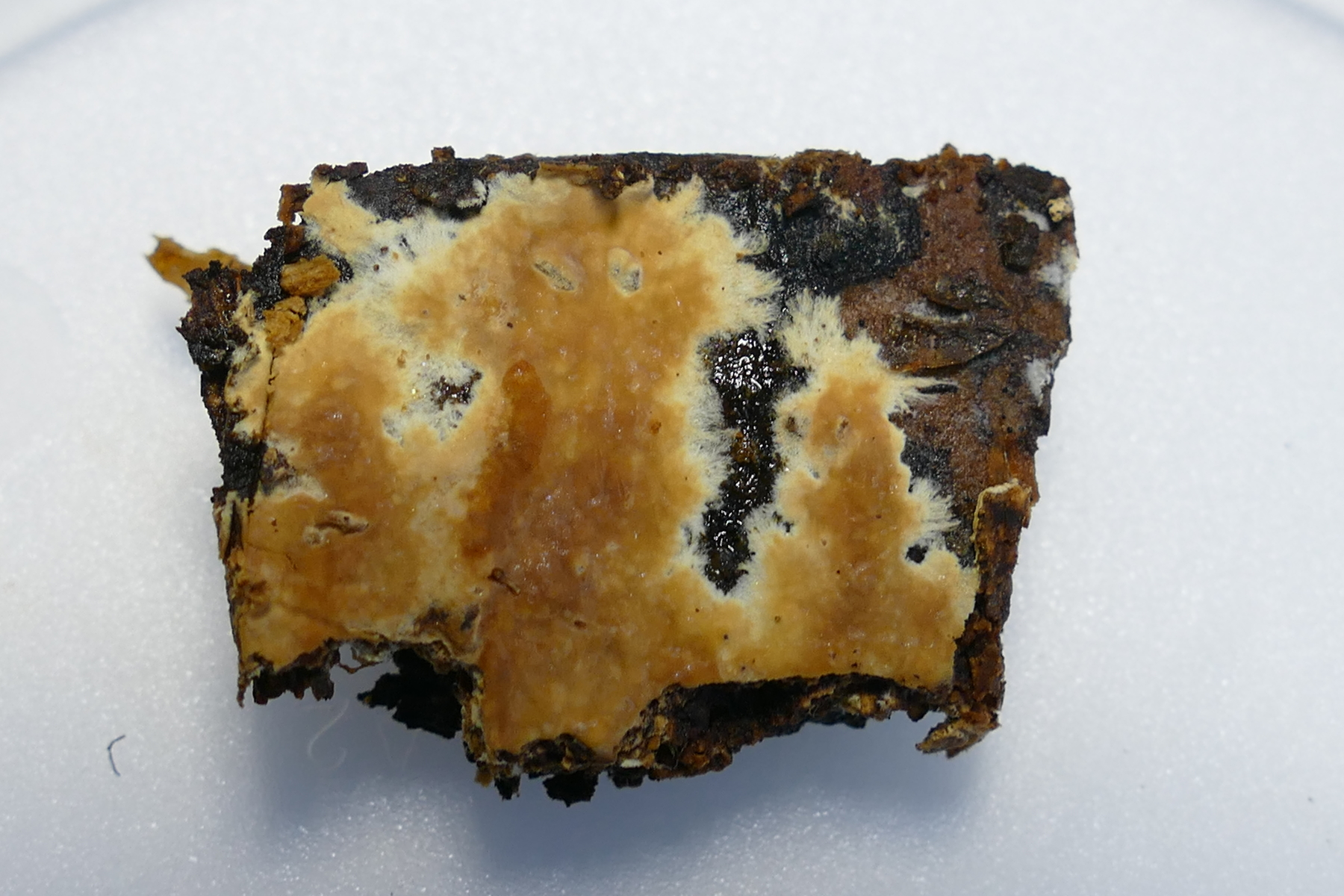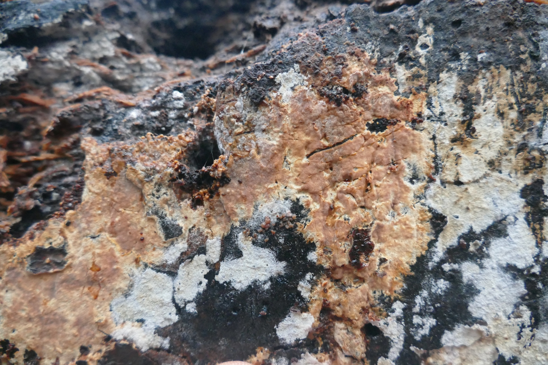 Ich bin mir nicht sicher, ob die weißen Flächen zum gleichen Pilz gehören, oder schon wieder zu einem anderen Pilz gehören.