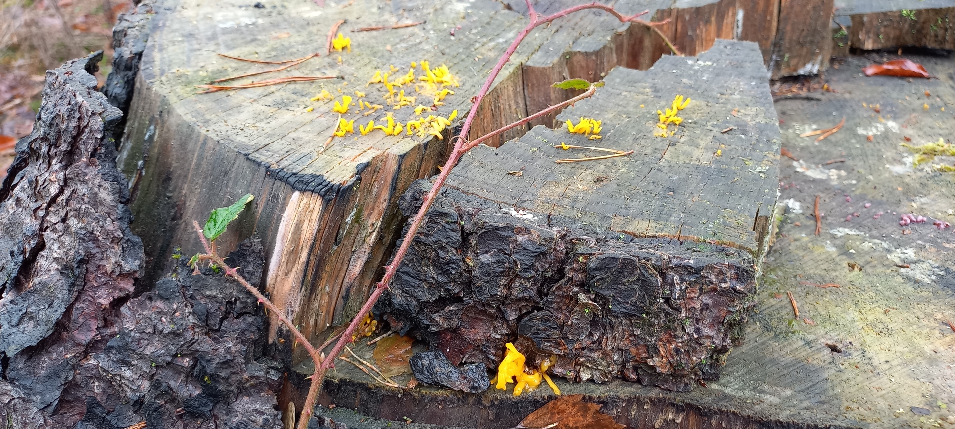 den klebrigen Hörnling (Calocera viscosa) würde ich nicht sehen, da die Fruchtkörper Flächig auftreten und eher klein daher kommen.
