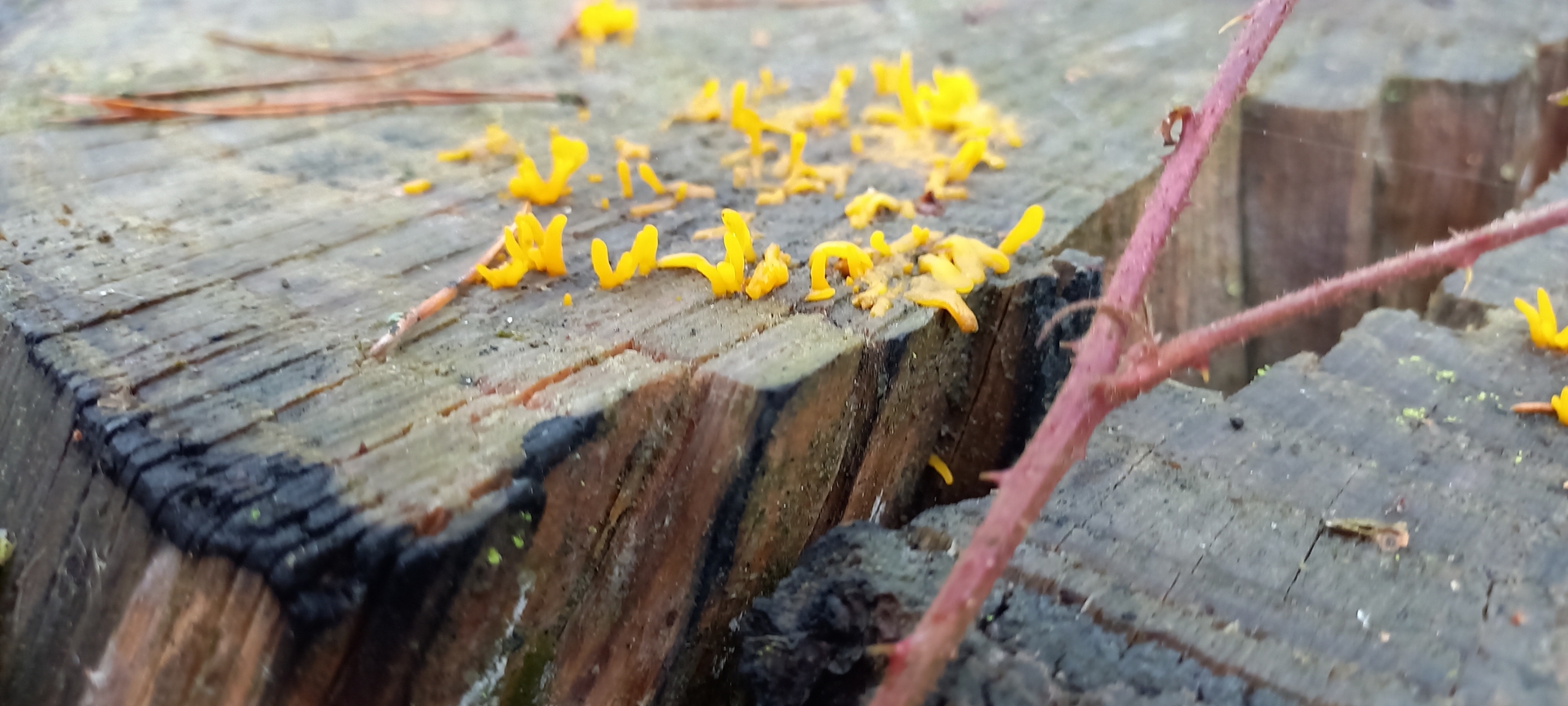 Zu 2): Da ist das Substrat nun Nadelholz. Kiefer, würde ich vermuten. Damit ist das nicht Calocera cornea, sondern voraussichtlich Calocera furcata (Gegabelter Hörnling).