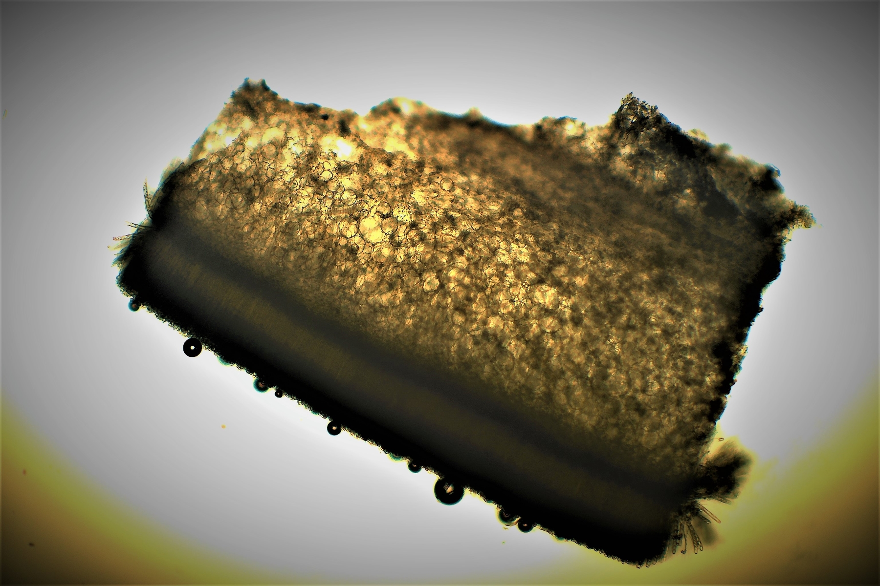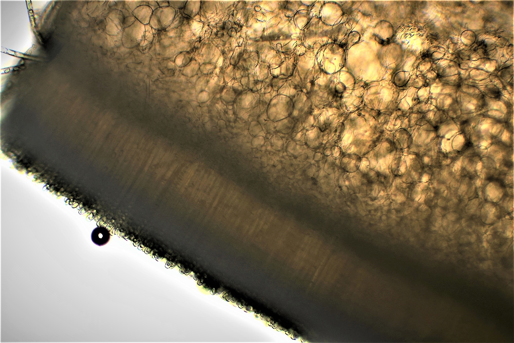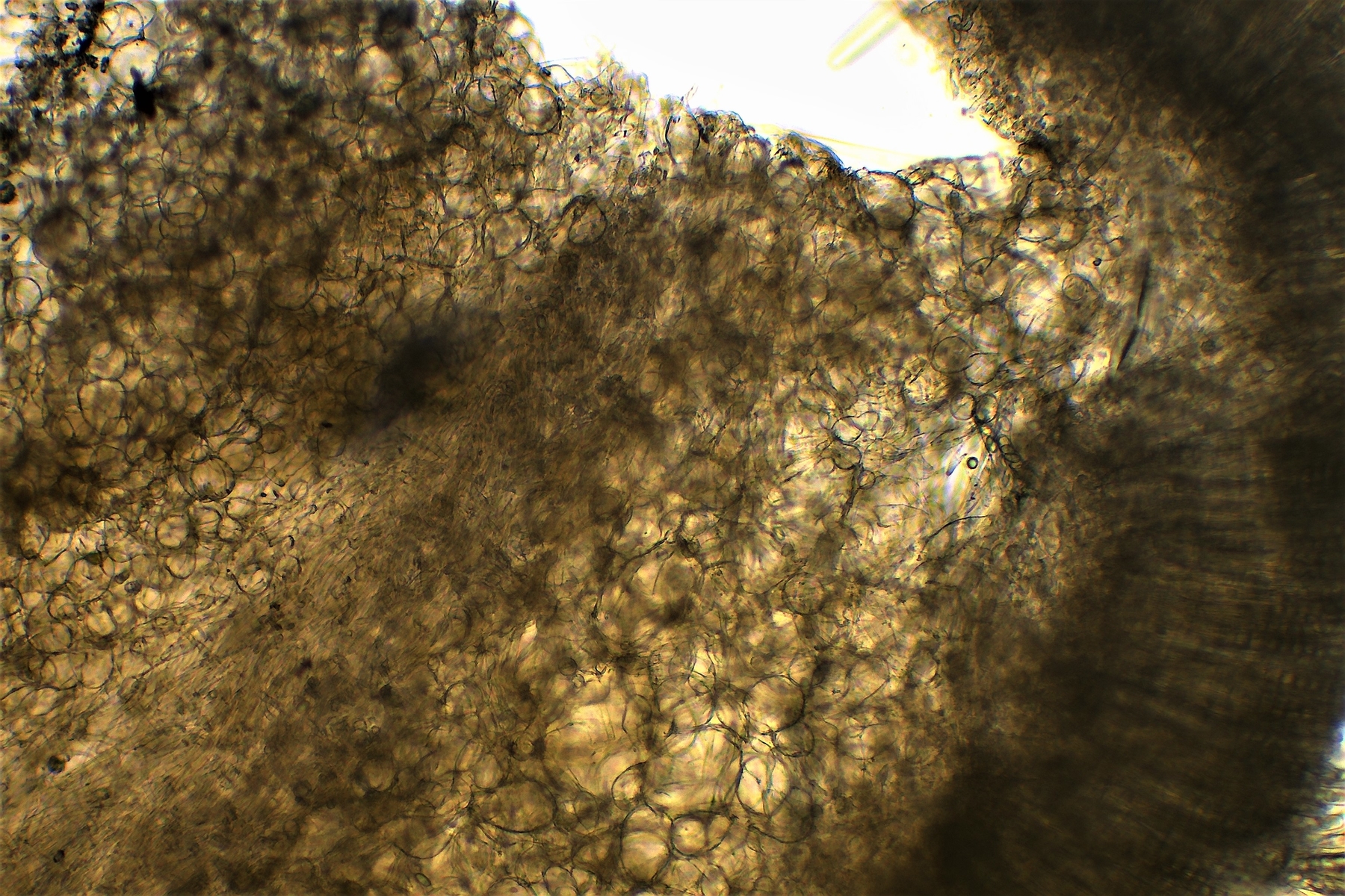 ich hatte gestern noch einmal einen frischen ausgereiften Fruchtkörper vom Standort entnommen und einen feineren Schnitt hinbekommen. Man sieht jetzt schön deutlich das doch eine Textura intricata in der Mitte enthalten ist. Somit ist Peziza granulosa vom Tisch. Auf dem ersten Bild vom Fundort erkennt man das die Stelle etwas erhöht ist, vielleicht stand dort früher ein Baum der gefällt wurde und den kurzen Stumpf hat man mit Erde bedeckt, Bodendecker darüber angepflanzt und mit Häcksel bestreut . Mit der Zeit ist dieser dann stark verrottet. Mit der neuen Erkenntnis landet man jetzt im Schlüssel bei Peziza micropus und das dieser mittlerweile dem "Varia-Komplex" zugeordnet wird laut Jörg. Die Fruchtkörper sollen meist stielartig an der Basis zusammengezogen sein. Durch die klebrige Erde darum konnte man das nicht gut sehen. Auf die Idee diese abzuwaschen bin ich nicht gekommen. Die Sporen würden passen und die Äußere Fruchtschicht darf auch granuliert sein und die Größe der Becherlinge. Für den Zellkern habe ich noch einmal in Melzer mikroskopiert.