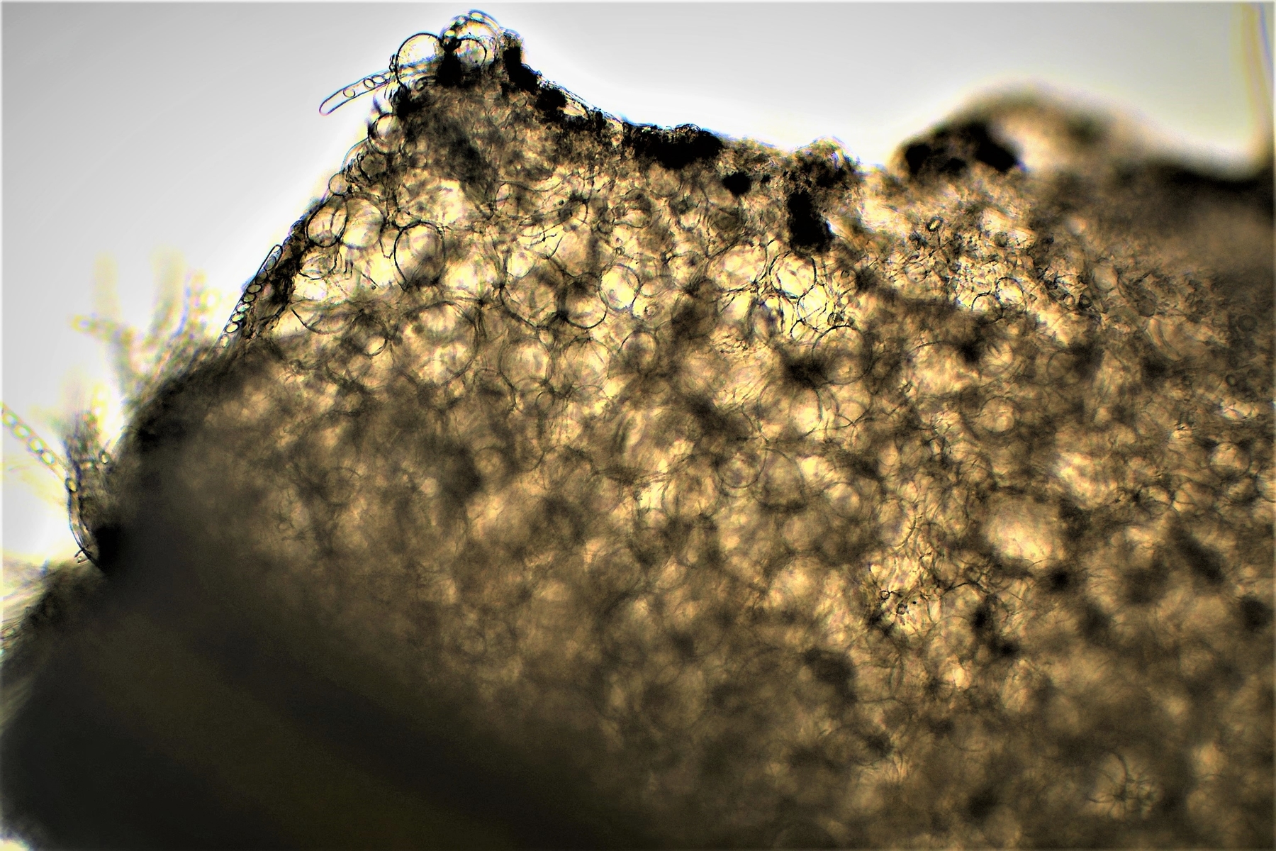ein spanischer Mykologe Miguel Ángel Ribes Ripoll hat eine ausgearbeitete Dokumentation PEZIZA aff. granulosa im Internet, daran hatte ich mich etwas orientiert. Seine Fruchtkörper waren 7 cm im Durchmesser und meinen recht ähnlich. Vielleicht kennt jemand diesen Mann und seine Arbeit und kann etwas dazu sagen, das wäre toll. Die Becherlinge wuchsen auch direkt auf der Erde, diese klebten auch recht dick am unteren Ende. Mit dem Zellkern hatte ich auch überlegt ob das hier auch der Fall ist. Ich kann mich noch im Frühjahr an die Anemonenbecherlinge - Dumontinia tuberosa erinnern. Diese hatten auch Zellkerne die man in Melzer Reagenz dann deutlich sehen konnte und für die Bestimmung dort wichtig waren. Das könnte ich noch nach mikroskopieren.